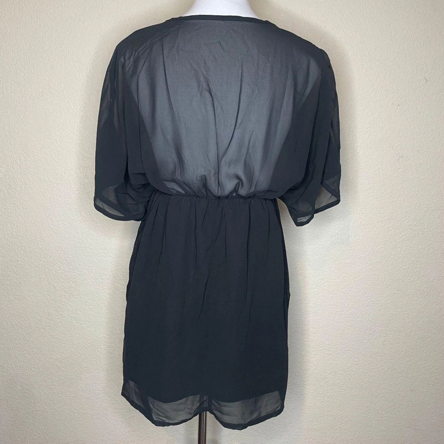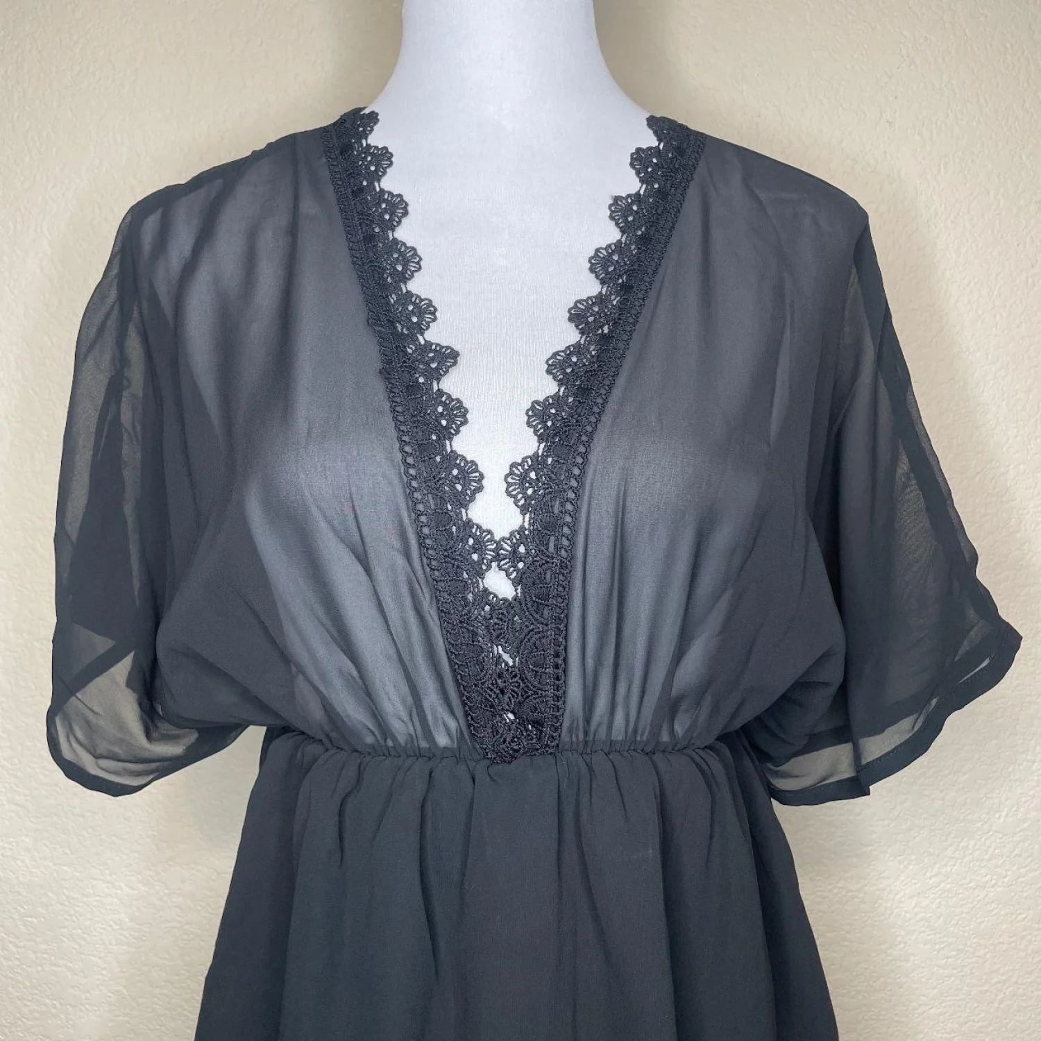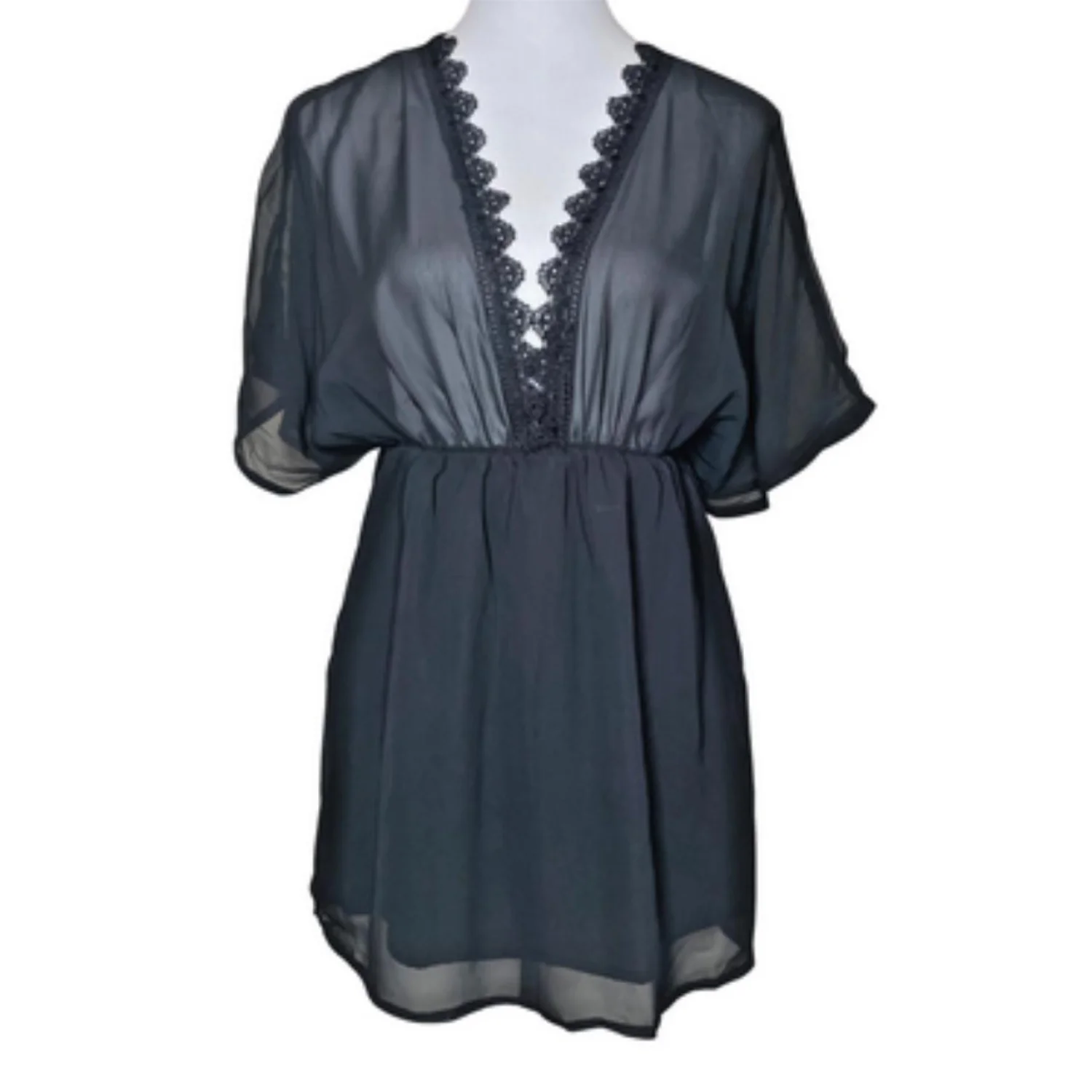 Offers Welcomed🎉 Features: A stunning and versatile black sheer mini dress, tunic, or beach cover-up. It features a plunging deep V-neckline adorned with beautiful black crochet/eyelash lace trim. The sheer chiffon-like fabric gives it a light, airy feel, perfect for layering. It has short, relaxed batwing/kimono sleeves and an elasticated, cinched waist that creates a flattering blouson bodice. The short skirt is fully lined for modesty (the bodice remains sheer) • Style Profile: Goth, Gothic, Alt, Alternative, Dark Academia, Dark Aesthetic, Grunge, Cottagecore, Dark Cottagecore, Romantic, Sexy, Femme, Festival, Boho, Bohemian, Vacay, Vacation, Resort Wear, Beach, Swim, Y2K, Fairycore, Soft Grunge • Flaws: No Holes, stains, or tears • All measurements are approximate PTP: 16.5' Length: 29.5' Happy to answer your questions! Super Fast Shipper!
