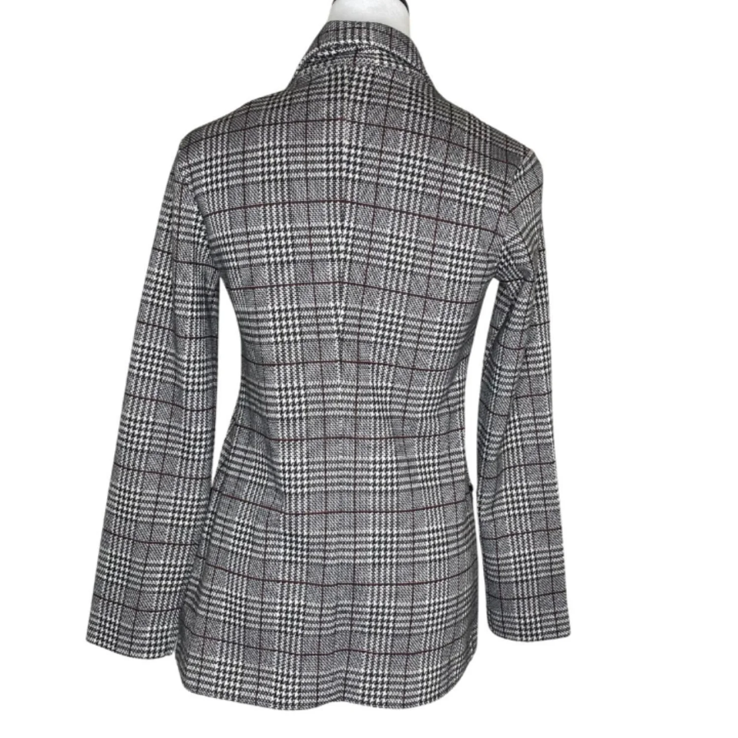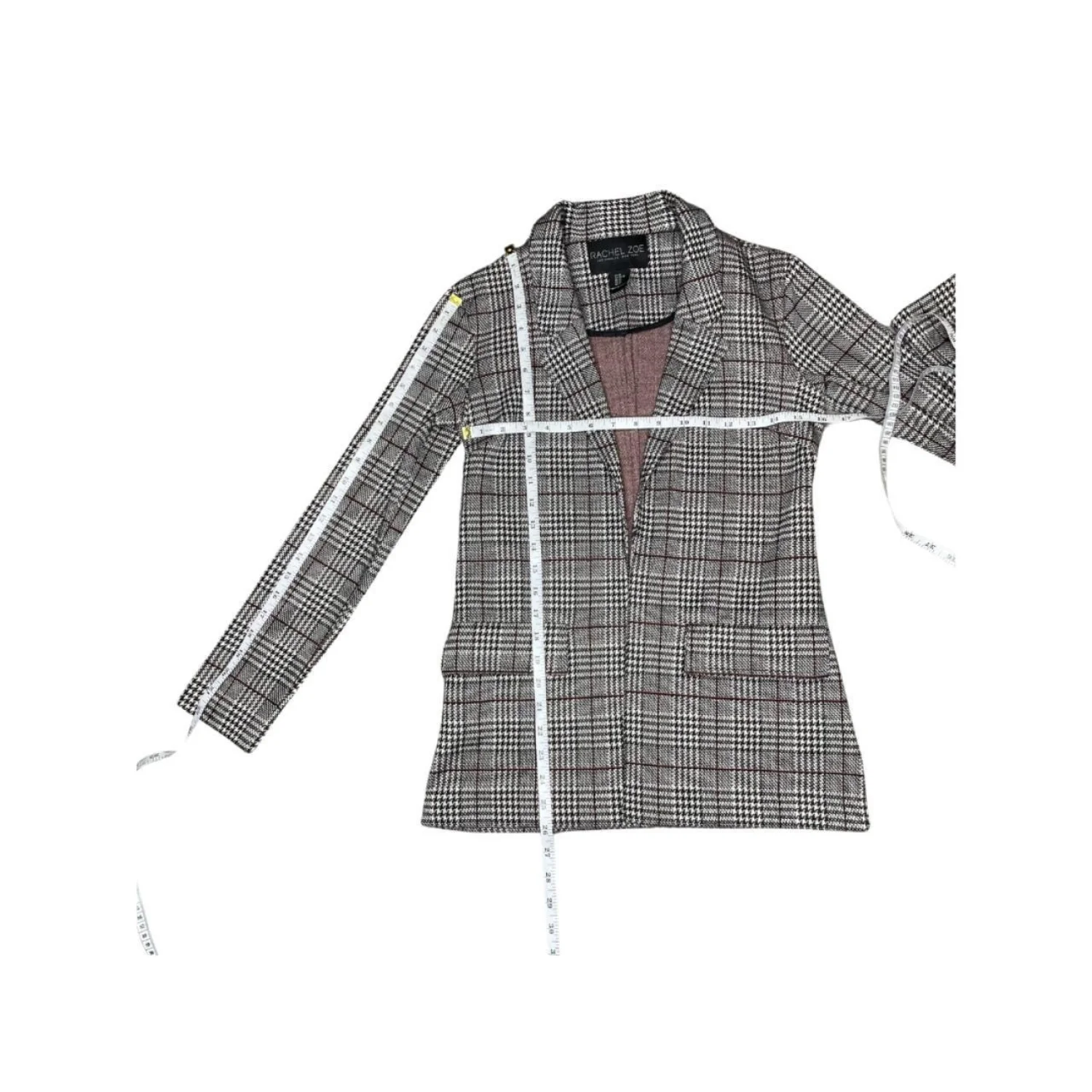 Rachel Zoe XS Glen Plaid Open Front Blazer Grey Pink Houndstooth Features: a timeless grey and black glen plaid pattern with a delicate pink/burgundy accent, this jacket offers a polished silhouette without the bulk. • Style Profile: Light Academia, Dark Academia, Officecore, Corporate Chic, Preppy, Minimalist, Quiet Luxury, Coquette, Classic, Timeless, Professional, Career Wear • Flaws: No Holes, stains, or tears • Please see photos for measurements (in inches). PTP: 16' Length: 26' Sleeve Length: 22' • Happy to answer your questions! Super Fast Shipper!