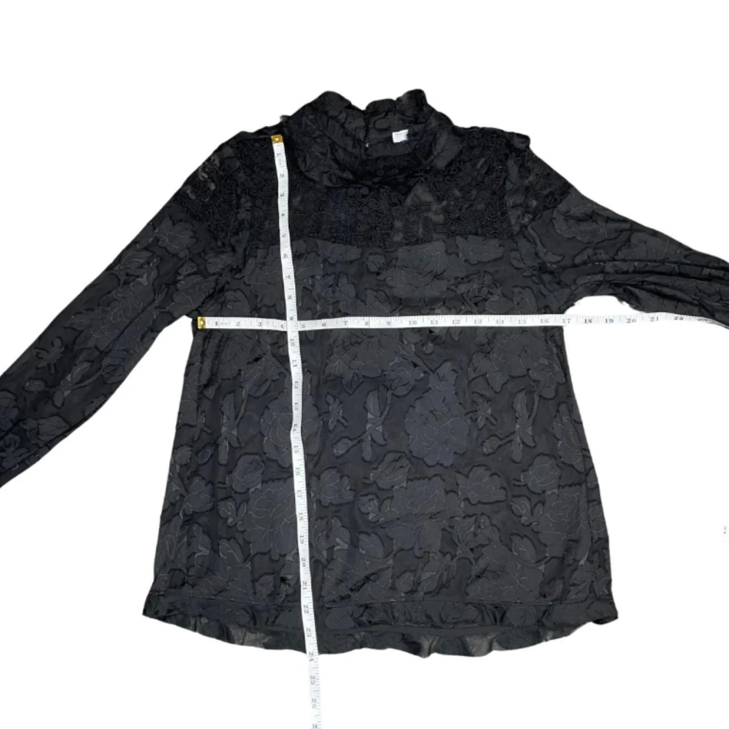 Rhapsodielle Women's Floral Lace Ruffled Mock Neck Coquette Dark Academia Size Medium Features: • Style Profile: Dark Cottagecore, Dark Fairy, Feminine, Grunge, Whimsigoth • Flaws: No Holes, stains, or tears • Please see photos for measurements (in inches). PTP: 17' Length: 24' Sleeve Length: 24' • Happy to answer your questions! Super Fast Shipper!