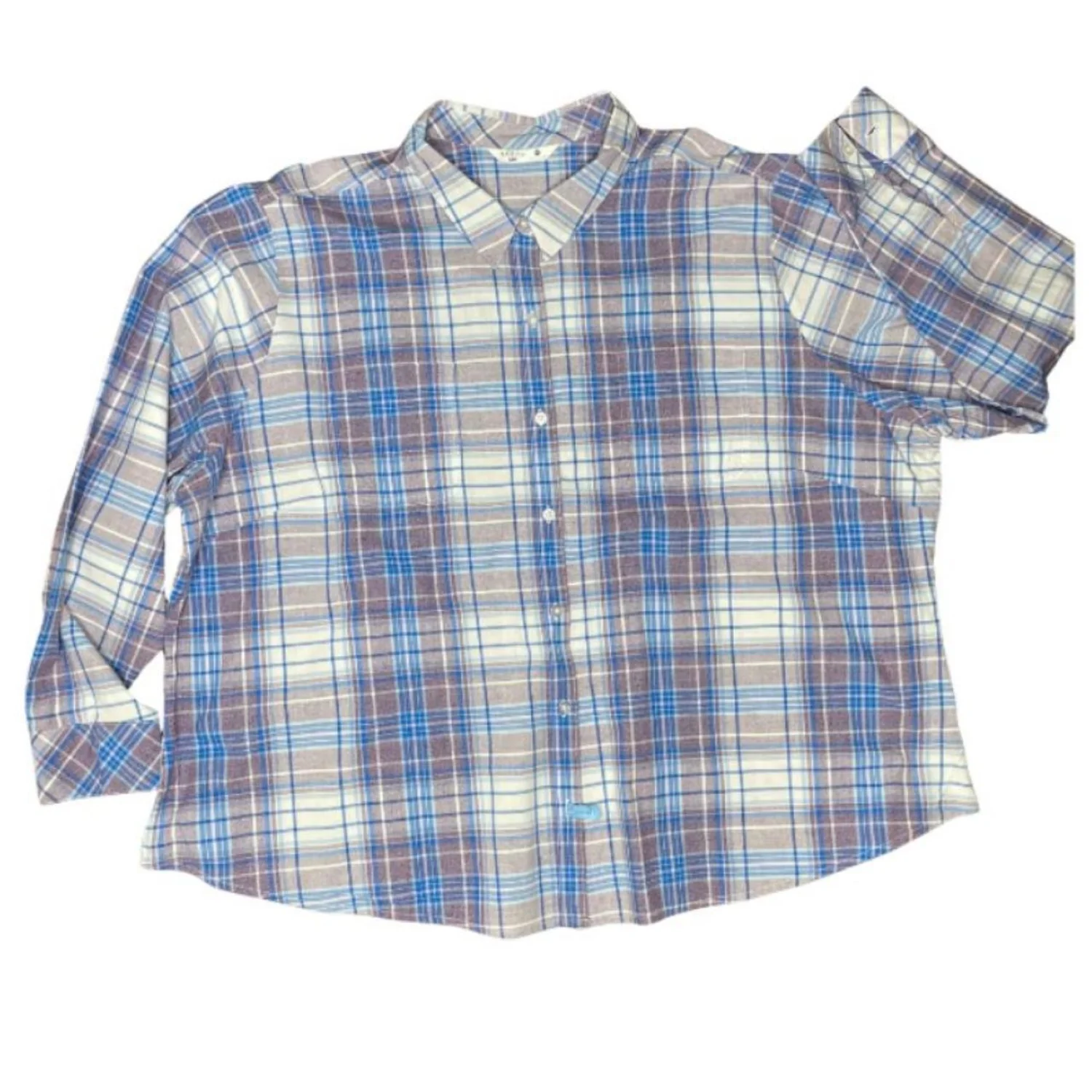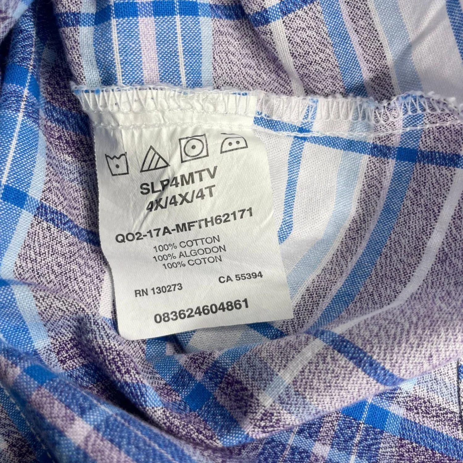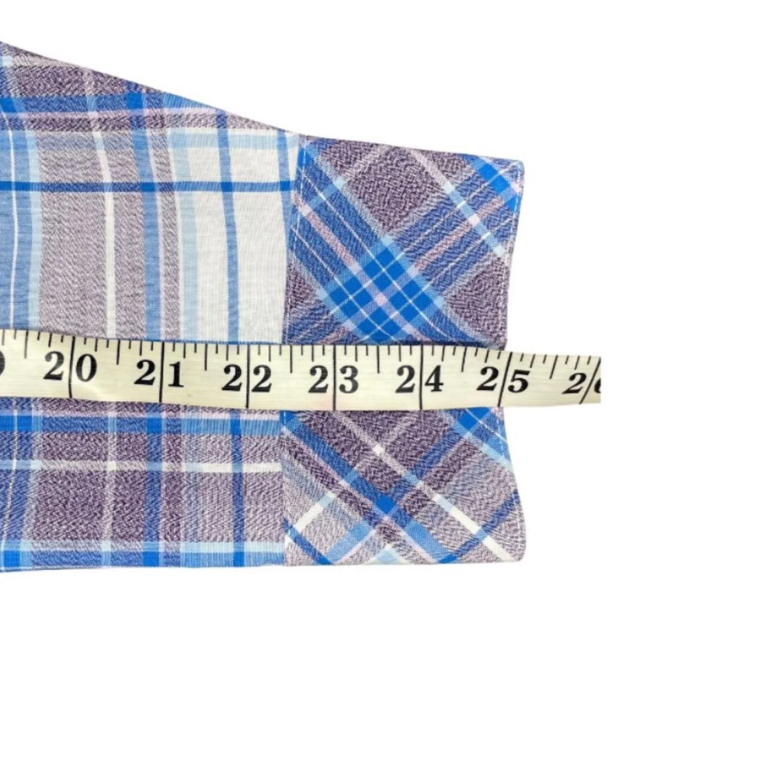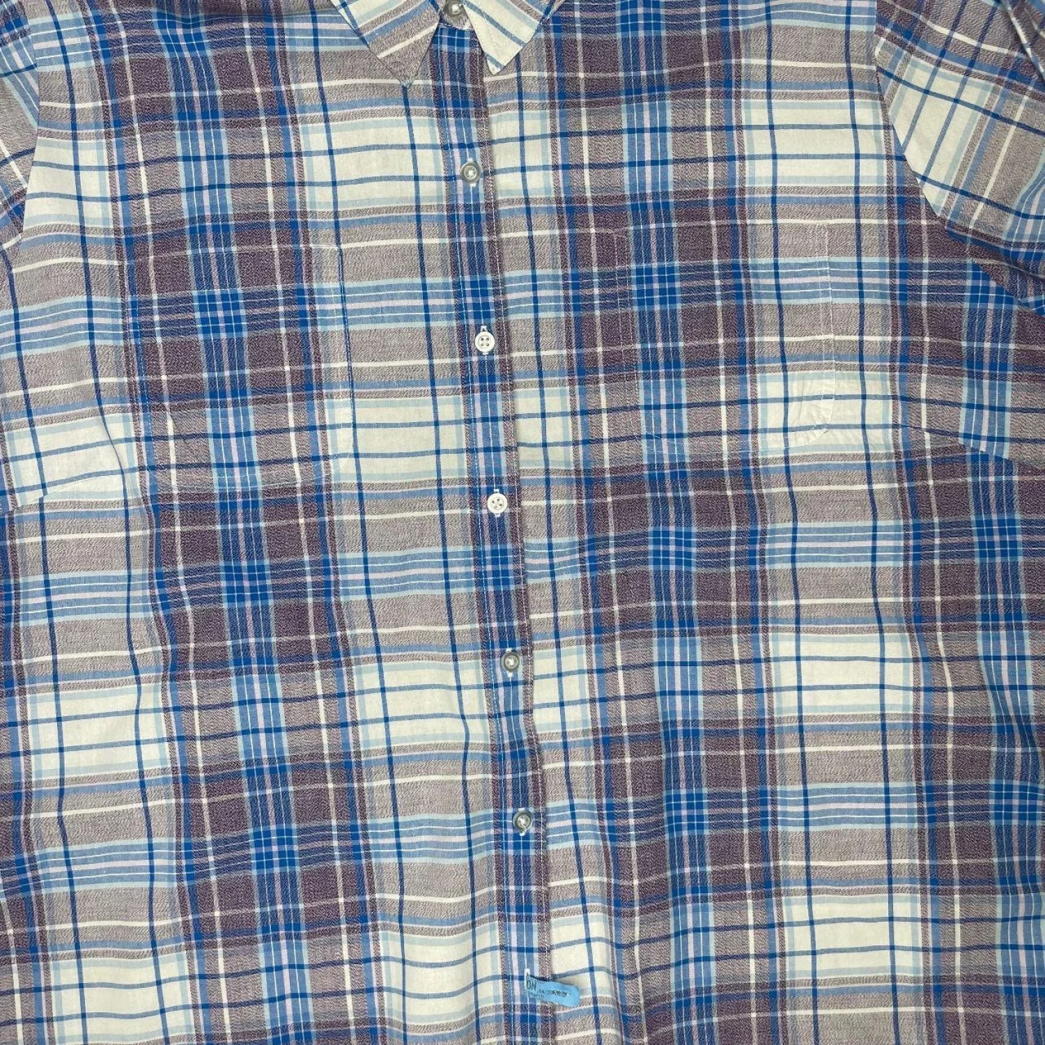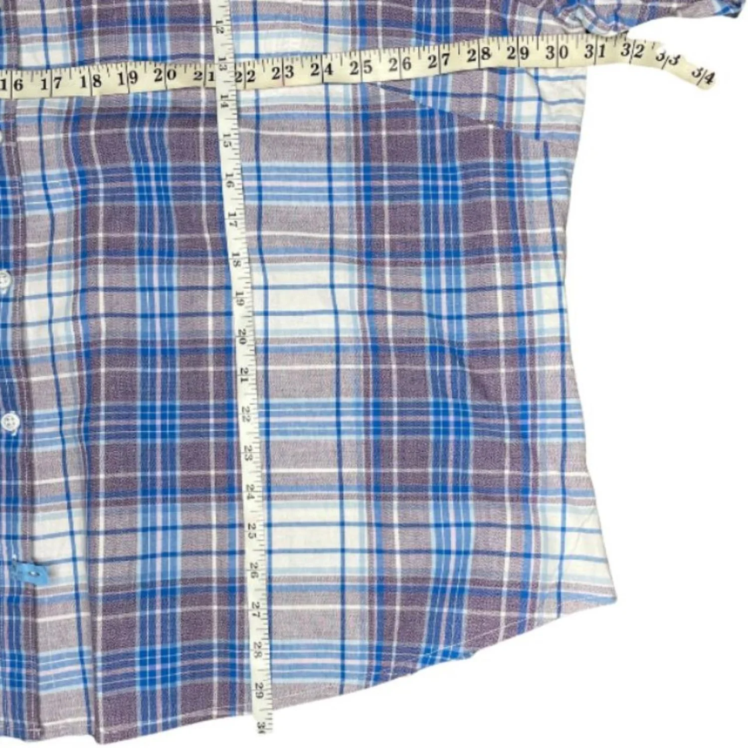 Riders by Lee Blue Plaid Button Down Shirt 4X Big & Tall Gorpcore Western Features: This Riders by Lee button-down is cut from heavyweight cotton with a wide, boxy fit that doesn’t cling. It features reinforced stitching, a structured point collar, and a single utility chest pocket. The ocean-blue and white plaid gives off a rugged, outdoorsy grit without looking like a costume. • Style Profile: Gorpcore, Western, Big and Tall, Outdoors, 100% Cotton, Plaid, Rugged, Layering, Cabin Core, Workwear • Flaws: No Holes, stains, or tears • Please see the photos for measurements (in inches). PTP: 31' Length: 29.5' Sleeve Length: 25' Happy to answer your questions! Super Fast Shipper!