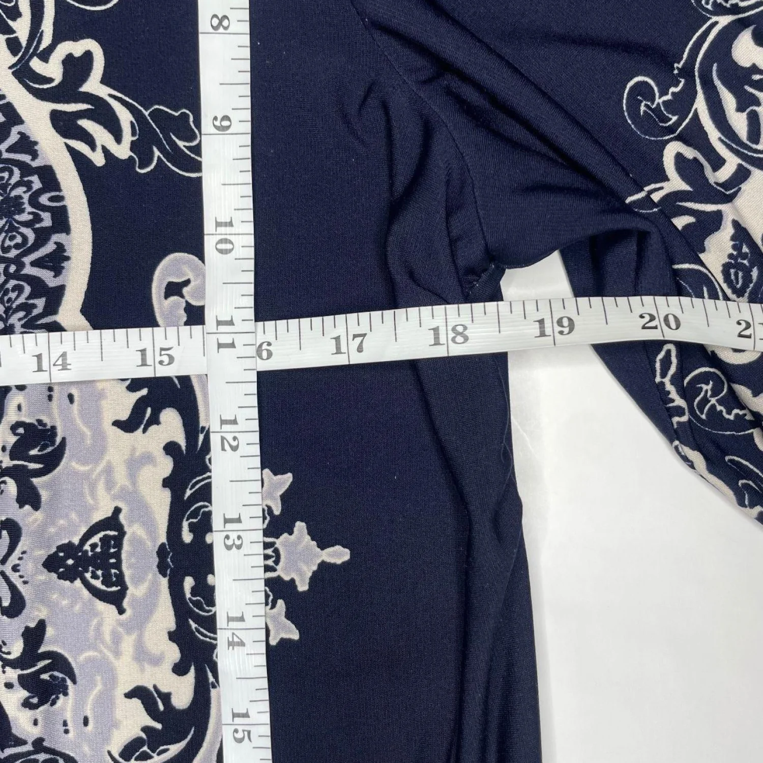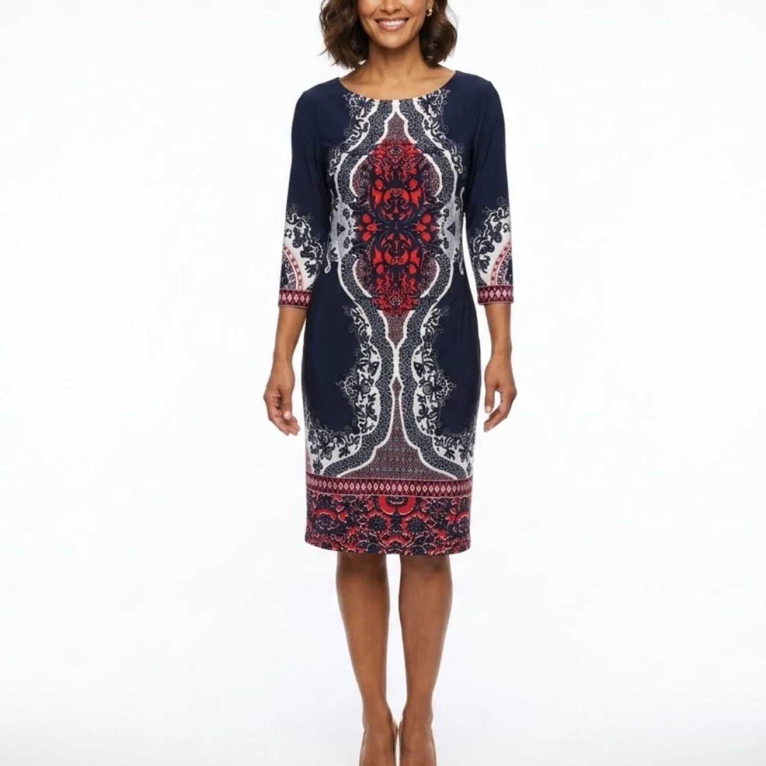 Sandra Darren Women's Paisley Print 3/4 Sleeve Mixed Print Shift Dress Size 14 Features: Baroque-inspired paisley print meets a sharp, tailored silhouette. Features 3/4 sleeves and a clean boat neckline. The double-knit polyester-spandex blend offers a firm, structured drape that doesn't lose its shape. Bold navy, red, and white medallion pattern is mirrored for a slimming optical effect. • Style Profile: Boho, Baroque, Medallion, Sheath, Career, Modest, Geometric, Paisley, Preppy, Retro • Flaws: No Holes, stains, or tears • Please see the photos for measurements (in inches). PTP: 18.5' Length: 39' Happy to answer your questions! Super Fast Shipper! Bundle items for discounts!