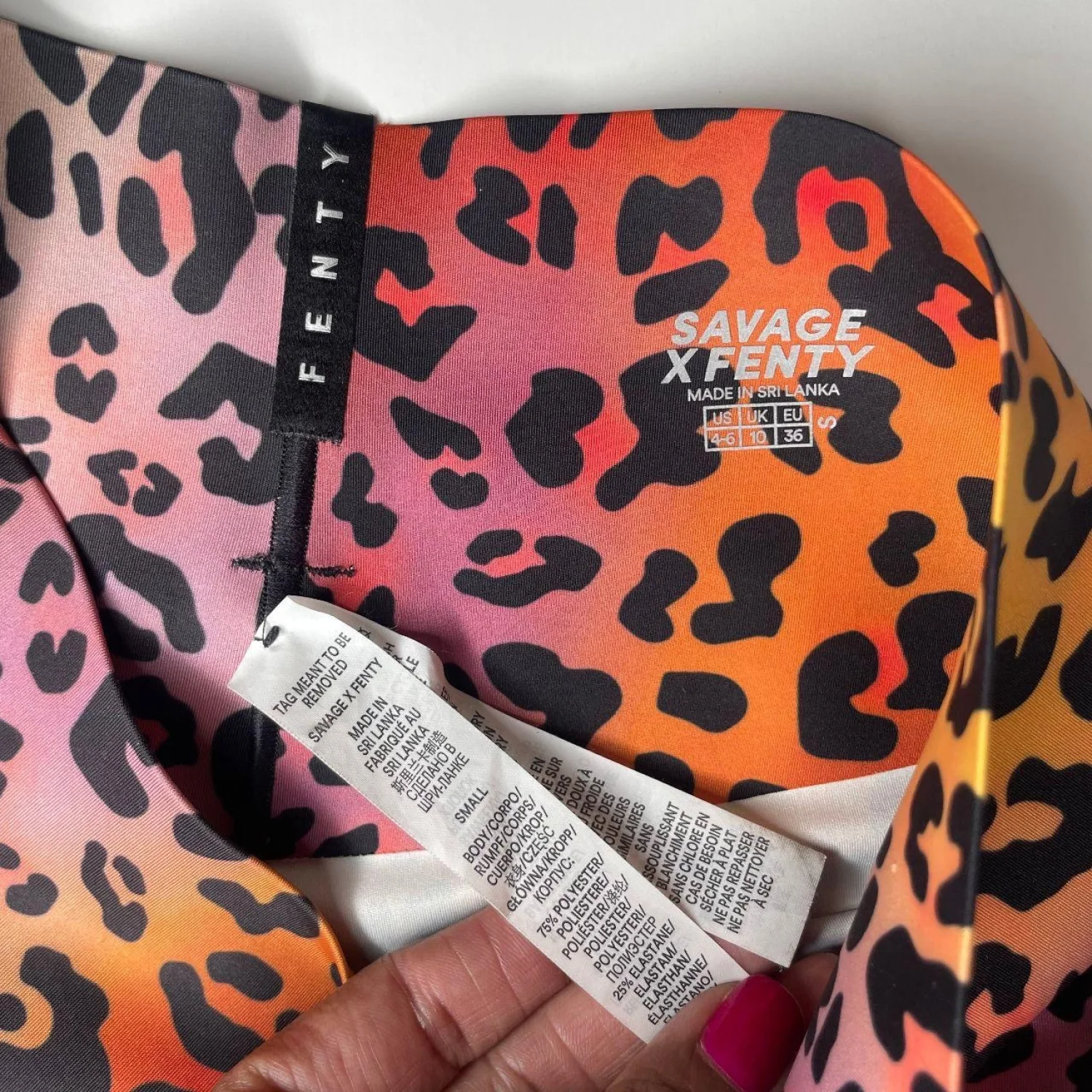 Savage X Fenty Rainbow Leopard Leggings NWOT Features: Level up your activewear with these vibrant Savage X Fenty high-waisted leggings. Featuring a stunning multicolored gradient (orange, purple, and red) over a bold leopard print. These are incredibly stretchy and soft with a signature "Savage X" logo detail at the back waist. • Style Profile: Y2K, maximalist, streetwear, dopamine dressing, athleisure, animal print, ombre, vibrant, festival wear, gym aesthetic, baddie, clubwear, 90s style, colorful, Rihanna, bold, funky, workout, lounge • Flaws: No Holes, stains, or tears (Excellent pre-owned condition) • All measurements are approximate Waist: 12.5" Length: 37.5" Happy to answer your questions! Super Fast Shipper!