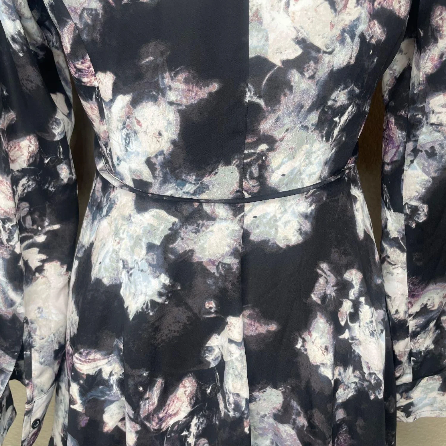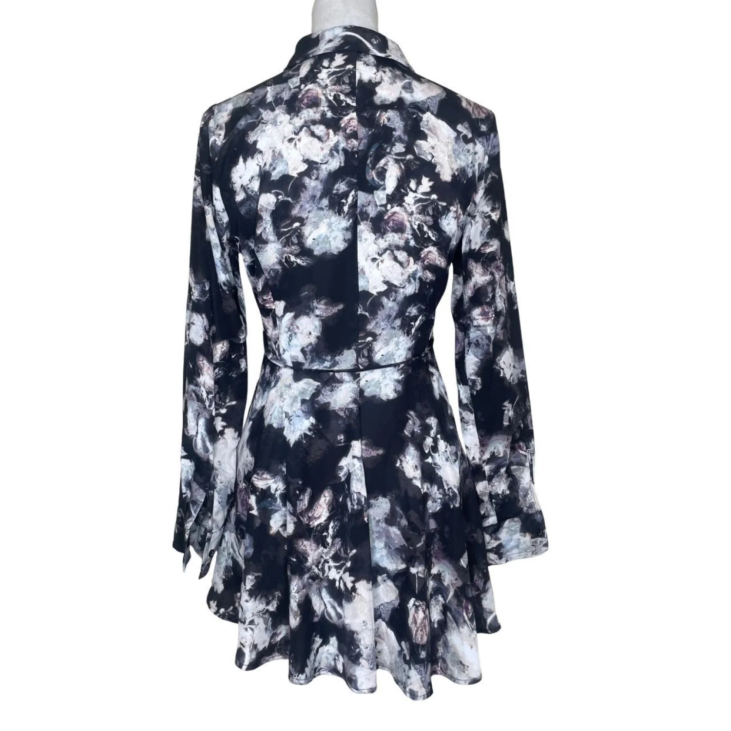 Simply Vera Vera Wang Goth Floral Button Down Tunic Shirt Small NWOT Features: Grim, moody, and perfectly structured. This Simply Vera Vera Wang button-down hits that Whimsigoth meets Dark Romantic sweet spot. Features a sharp collar and a fit-and-flare silhouette that cinches with a thin integrated waist tie. The dark floral print looks like a bruised garden—deep purples and greys against a black base. Finished with roll-tab sleeves for a more utilitarian look. Lightweight but maintains a crisp shape. • Style Profile: Whimsigoth, Dark Romantic, Moody Floral, Gothcore, Dark Academia, Victorian Goth, Soft Goth, Grunge Sleaze, Tunic, Roll Tab • Flaws: No Holes, stains, or tears • Please see the photos for measurements (in inches). PTP: 17.5' Length: 25-29' Sleeve Length: 22' Happy to answer your questions! Super Fast Shipper!