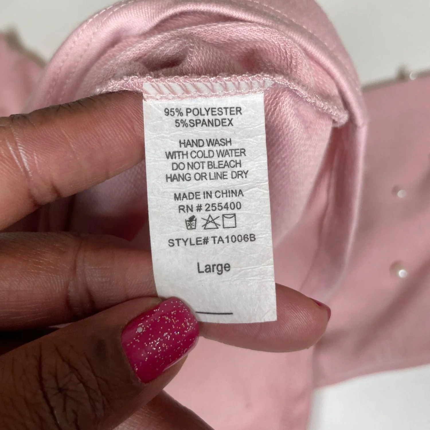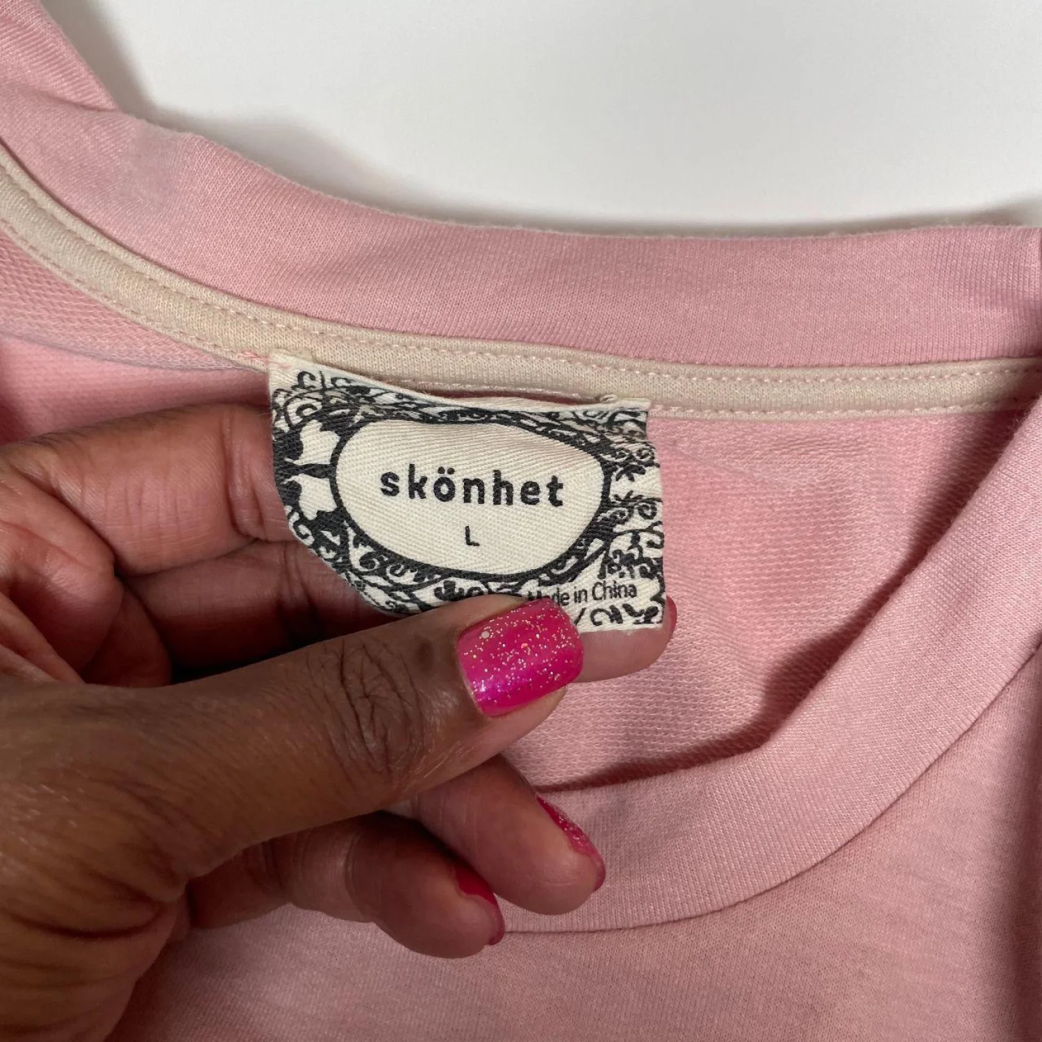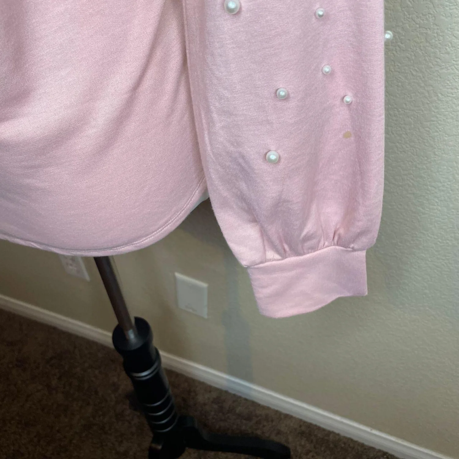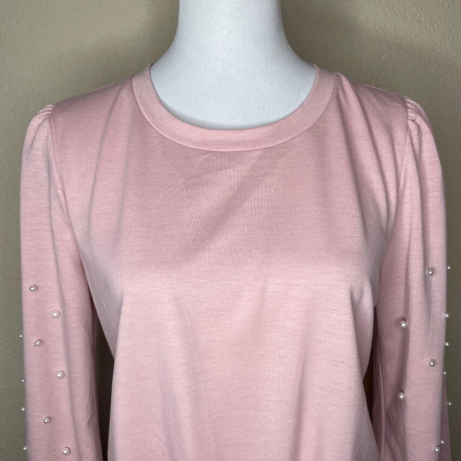 Skönhet Pink Pearl Embellished Puff Long Sleeve Tie-Front Top - Size Large Features: This feminine piece features elegant faux pearl embellishments scattered along the sleeves and a trendy adjustable tie-front hem. Designed with a comfortable crew neck and a lightweight, stretchy fabric, it’s perfect for layering or wearing on its own for a "balletcore" or chic casual look. • Style Profile: balletcore, feminine, pearls, coquette, pastel, chic, casual, romantic, embellished, dainty • Flaws: Small stain on back of right sleeve which is pictured • All measurements are approximate PTP: 19.5" Length: 23.5" Sleeve Length: 23" Happy to answer your questions! Super Fast Shipper!