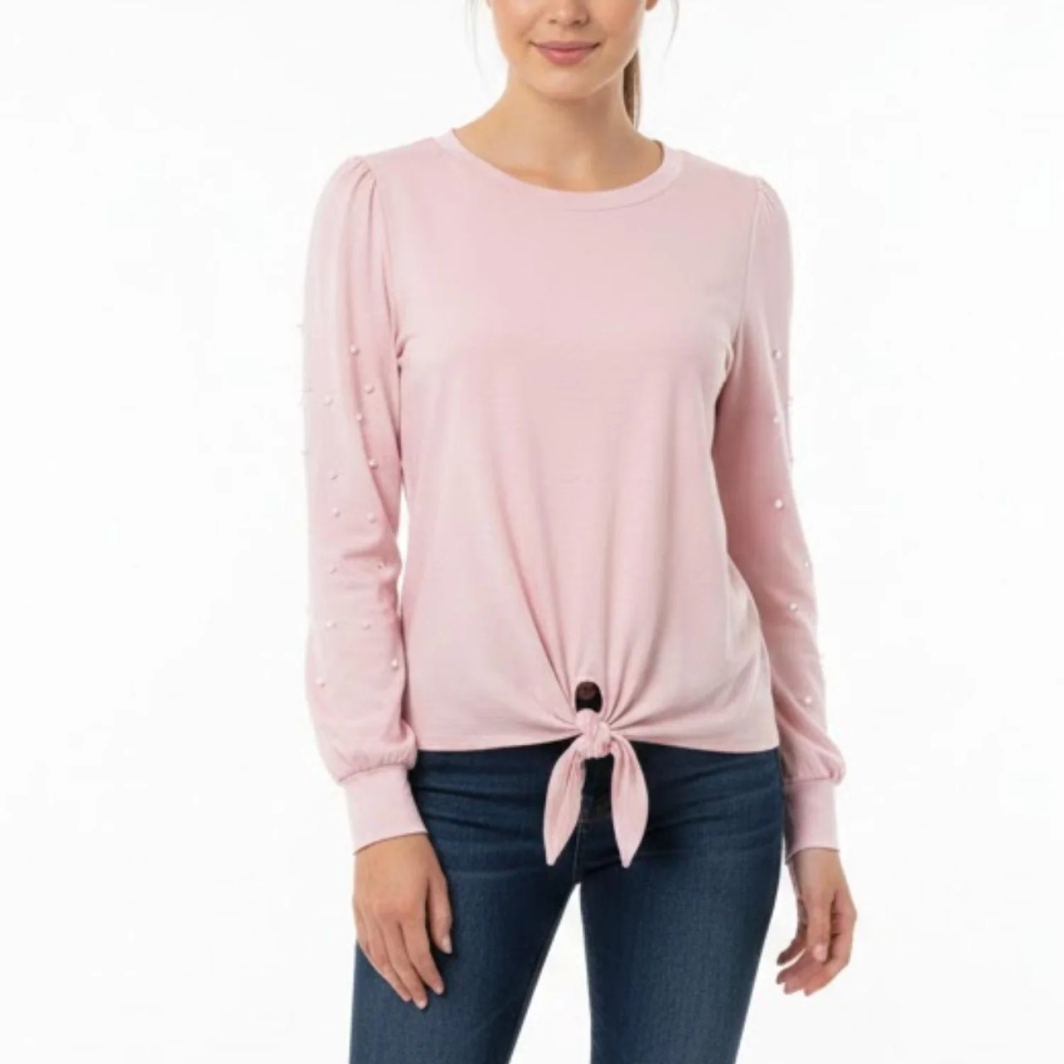 Skönhet Pink Pearl Embellished Puff Long Sleeve Tie-Front Top - Size Large