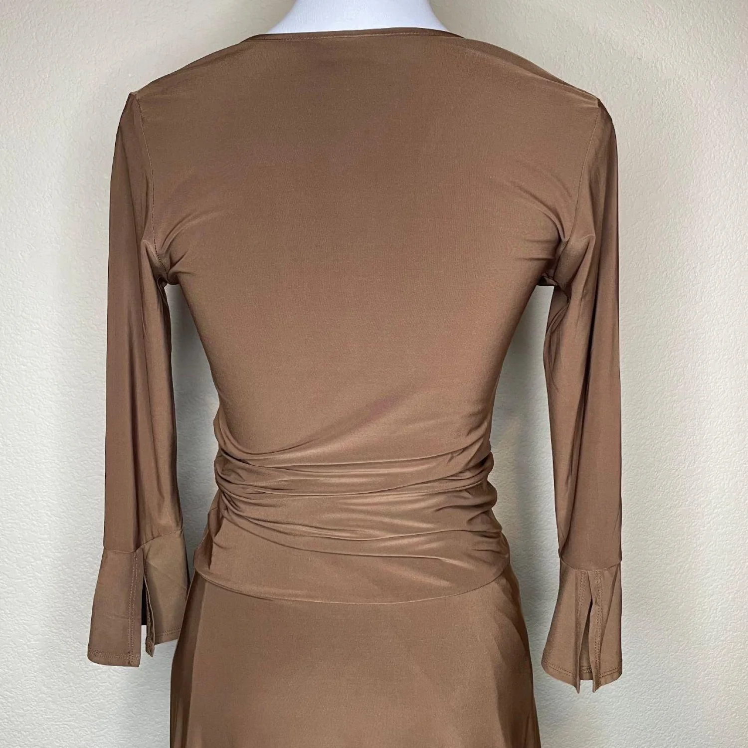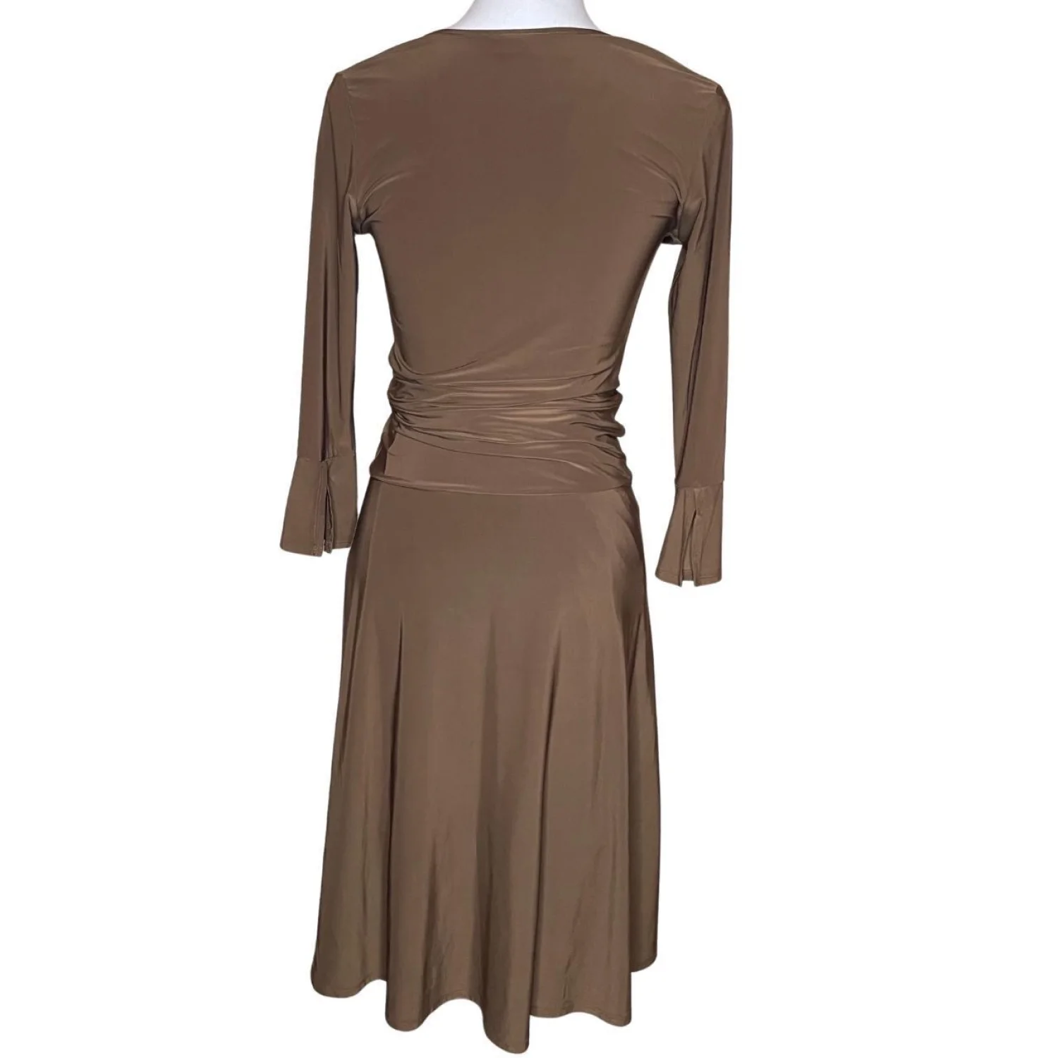 Slinky Mocha Brown Wrap Dress Bell Sleeve Ruched Waist Minimalist Y2K Size Small