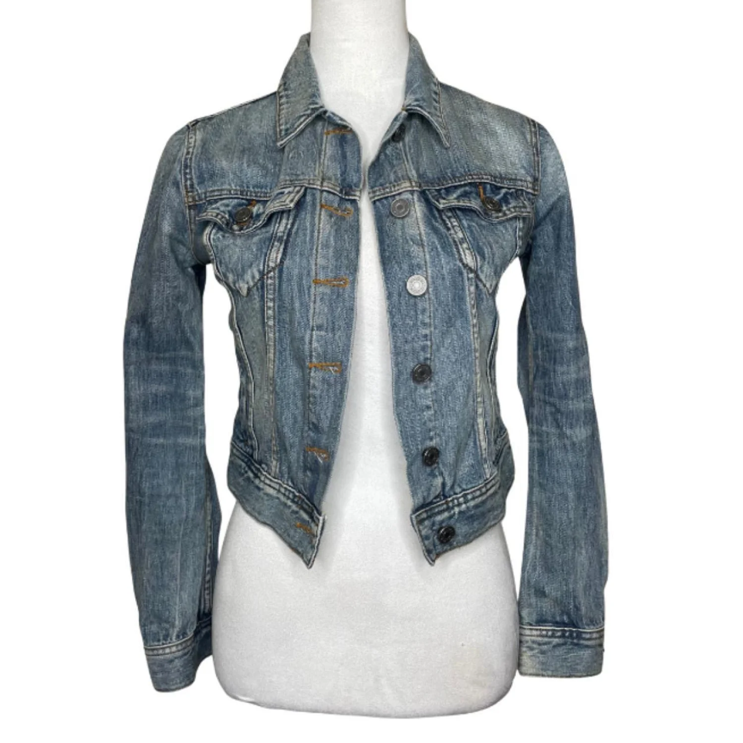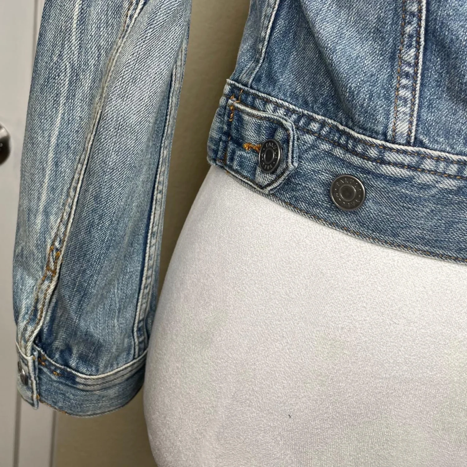 TALULA Aritzia Y2K Shrunken Cropped Denim Trucker Jacket Light Wash XS Features: Vintage-inspired shrunken silhouette in a classic light indigo wash. This Talula (Aritzia) piece features a structured, cropped hem that hits right at the natural waist. Heavyweight 100% cotton denim with traditional bronze contrast stitching and dual chest pockets. Authentic fading throughout the seams gives it a worn-in, lived-in feel without the wait. • Style Profile: Aritzia, Y2K, Indie Sleaze, Shrunken Fit, Minimalist, Streetwear, 90s Aesthetic, Clean Girl, Coastal Grandmother, Model Off Duty, Cropped Jacket, Light Wash Denim • Flaws: No Holes, stains, or tears • Please see the photos for measurements (in inches). PTP: 16' Length:18' Sleeve Length: 22.5' Happy to answer your questions! Super Fast Shipper! Bundle items for discounts!