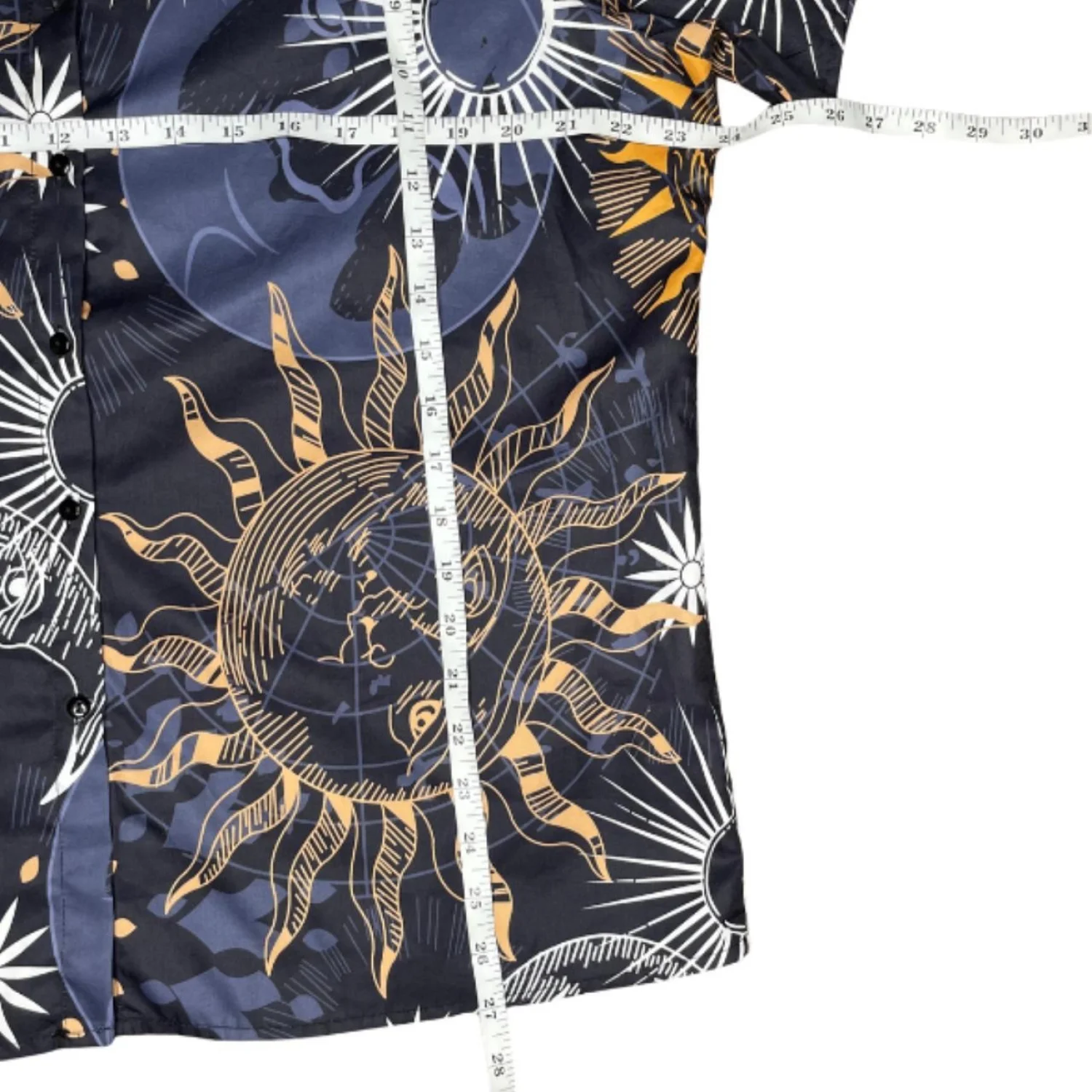 This unisex sun and moon constellations astrology button-up short sleeve shirt is a stylish and casual addition to any wardrobe. The blue color and moon theme give it a unique and eye-catching look, perfect for the summer, fall, or spring seasons. With a collared neckline and button-down style, this shirt offers a comfortable regular fit for an easy and relaxed wear. Whether you're dressing up for a casual occasion or lounging at home, this versatile shirt is sure to make a statement. Features: • Style Profile: Boho, summer, vacation, beach, pool, going out, casual, statement piece Whimsygoth magical, enchanted • Flaws: No Holes, stains, or tears • Please see the photos for measurements (in inches). PTP: 23.5' Length: 27' Happy to answer your questions! Super Fast Shipper! Bundle items for discounts!