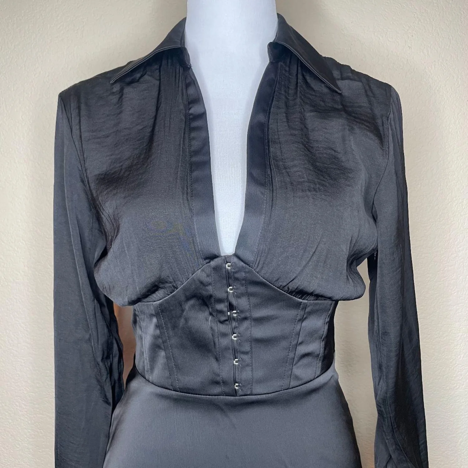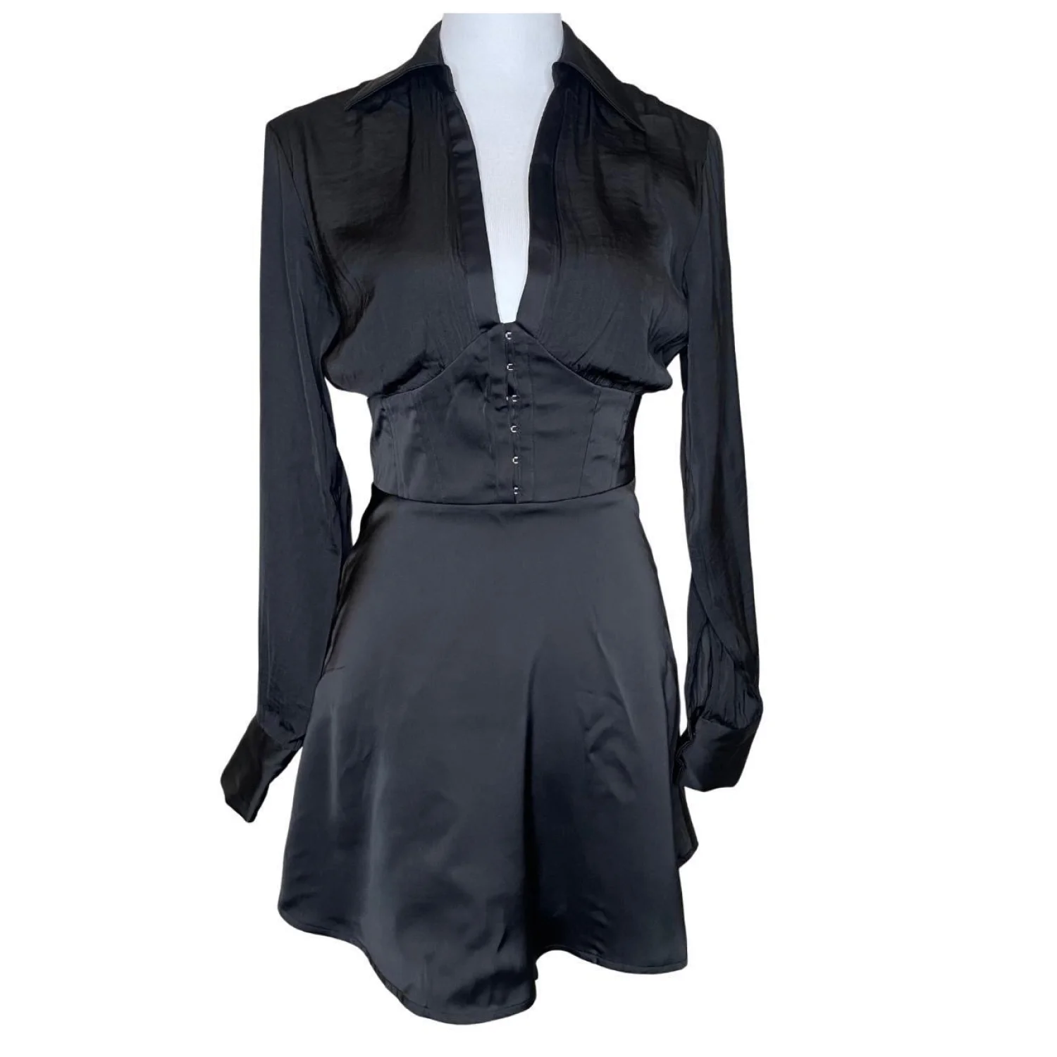Offers Welcomed🎉 Size Small Features: Turn heads in this edgy yet chic mini dress by Urban Outfitters. The "Phoebe" dress features a structured corset-inspired waist with hook-and-eye closures that cinch you in for a flattering silhouette. The plunging V-neckline with a collar adds a sharp, tailored touch, making it perfect for a night out or a stylish day look. • Style Profile: #corset #darkacademia #wednesdayaddams #whimsygoth #grungefairy • Flaws: There is some minor fraying/separation at the very top of the side zipper (see close-up photo). The zipper is fully functional • All measurements are approximate PTP: 16' Length: 30' Sleeve Length: 21.5' Happy to answer your questions! Super Fast Shipper!