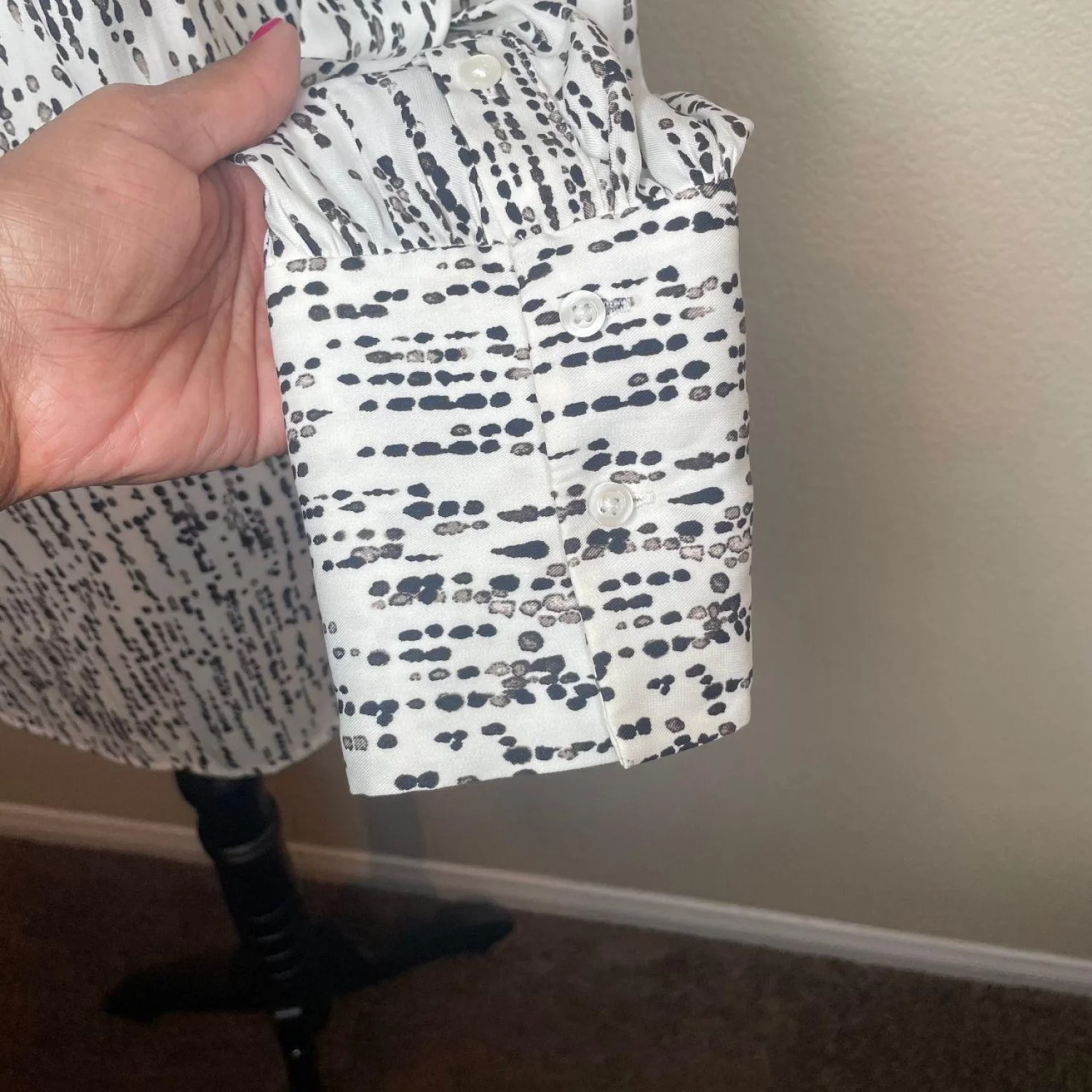Vera Wang Abstract Monochrome Button Up Shirt L Features: Elevate your workwear with this Simply Vera Vera Wang long-sleeve button-down blouse. Featuring a crisp white base with a black and grey abstract vertical dot print, this top offers a modern twist on the classic button-up. It includes a traditional collar and elegant wide cuffs with a three-button closure for a polished look. • Style Profile: Minimalist, Corporate Goth, Dark Academia, Monochrome, Abstract, Business Casual, Contemporary, Artsy, Office Chic, Workwear, Sophisticated, Scandi Style, Tunic Style, Modernist • Flaws: No Holes, stains, or tears (Excellent pre-owned condition) • All measurements are approximate PTP: 20.5" Length: 28" Sleeve Length: 22" Happy to answer your questions! Super Fast Shipper!