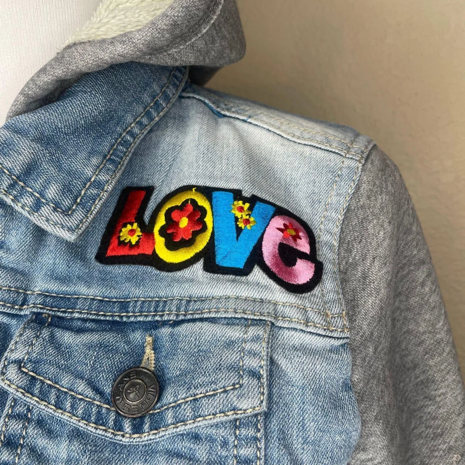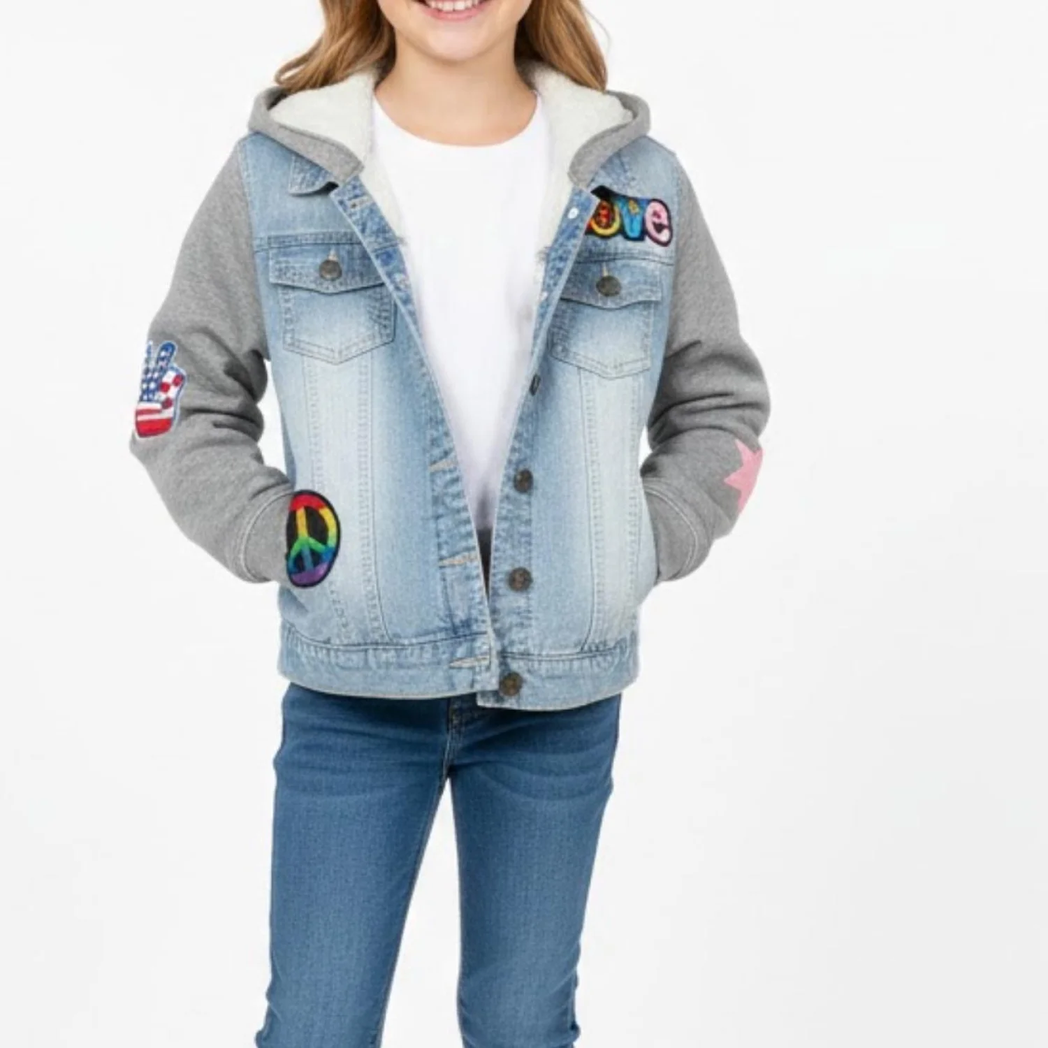 Vigoss Girls Hooded Denim Jacket Size 10 Patches Sherpa Lined Mixed Media