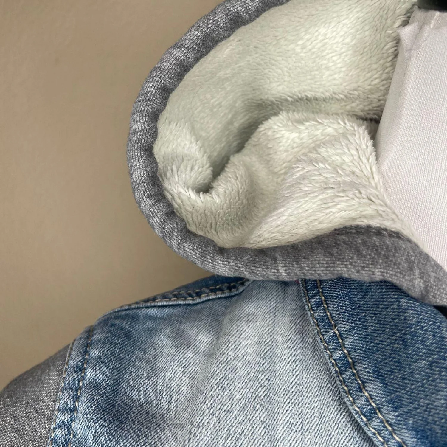 Features: her cool-weather style with this adorable Vigoss mixed-media jacket! This piece features a classic blue denim bodice with cozy heather gray sweatshirt sleeves and a matching hood. It is fully lined with soft, cream-colored faux fur (sherpa style) for extra warmth. • Style Profile: Boho, Retro, Hippie, School Style, Casual, Sherpa Lined, Mixed Media, 90s Aesthetic, Y2K Kids, Patchwork, Cozy, Americana, Streetwear, Kidcore, Outerwear • Flaws: No Holes, stains, or tears (Excellent pre-owned condition) • All measurements are approximate PTP: 17' Length: 17' Sleeve Length: 18' Happy to answer your questions! Super Fast Shipper!