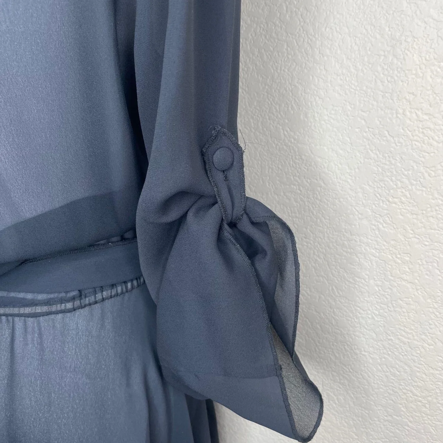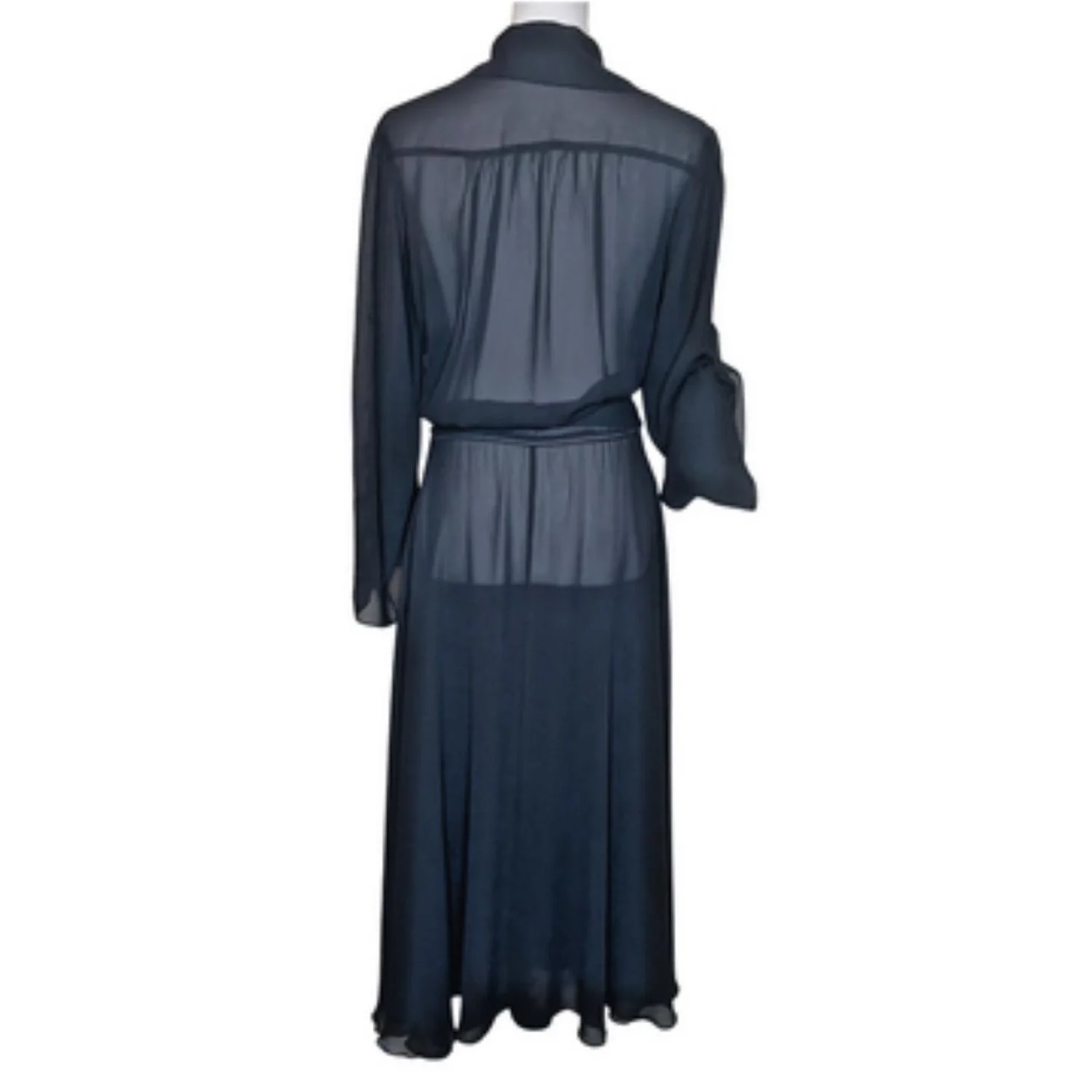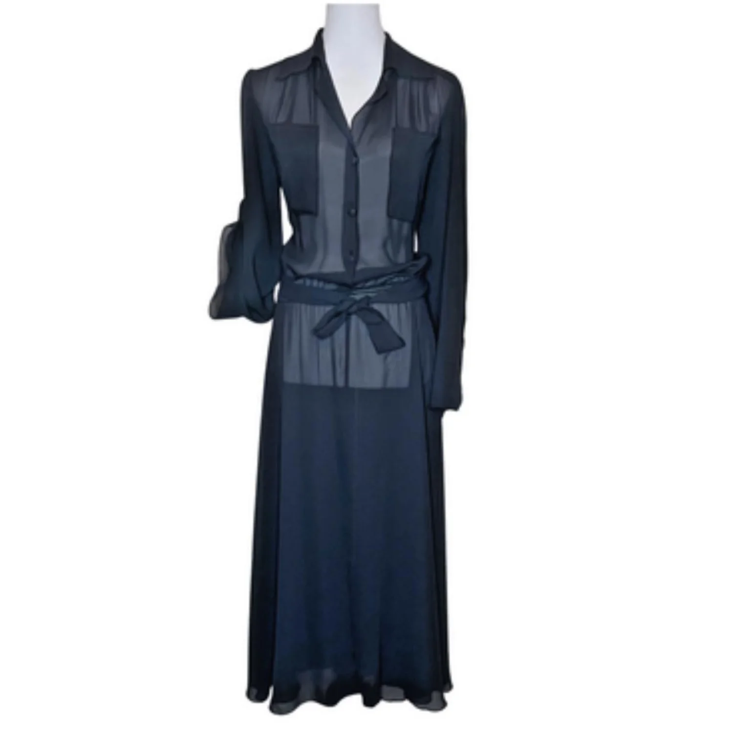 Offers Welcomed🎉 Features: This gem features a full button-down front, classic collar, chest pockets, and matching waist tie to cinch the silhouette. Perfect for layering over a slip, bodysuit, or even jeans and a bralette. • Style Profile: vintage, whimsigoth, goth, witchy, dark academia, grunge, 90s style, 70s style, sheer, chiffon, maxi, shirt dress, duster, layering piece, minimalist, funeral chic, corporate goth, stevie nicks vibes, bohemian, avant garde • Flaws: No Holes, stains, or tears (Excellent pre-owned condition) • All measurements are approximate PTP: 21.5' Length: 51-52' Happy to answer your questions! Super Fast Shipper!