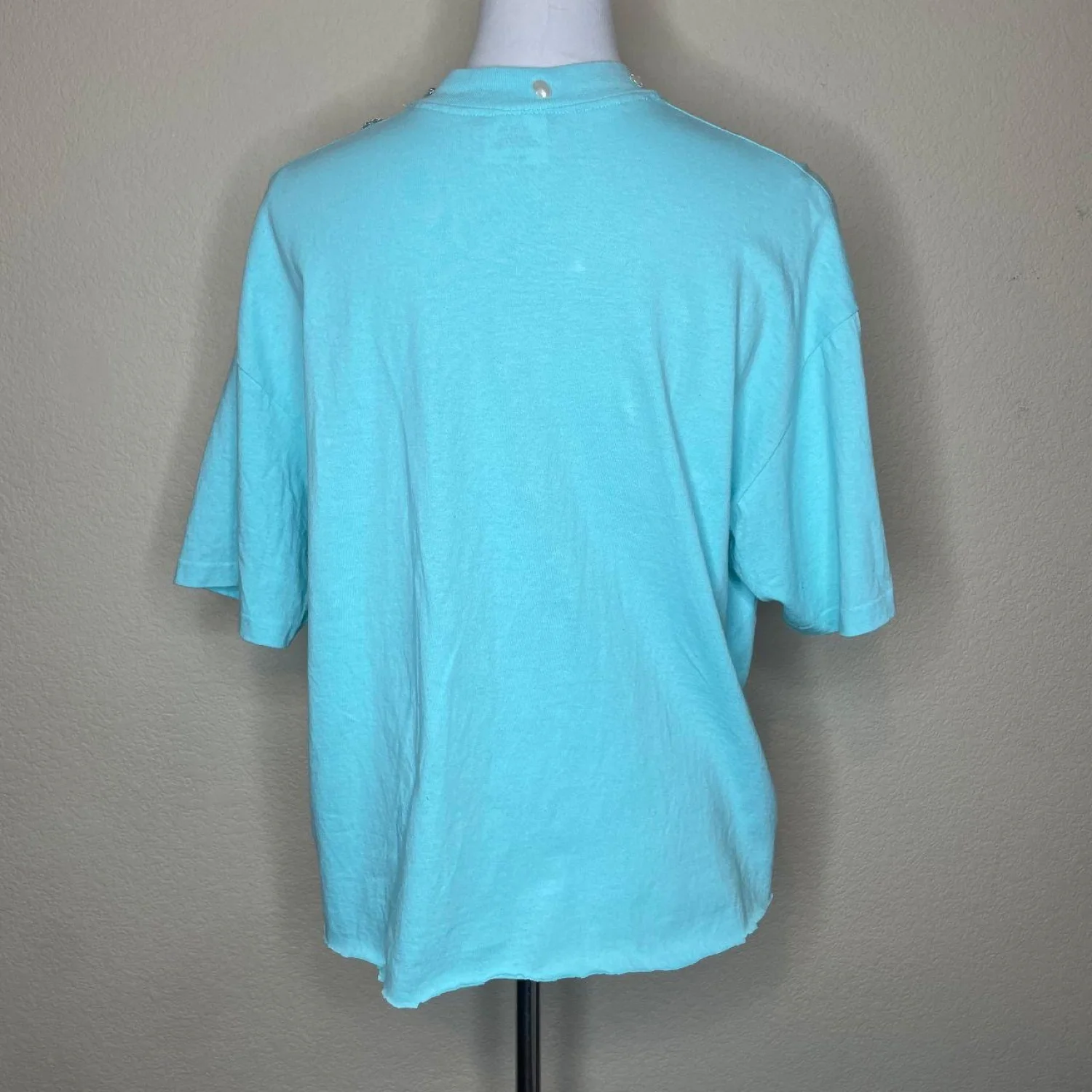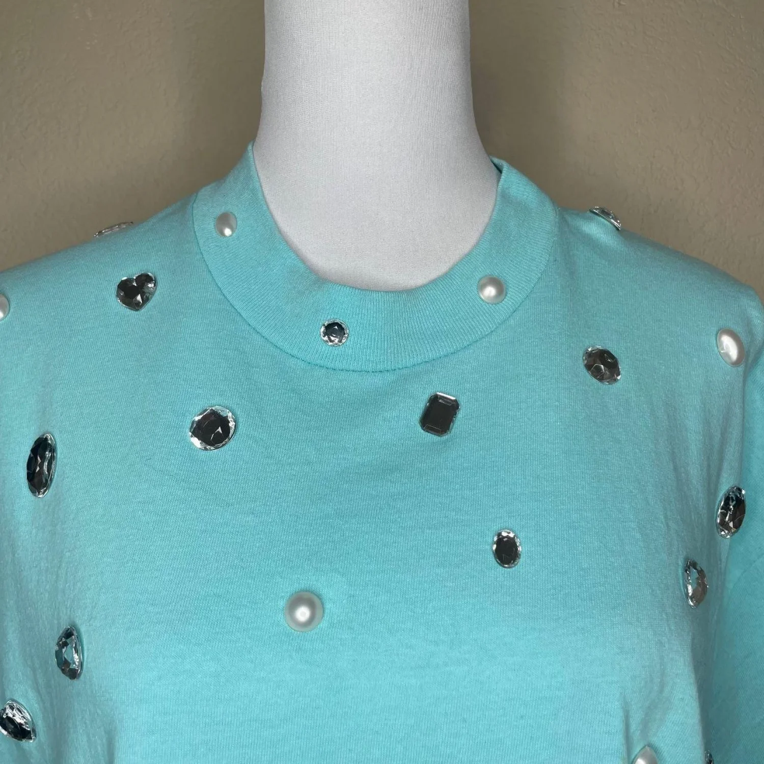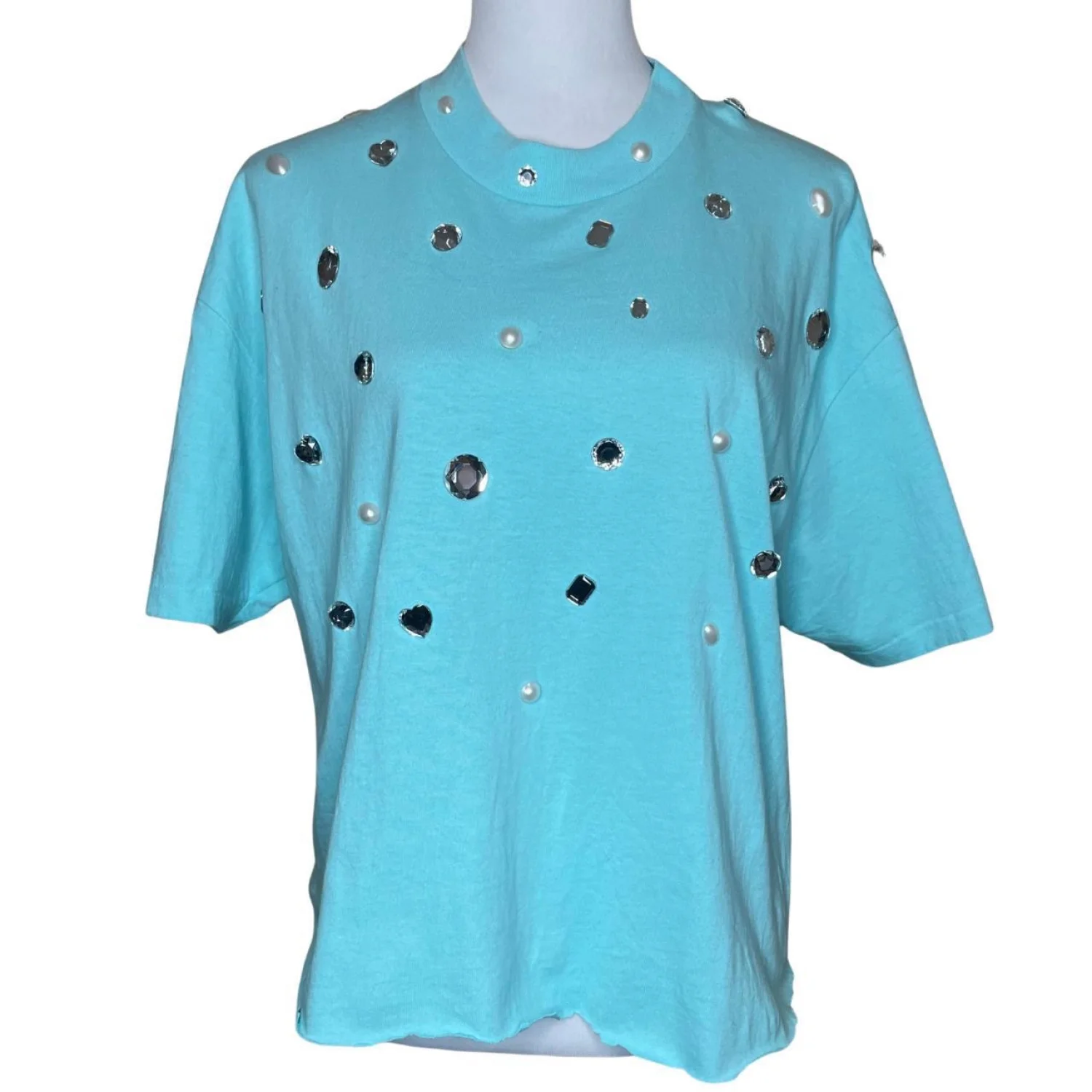 VINTAGE Switzer's Embellished Mock Neck T-Shirt XL Aqua Blue Rhinestones Pearls 90s