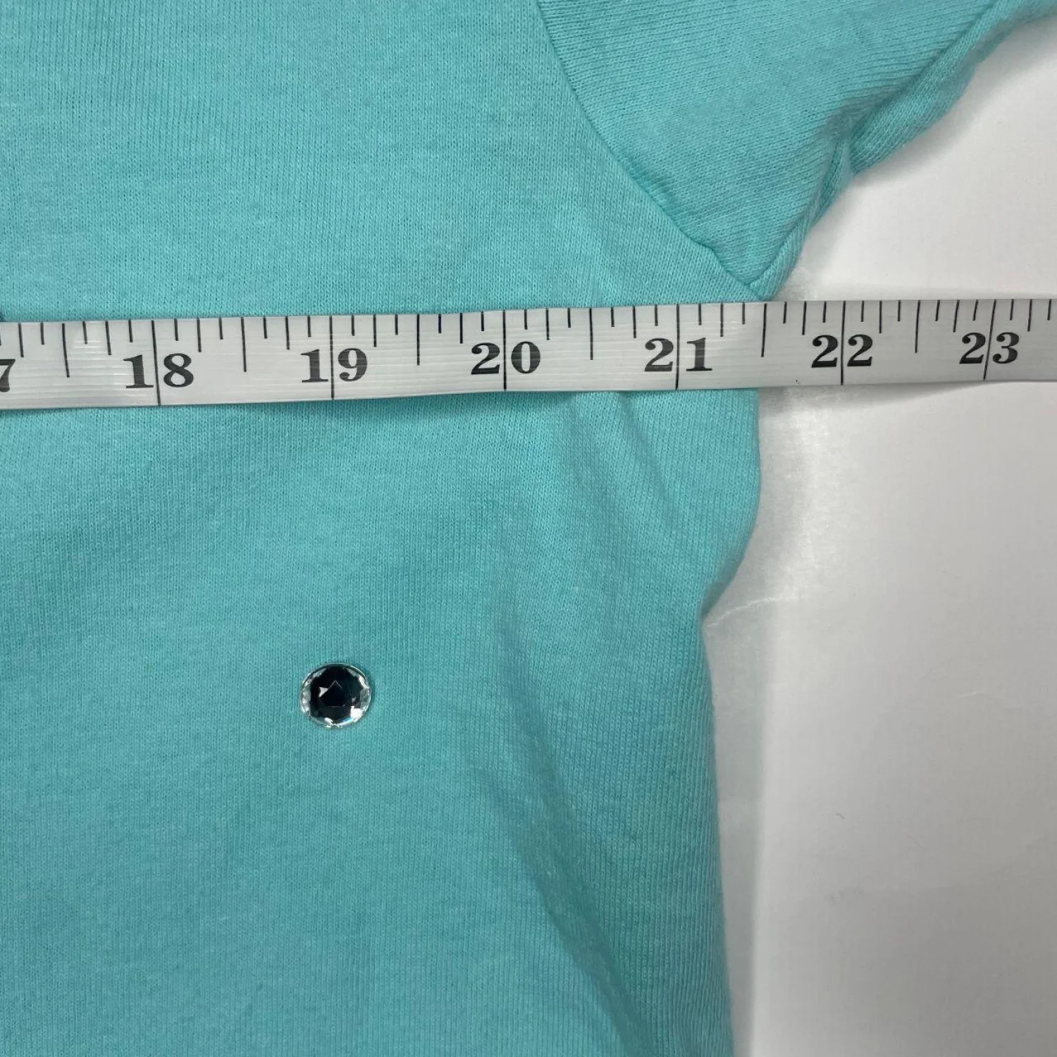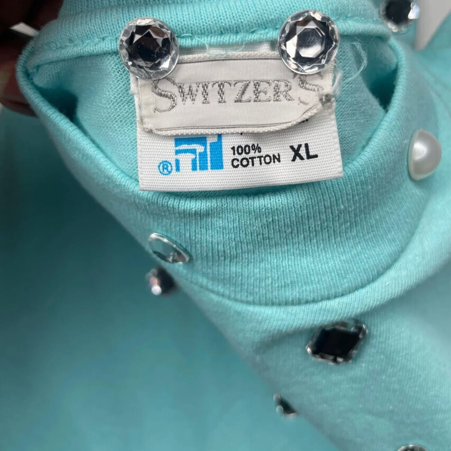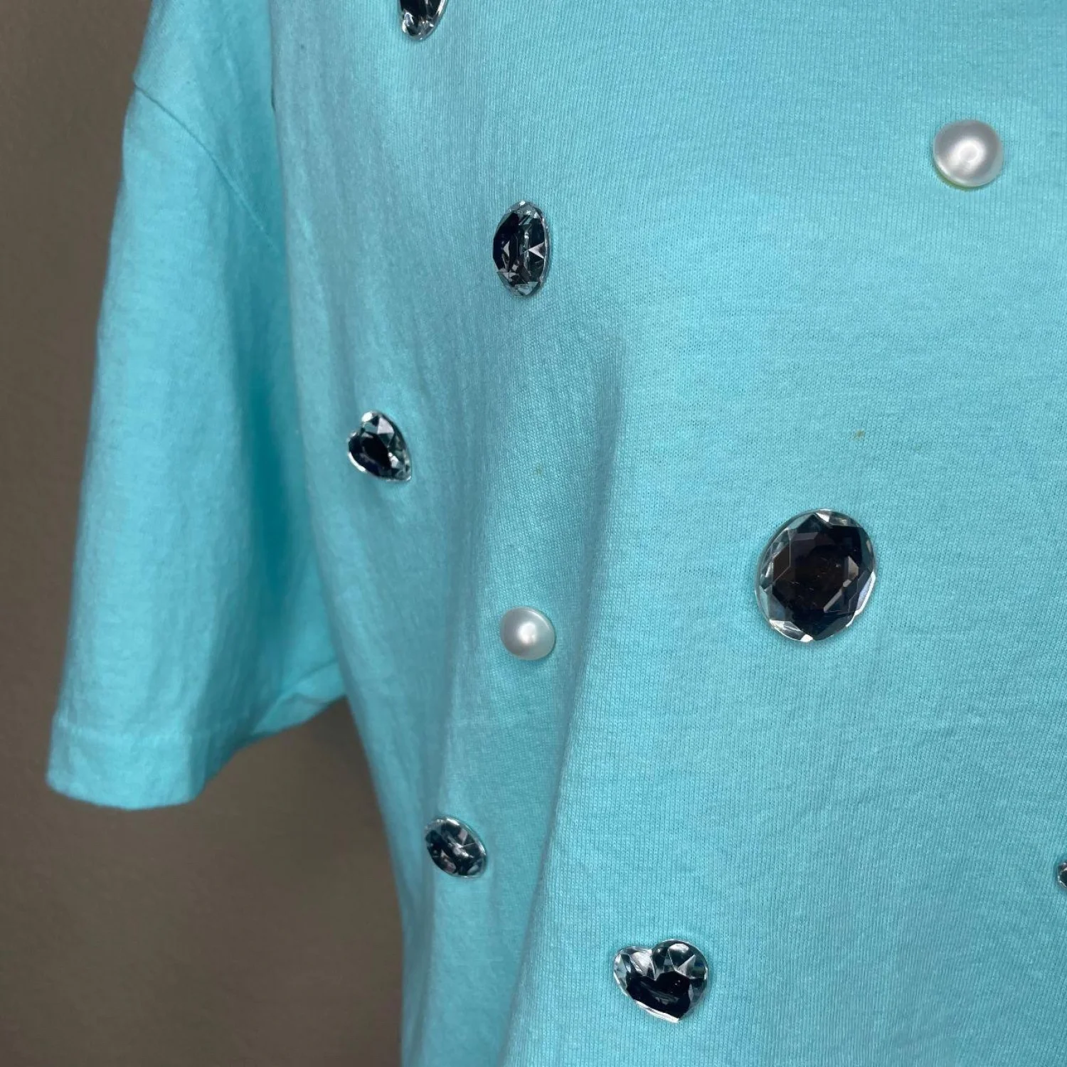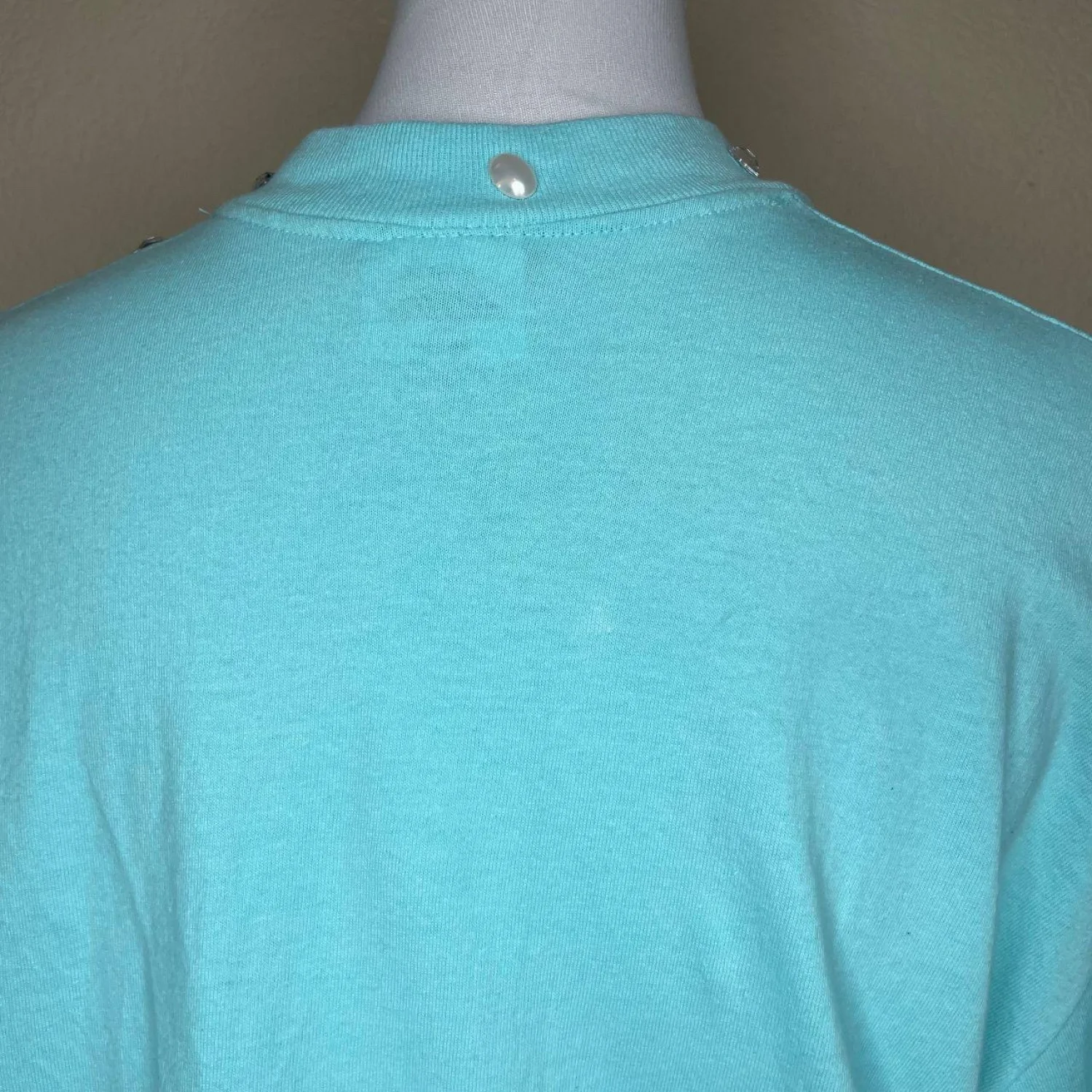 VINTAGE Switzer's Embellished Mock Neck T-Shirt XL Aqua Blue Rhinestones Pearls 90s