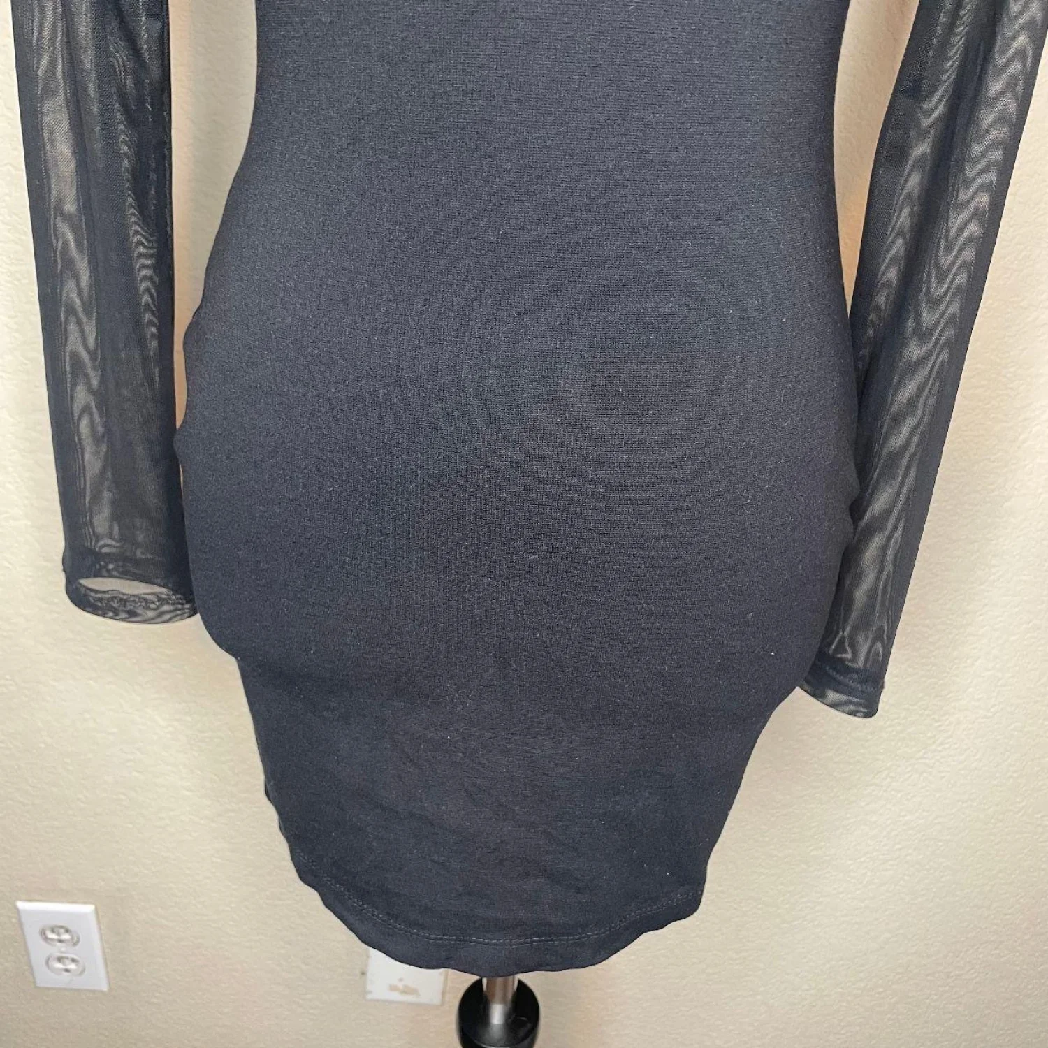 Windsor Black Keyhole Bodycon Mini Dress Sheer Mesh Long Sleeve Studded Collar Features: Turn heads in this stunning Windsor bodycon mini dress. Features a sophisticated mock neck collar embellished with silver studs, a daring front keyhole cutout, and elegant sheer mesh long sleeves. The fitted silhouette and stretchy fabric make it the perfect "little black dress" for clubbing, date nights, or holiday parties. • Style Profile: edgy, baddie, clubwear, night out, goth, glam, holiday party, bodycon, minimalist, chic, y2k inspired, dark aesthetic • Flaws: No Holes, stains, or tears (Excellent pre-owned condition) Size/Material Tag Missing • All measurements are approximate PTP: 13.5' Length: 29' Sleeve Length: 22' Happy to answer your questions! Super Fast Shipper!