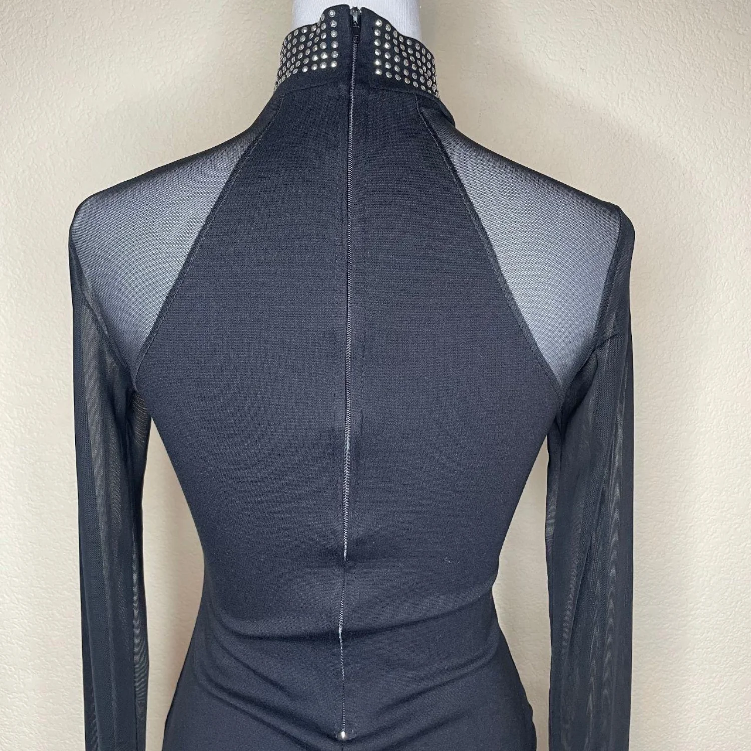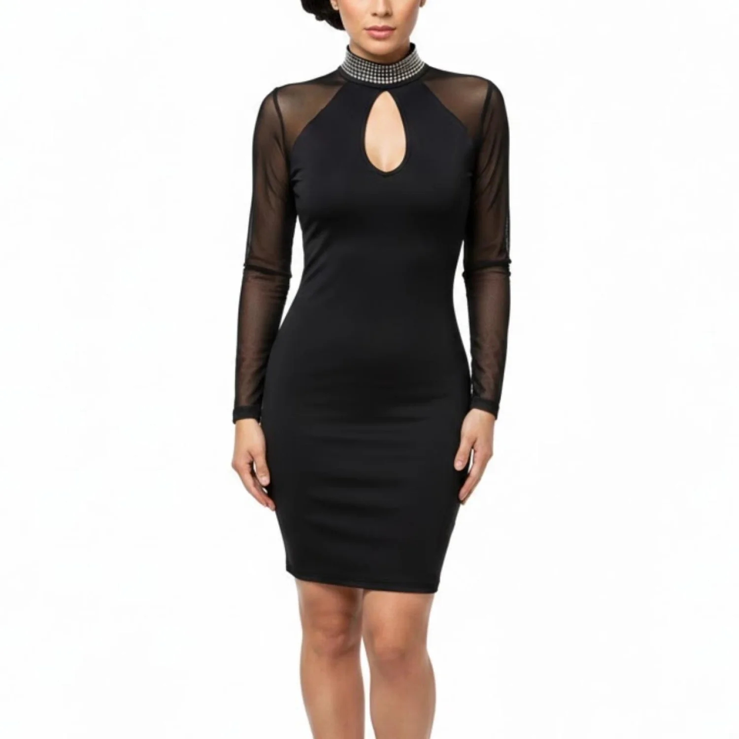 Windsor Black Keyhole Bodycon Mini Dress Sheer Mesh Long Sleeve Studded Collar