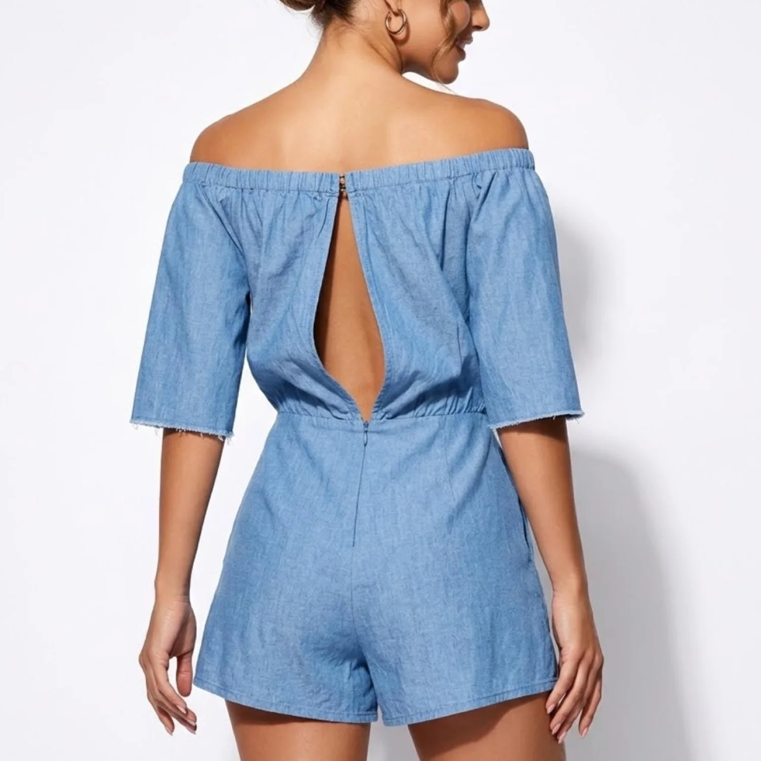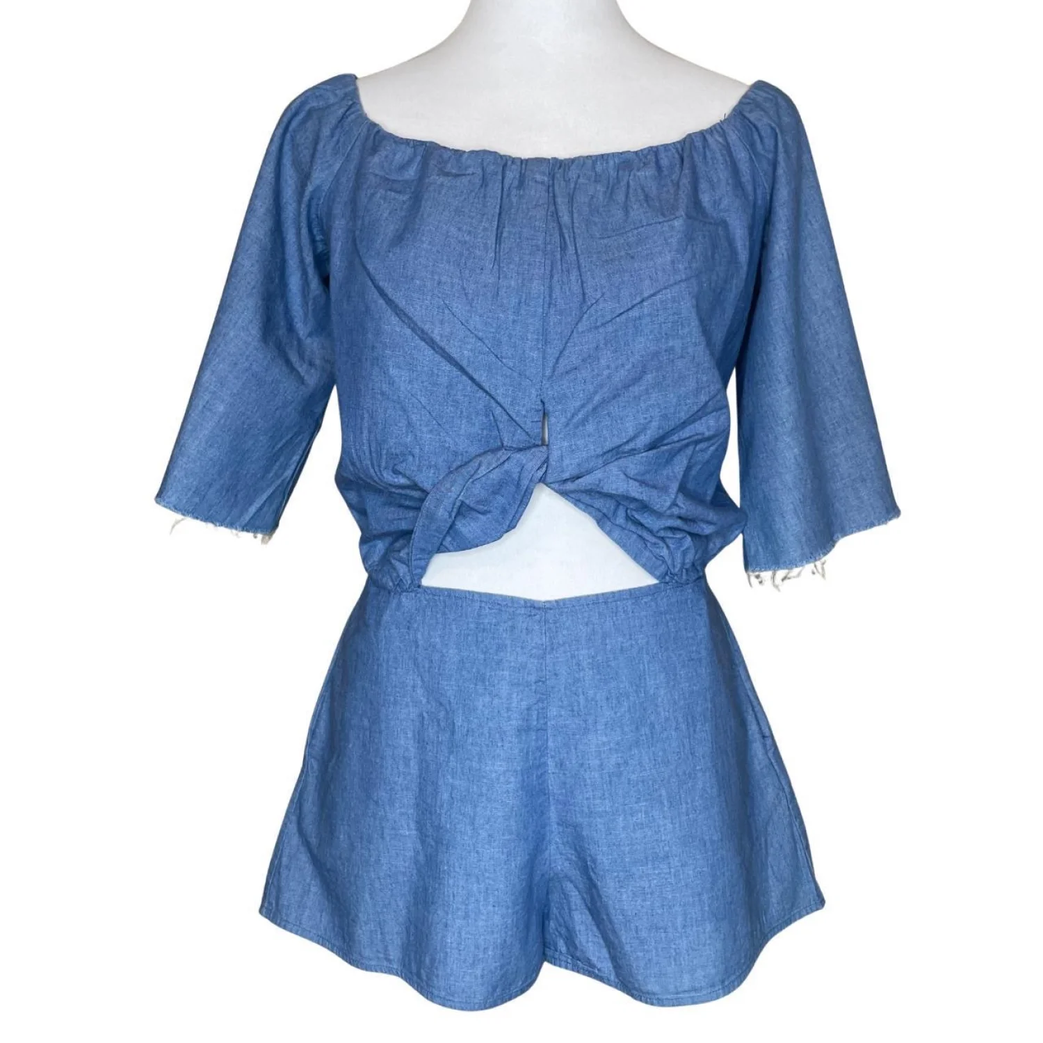 ZARA Blue Cotton Knot Front Cutout Romper Off-Shoulder Pockets Coastal 90s Sm