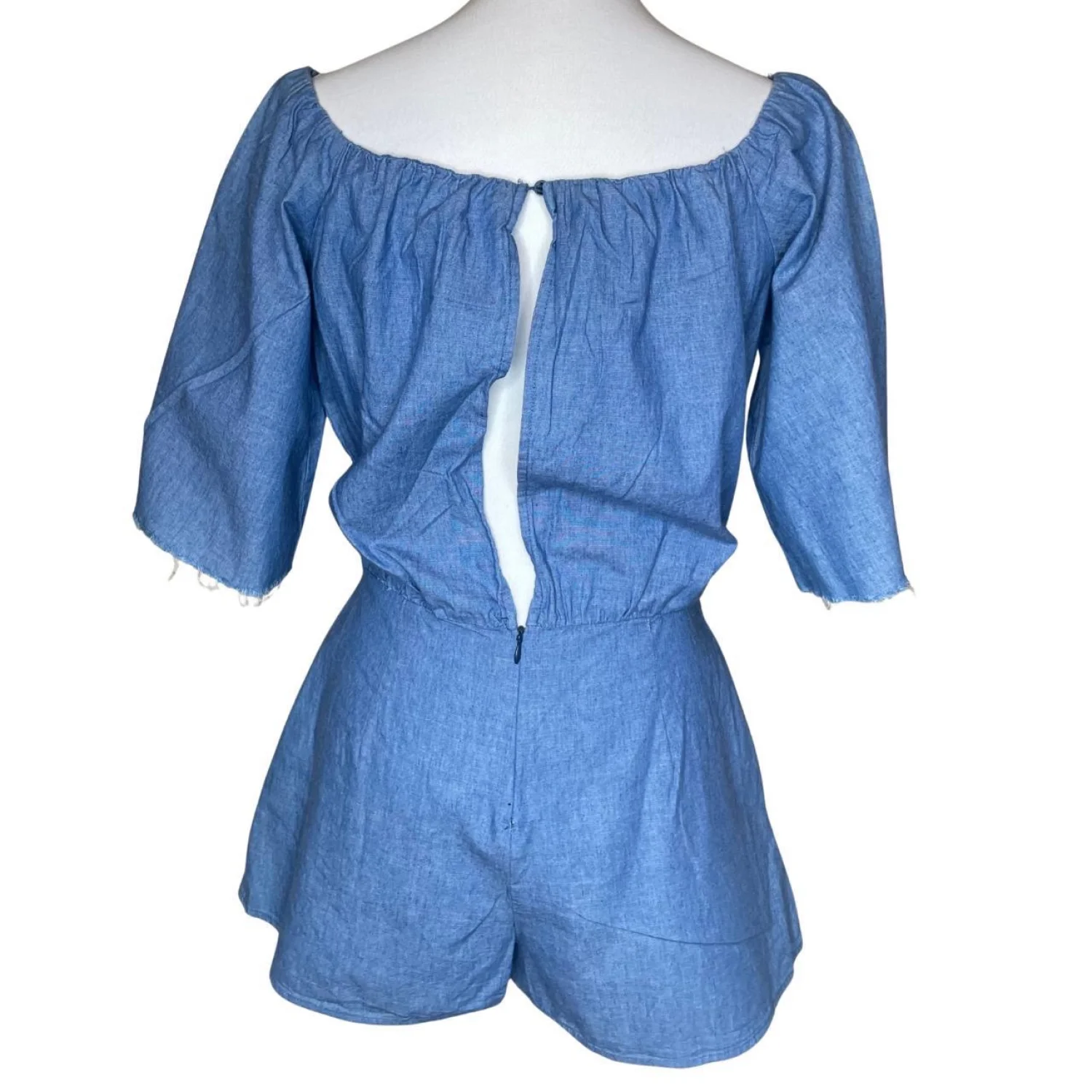 ZARA Blue Cotton Knot Front Cutout Romper Off-Shoulder Pockets Coastal 90s Sm Features: Hard 90s coastal silhouette in a breathable 100% cotton weave. Features a gathered off-shoulder neckline and a centered knot-front that creates a sharp geometric midriff cutout. The 3/4 sleeves have raw, frayed hems for a lived-in texture. High-rise shorts with deep functional side pockets and a clean back-zip closure. Structured but light. • Style Profile: Coastal Grandmother, 90s Minimalist, French Girl Summer, Soft Girl, Nautical, Boho, Festival, Clean Girl, Preppy, Vacation • Flaws: No Holes, stains, or tears • All measurements are approximate PTP: 16.5' Length: 28' Happy to answer your questions! Super Fast Shipper!
