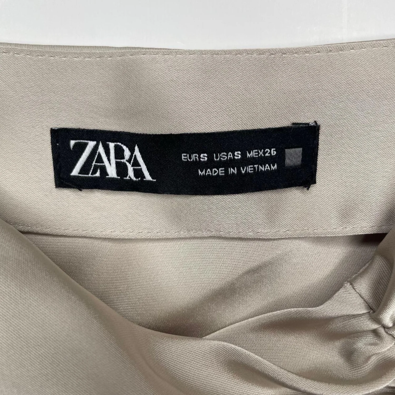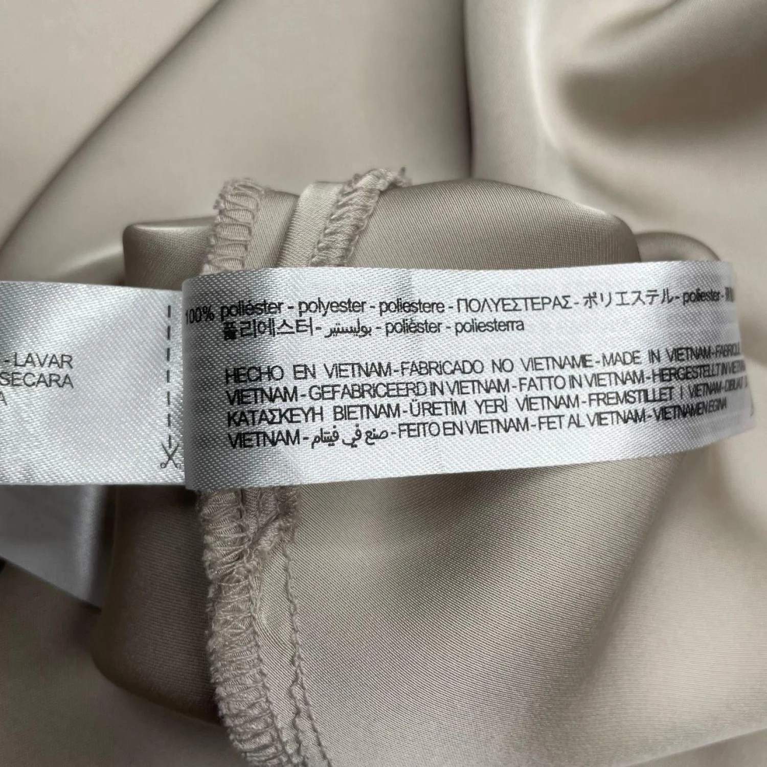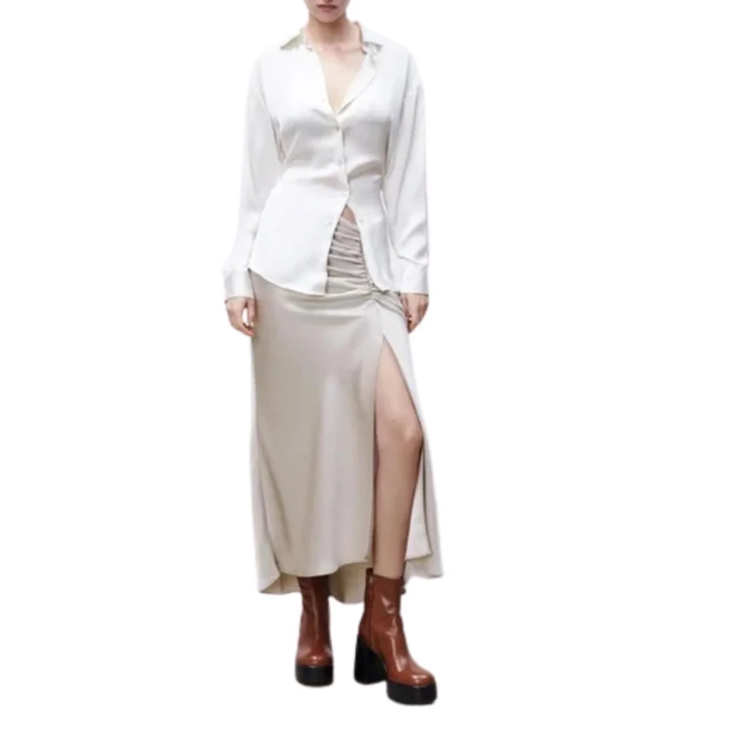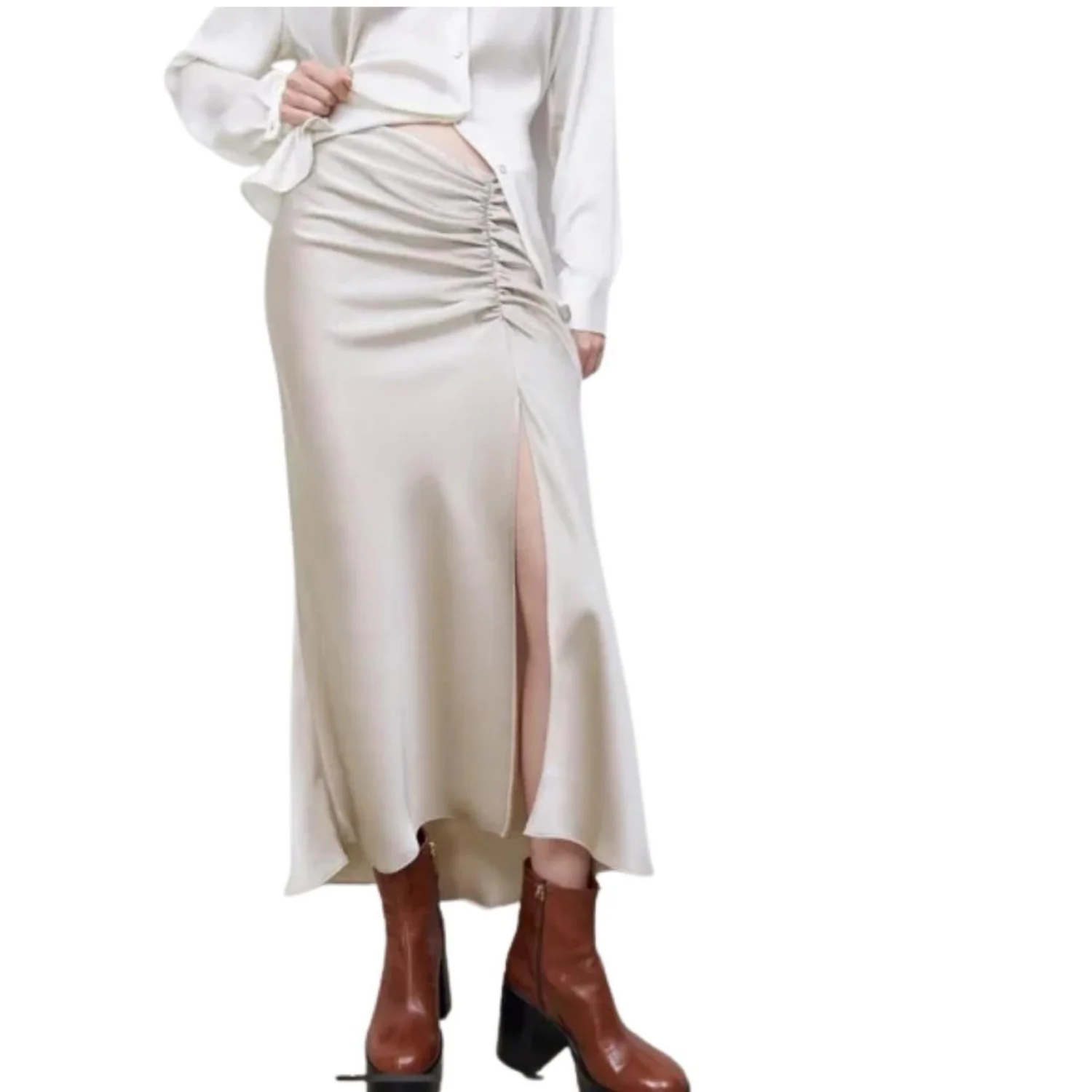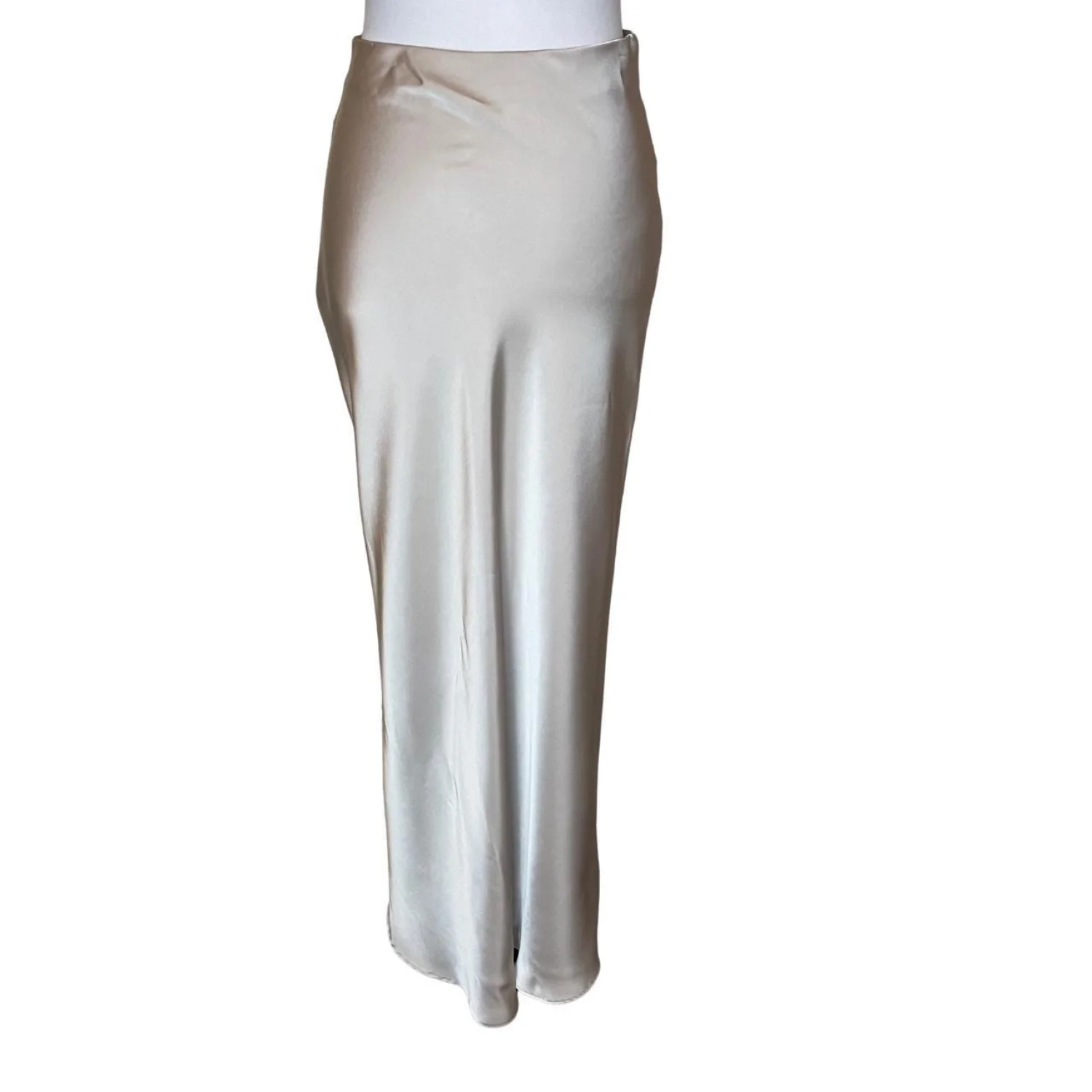 Zara Champagne Beige Ruched Satin-Effect Midi Skirt High Slit Bias Cut Sz Small