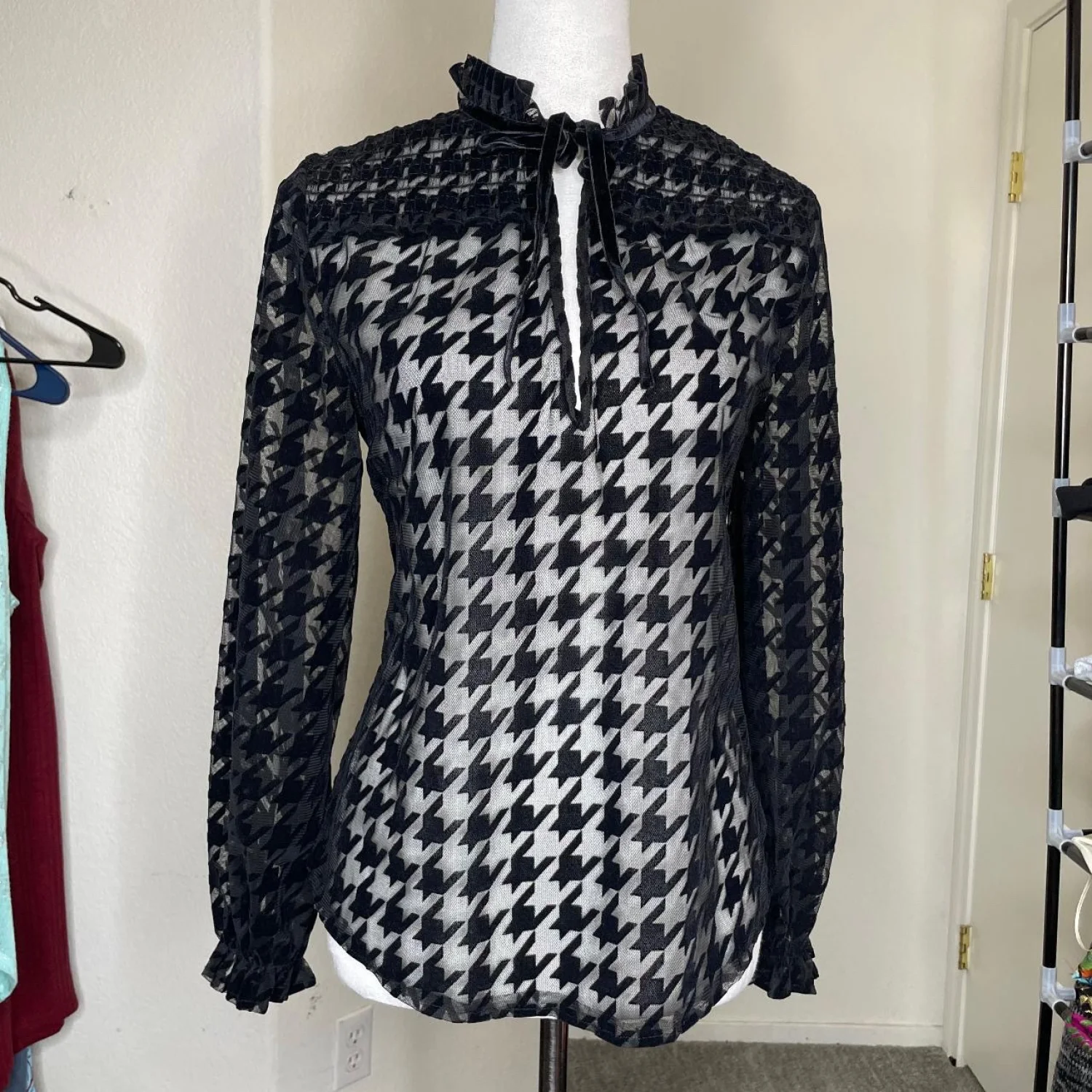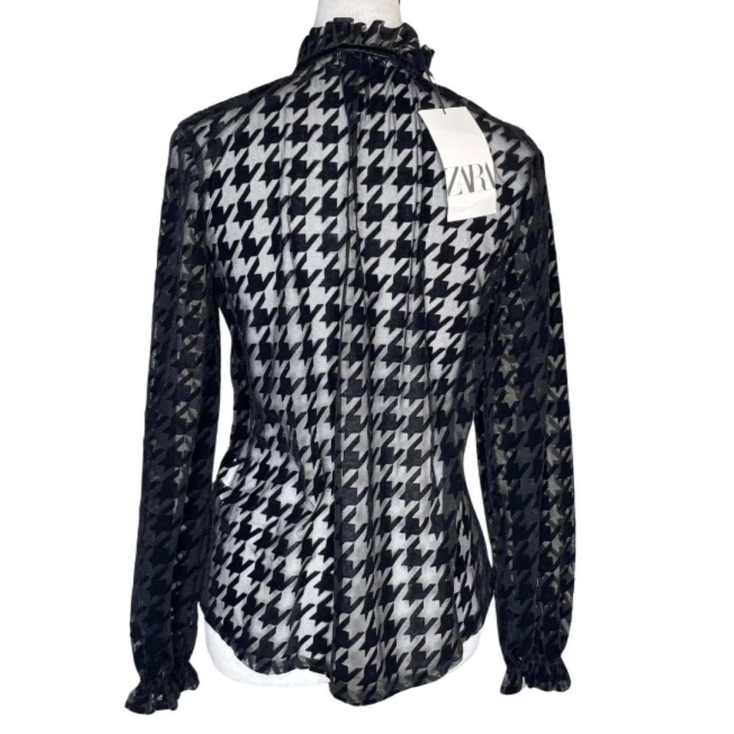 ZARA Women's Black Houndstooth Sheer Flocking Button-Down Blouse Top Features: • Style Profile: Dark Cottagecore, Dark Fairy, Feminine, Grunge, Whimsigoth • Flaws: No Holes, stains, or tears • Please see photos for measurements (in inches). PTP: 18.5' Length: 24' Sleeve Length: 23' • Happy to answer your questions! Super Fast Shipper!