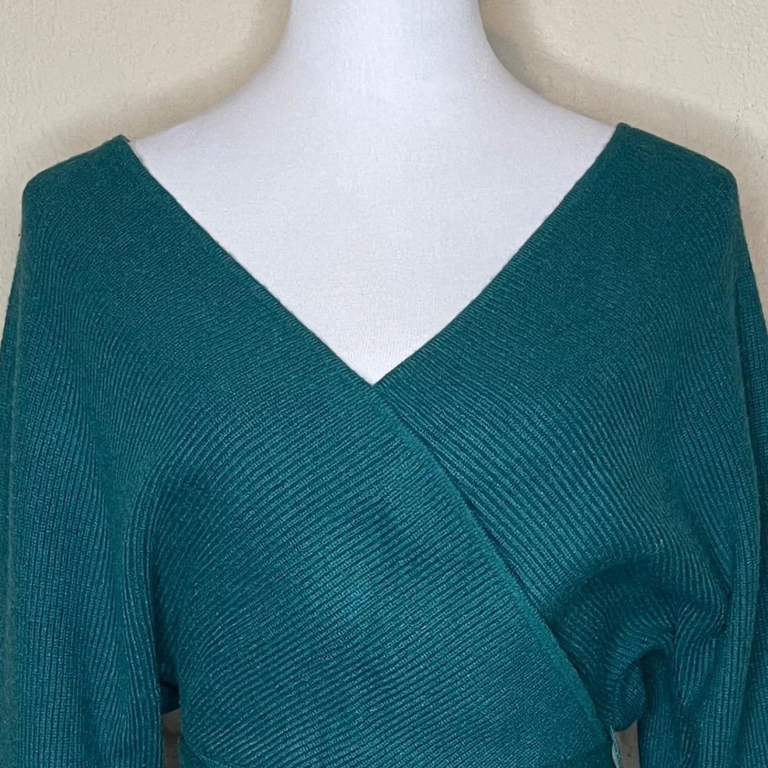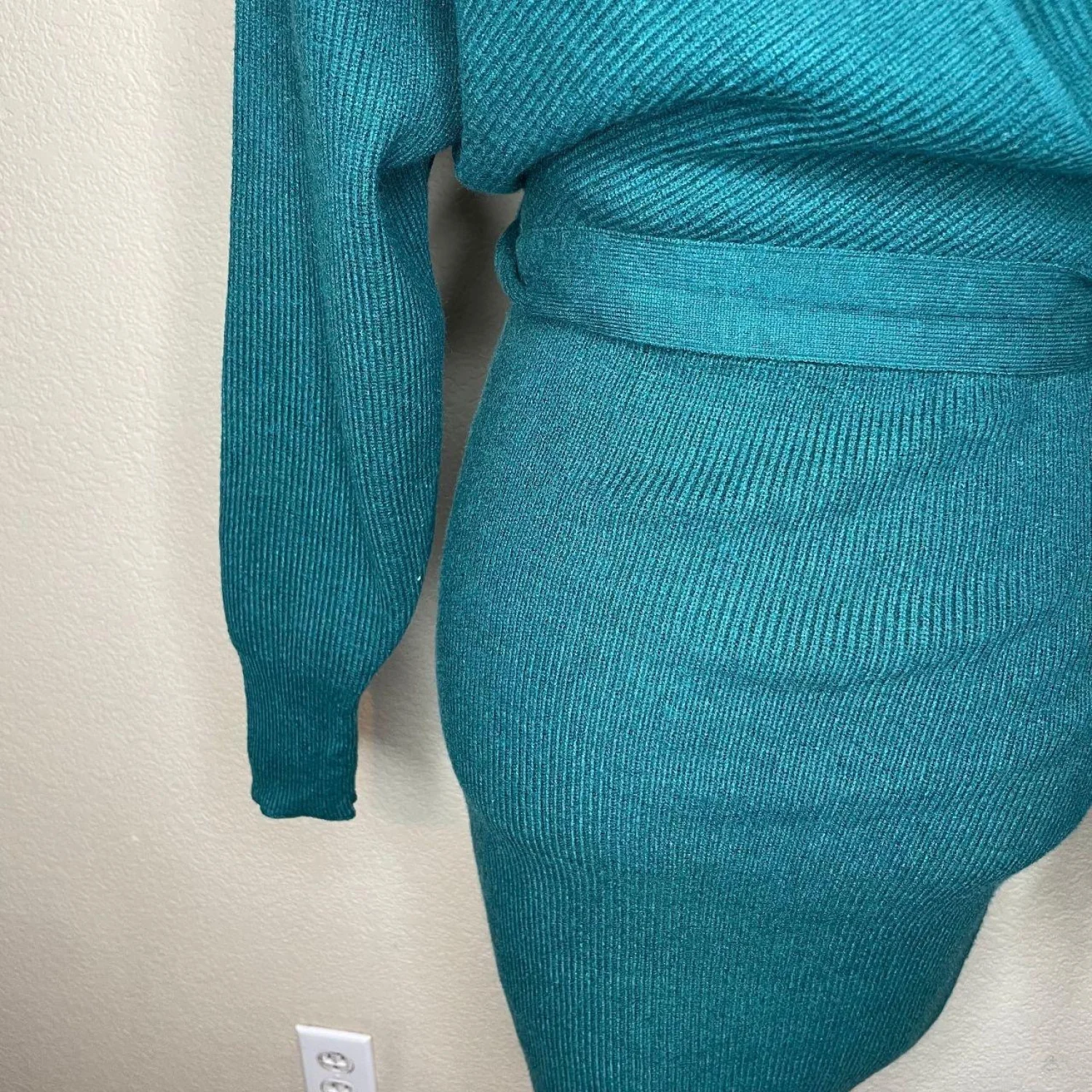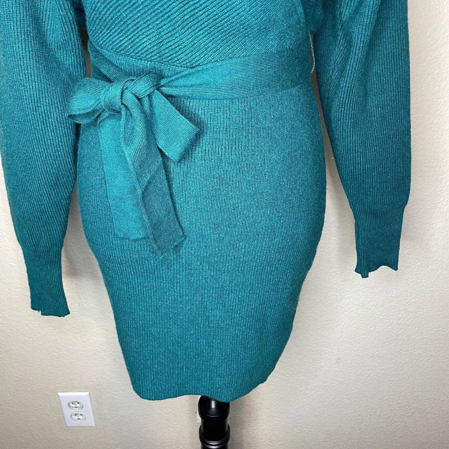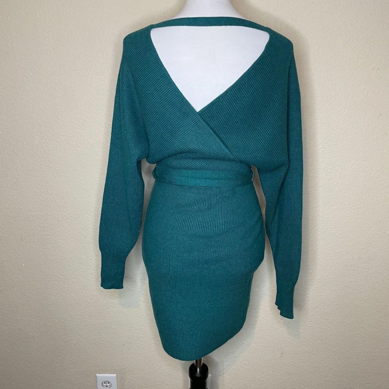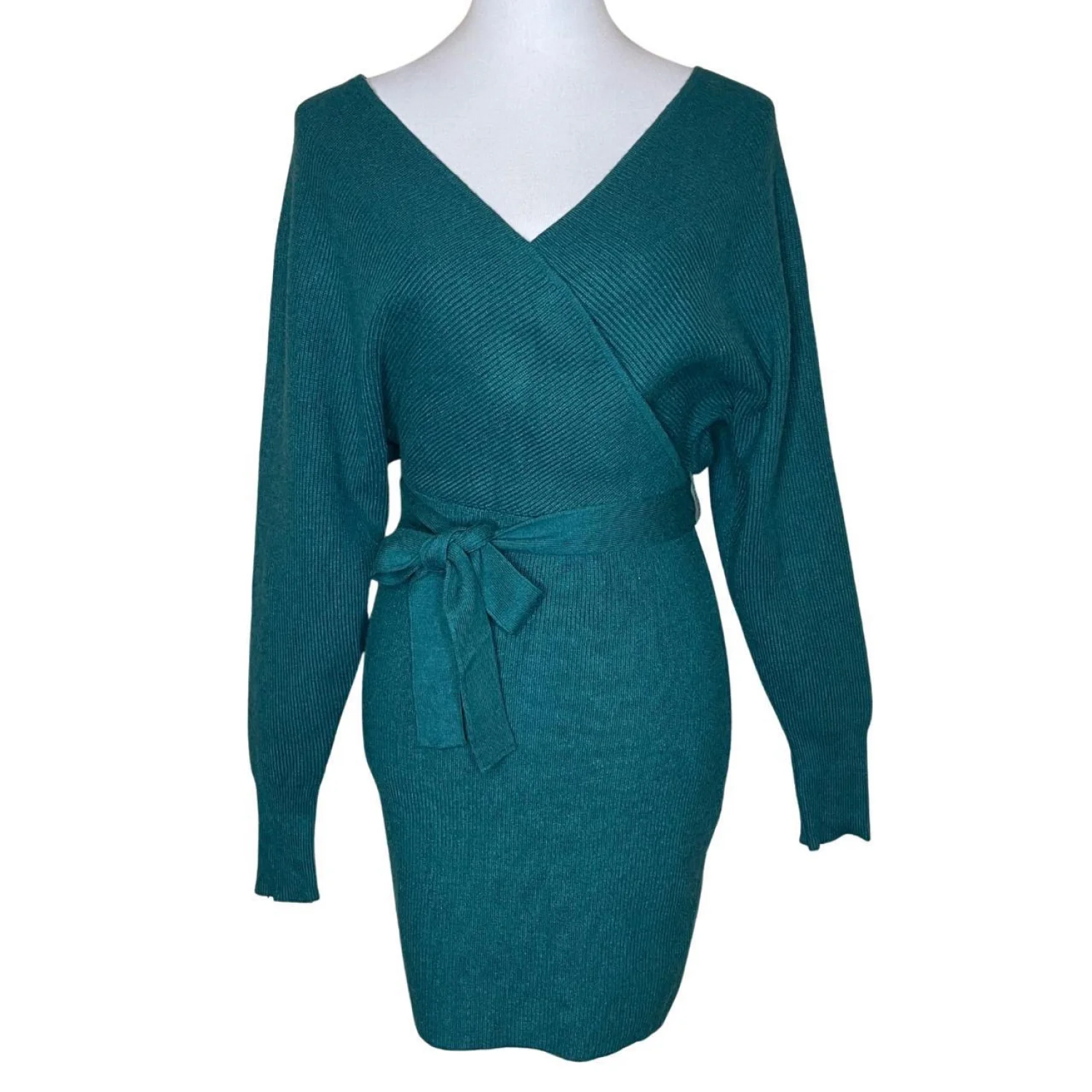 ZESICA Teal Ribbed Wrap Sweater Dress V-Neck Tie Waist Size S Features: Elevate your seasonal wardrobe with this stunning ZESICA ribbed knit sweater dress in a rich teal/dark peacock green. Featuring a flattering faux-wrap V-neckline, long sleeves, and an adjustable tie waist to cinch your silhouette. The soft, stretchy vertical ribbing provides a comfortable yet body-hugging fit. Perfect for date night, holiday parties, or a chic office look when paired with boots! Removable/adjustable waist tie, surplice neckline, back cutout detail with horizontal strap. • Style Profile: Boho, chic, minimalist, cozy, holiday, date night, winter fashion, fall aesthetic, jewel tone, ribbed knit, wrap dress, bodycon, sophisticated, quiet luxury, dark forest, cottagecore, elegant • Flaws: No Holes, stains, or tears (Excellent pre-owned condition) • All measurements are approximate PTP: 15" Length: 33.5" Sleeve Length: 25" Happy to answer your questions! Super Fast Shipper!