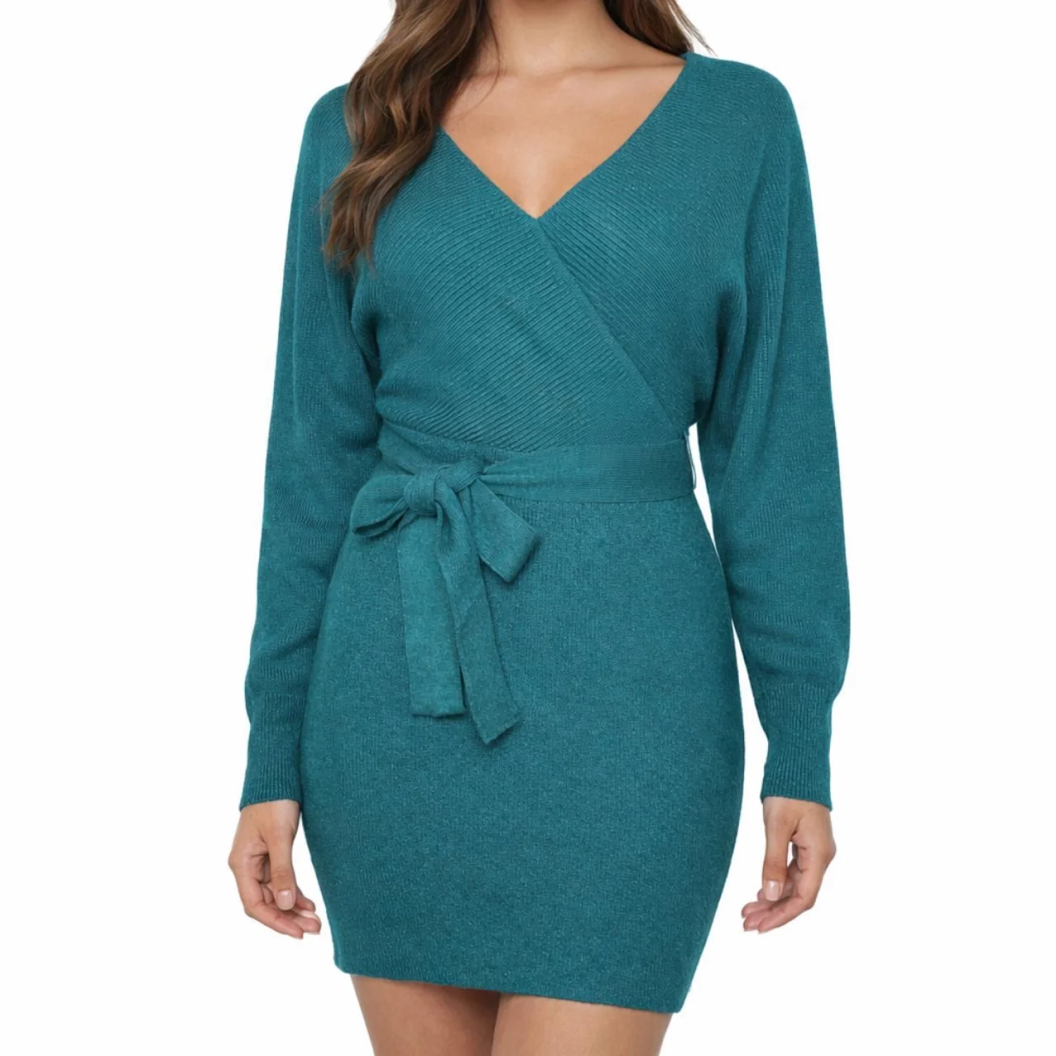 ZESICA Teal Ribbed Wrap Sweater Dress V-Neck Tie Waist Size S