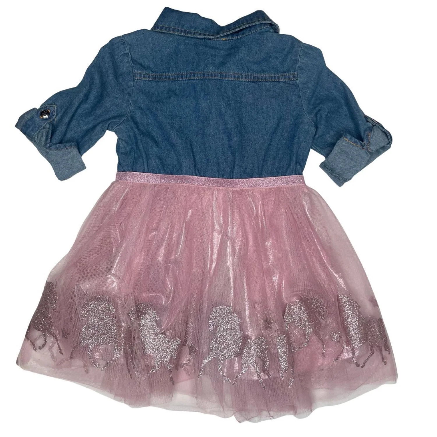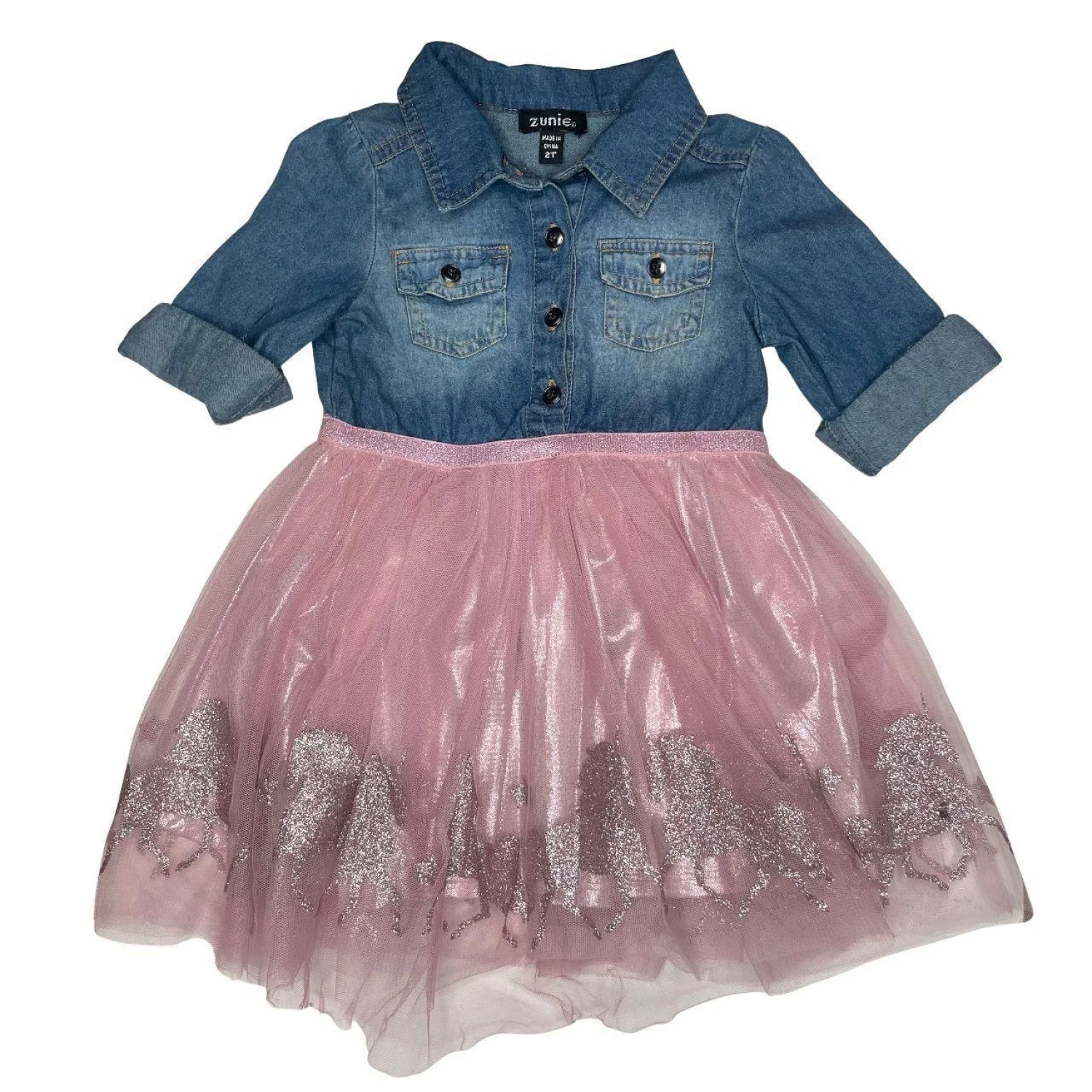 Zunie Girls Cotton Blend Denim & Pink Glitter Unicorn Tutu Dress - 2T Features: Adorable Zunie "twofer" dress featuring a button-down denim bodice with cuffed sleeves and a voluminous pink tulle skirt. The skirt is accented with a shimmering glitter unicorn/horse border and a metallic pink waistband. Perfect for birthday parties, school photos, or everyday princess play! • Style Profile: western, whimsical, fairycore, school, princess, cowgirl, boho, party, casual, dance, ballerina, unicorn, glitter, rustic, everyday, spring, boutique, toddler, denim, tulle • Flaws: No Holes, stains, or tears (Excellent pre-owned condition) Happy to answer your questions! Super Fast Shipper!