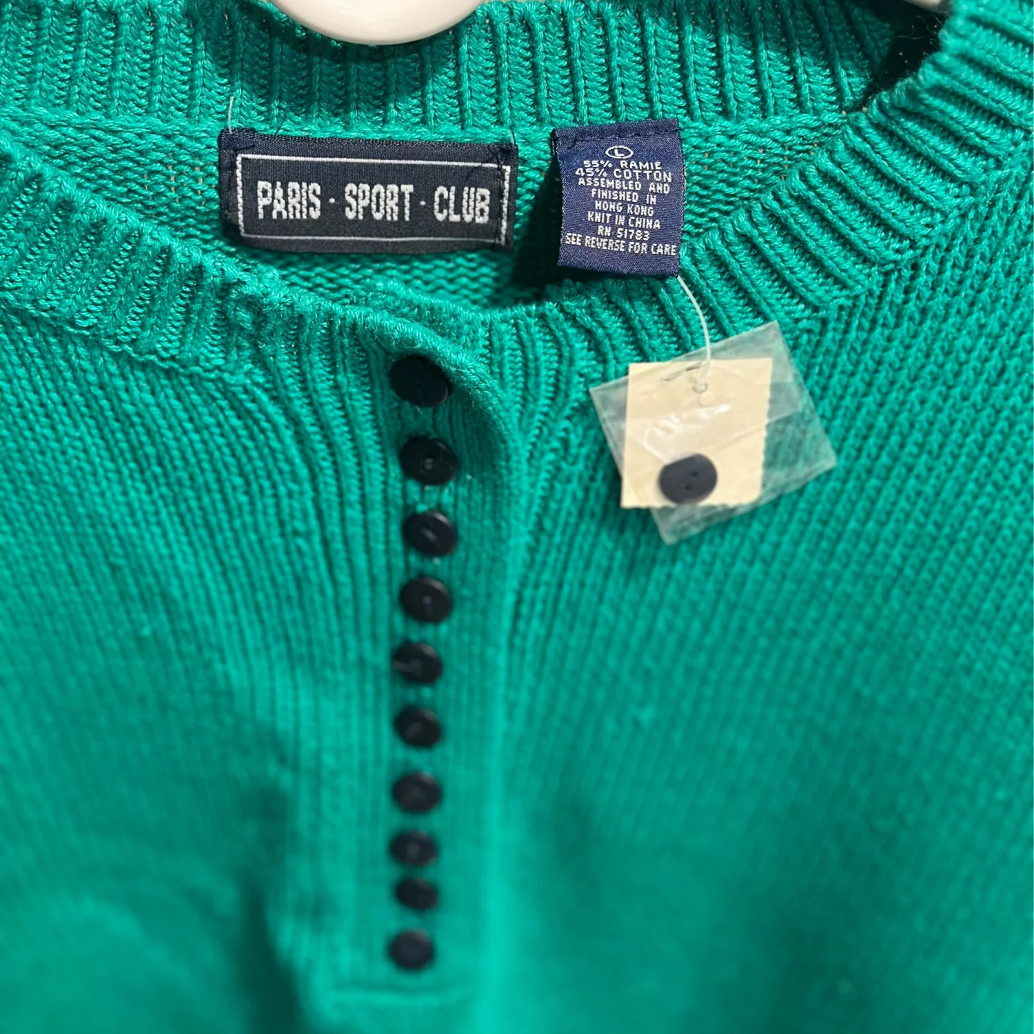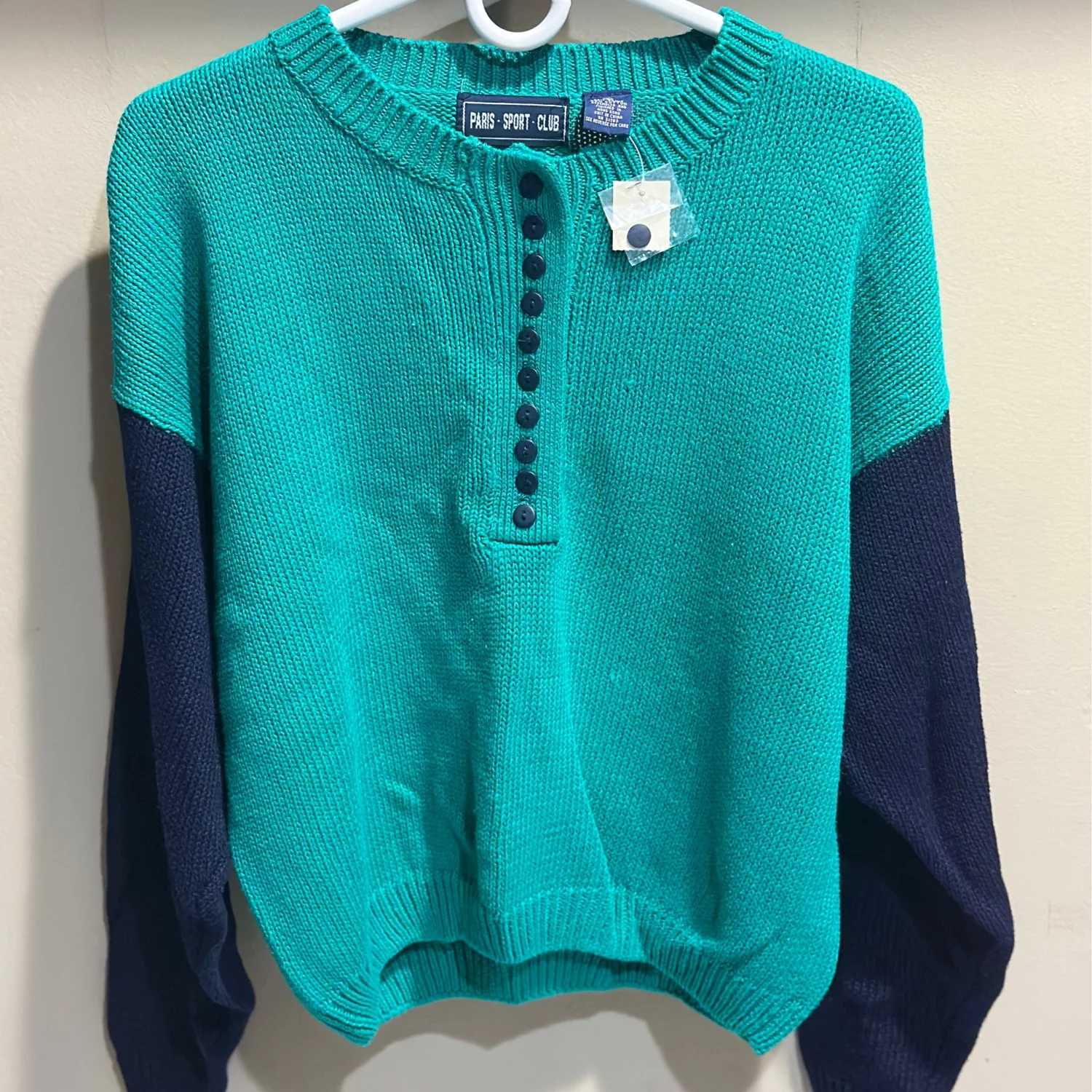 Vintage Paris Sport Club sweater featuring a vibrant teal body with contrasting navy sleeves. The sweater has a henley neckline with decorative navy buttons and ribbed knit cuffs. Perfect for a casual yet stylish look. The sweater is made from 100% acrylic for a comfortable and cozy fit. Brand new with tags and an extra button included. Ideal for a throwback casual style. #vintage #casual #cozy