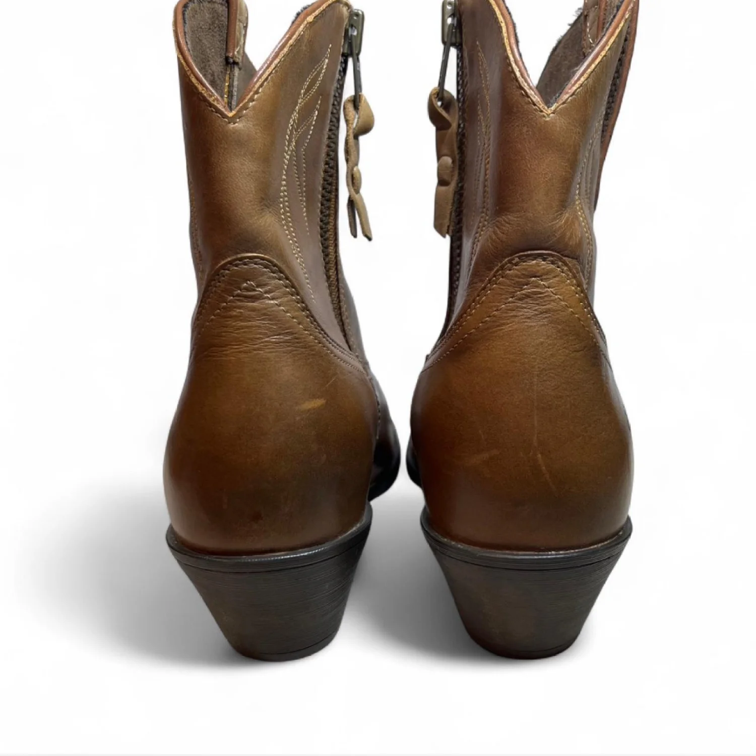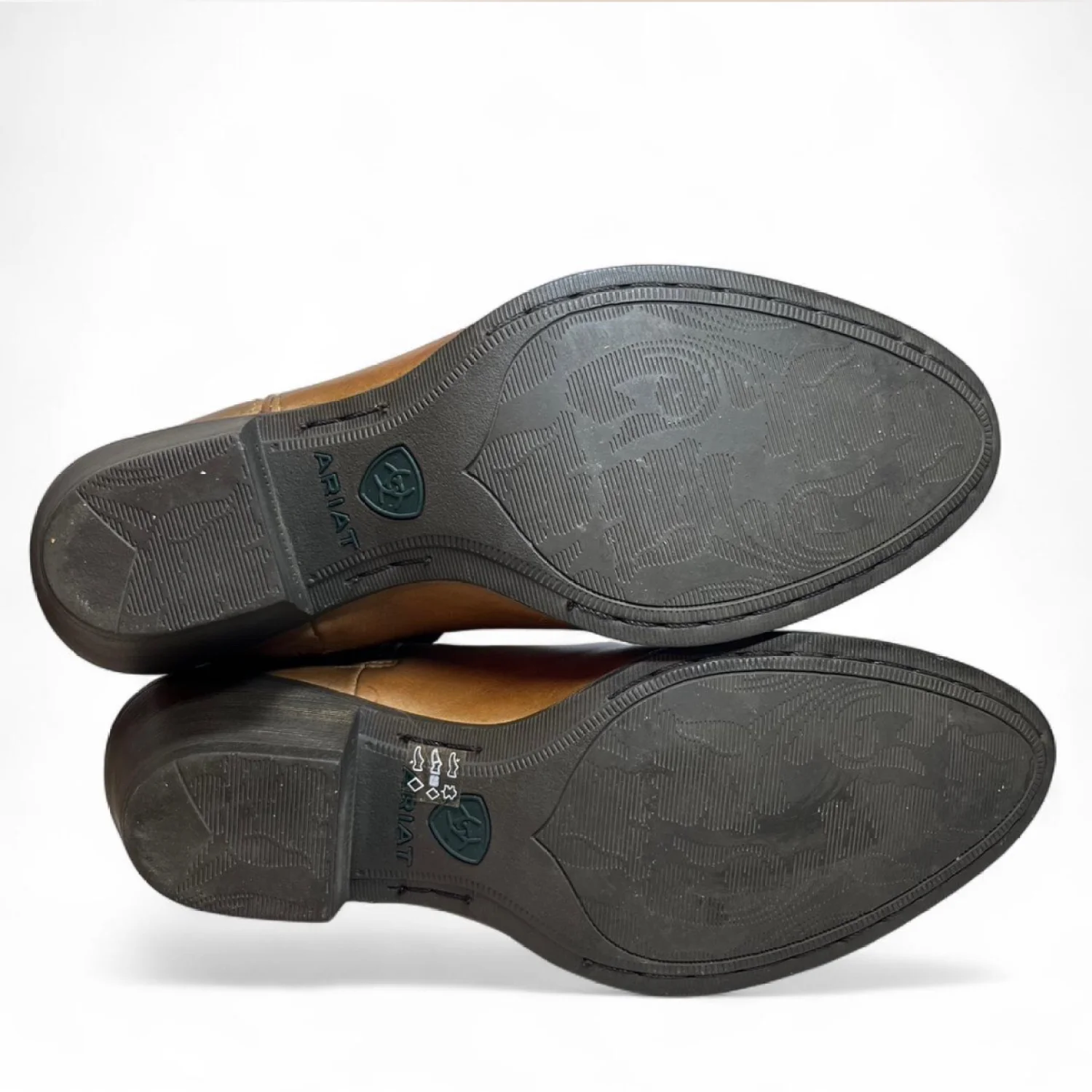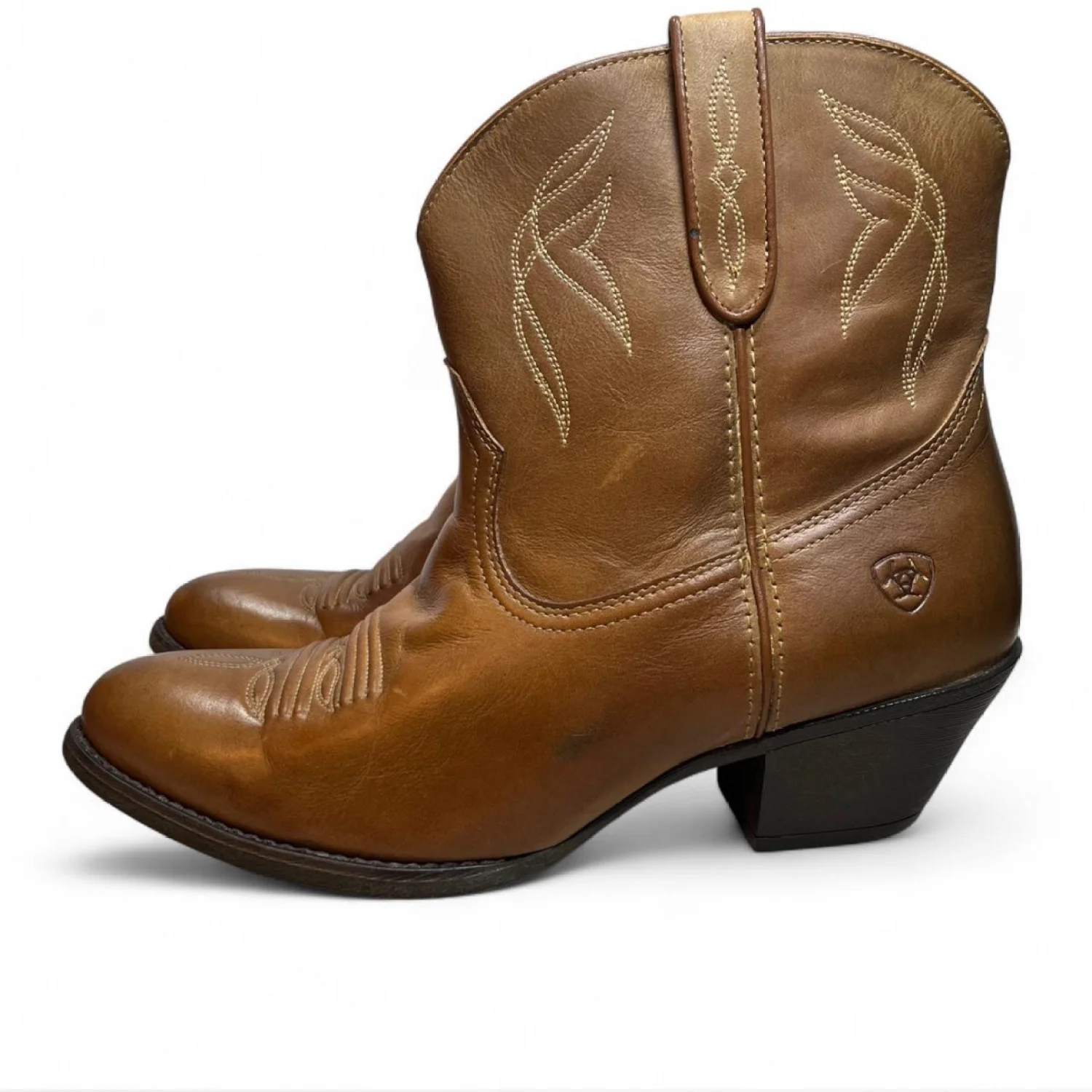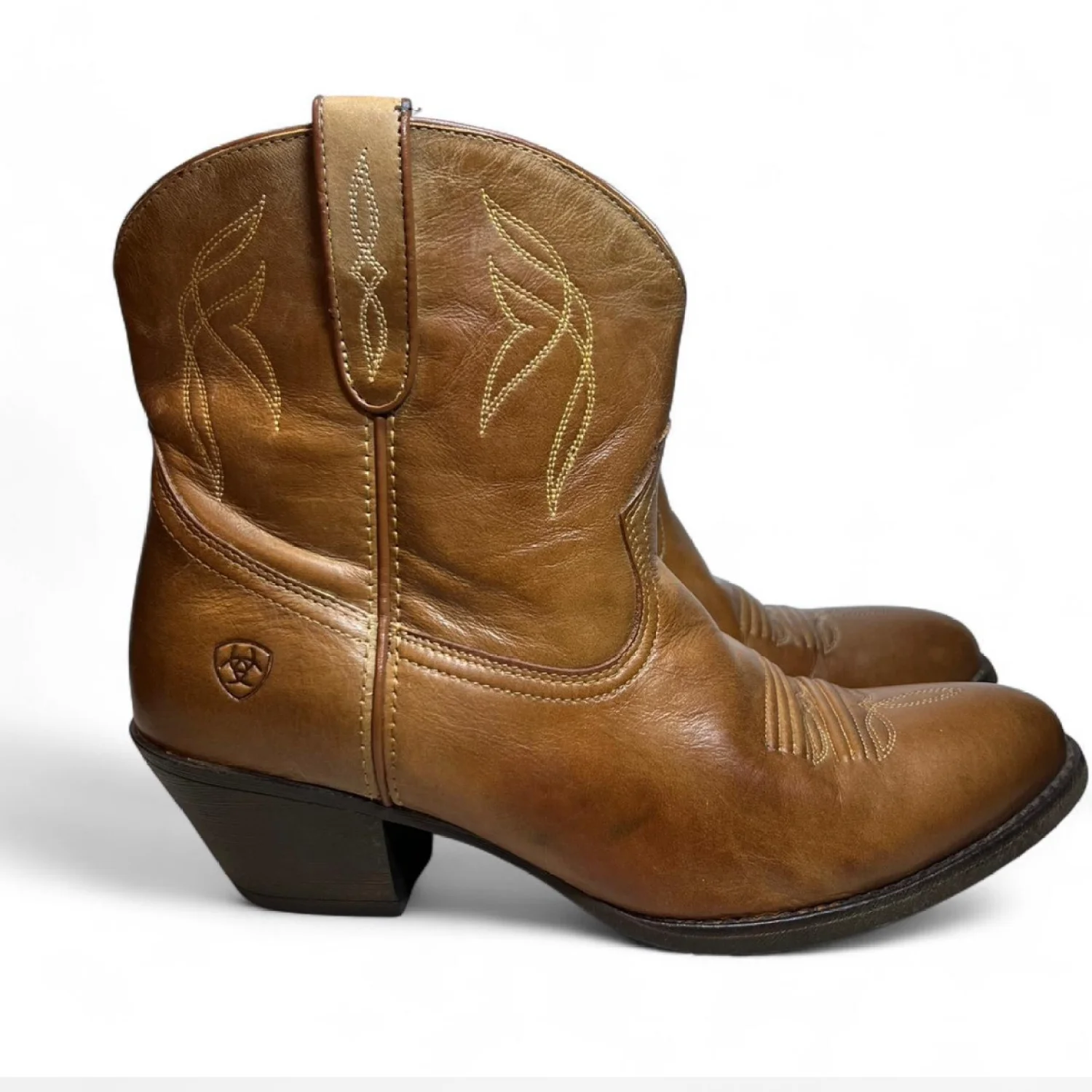 Ariat Darlin Western Boots Details: • Brand: Ariat • Style: Heritage Western Ankle Boots (Style 10017323) • Color: Tan / Light Brown • Size: Women's 9.5 B • Heel height: approx. 2" • Leather upper with manmade balance • Condition: Pre-owned with some scuffing on toes and stains on sides, soles in excellent condition western boots, leather ankle boots, tan cowboy boots, heritage style, pointed toe, stacked heel, distressed leather, slip-on boots, country footwear, western fashion