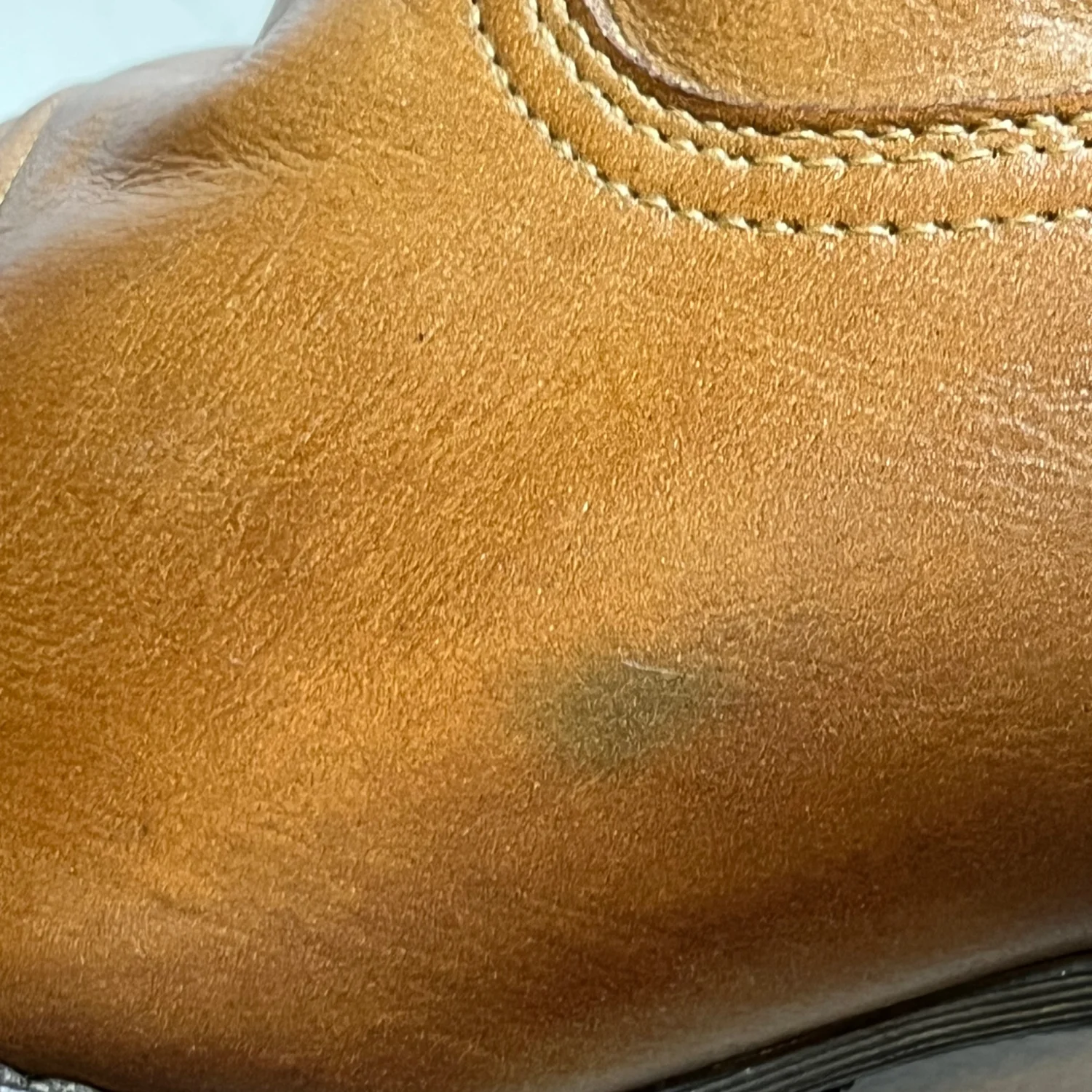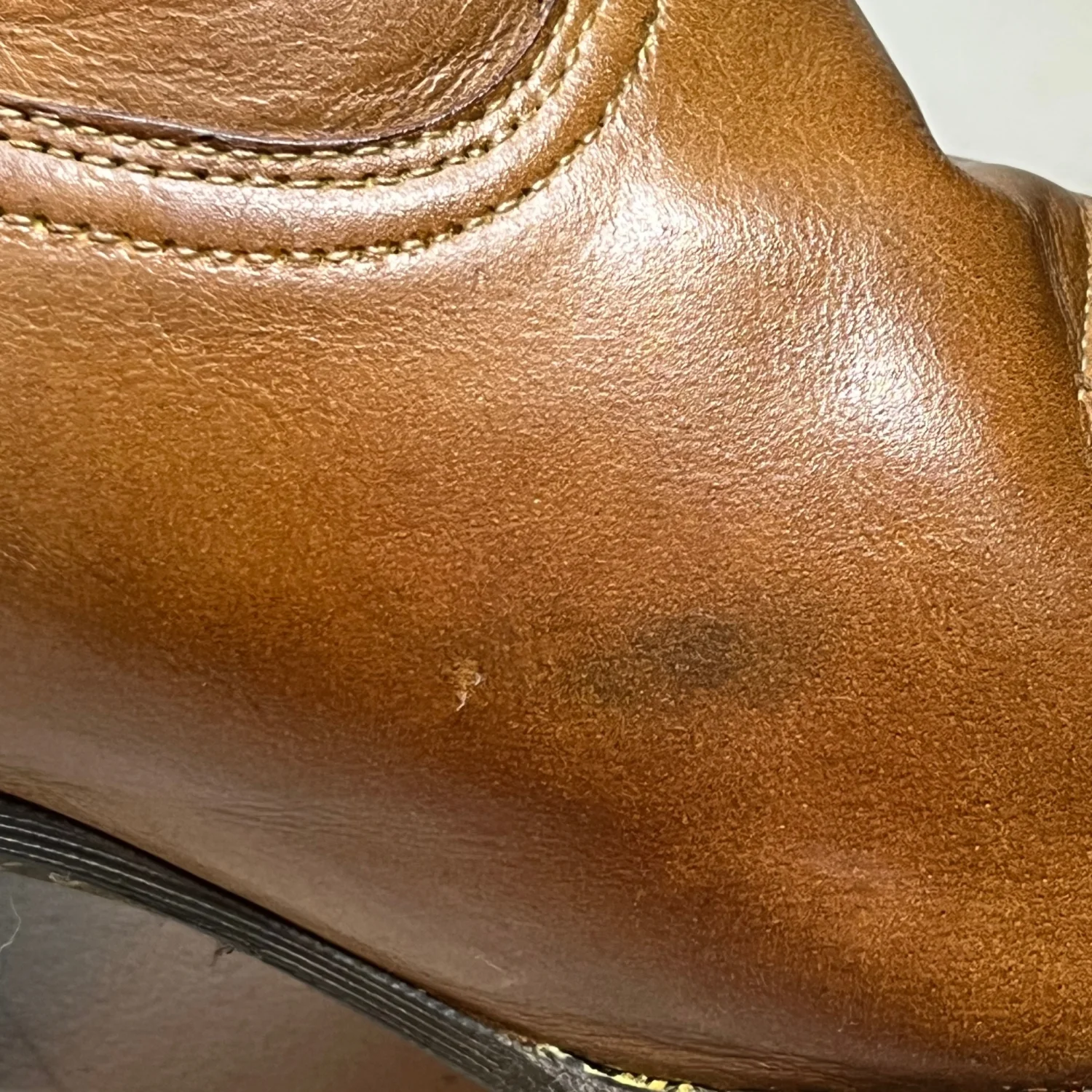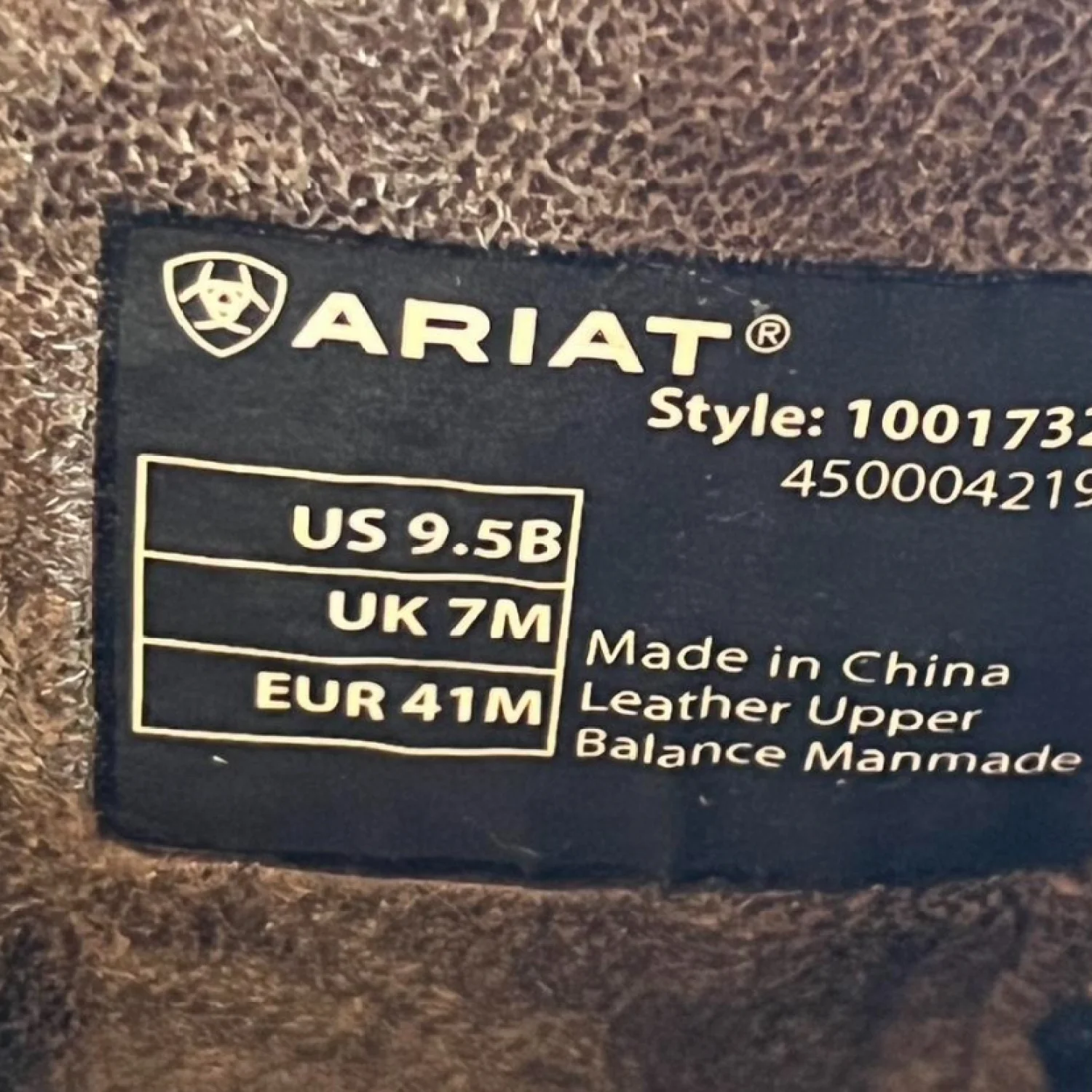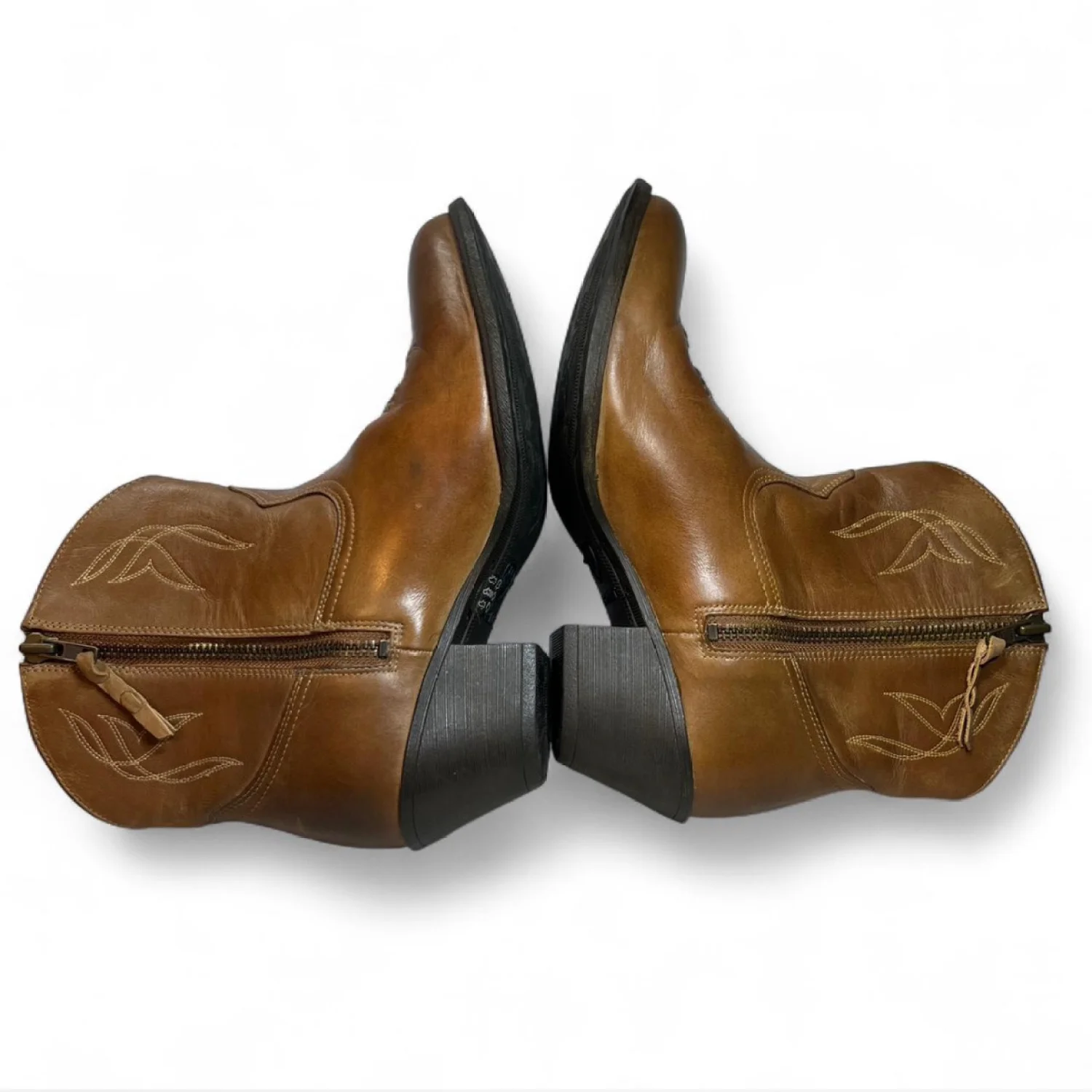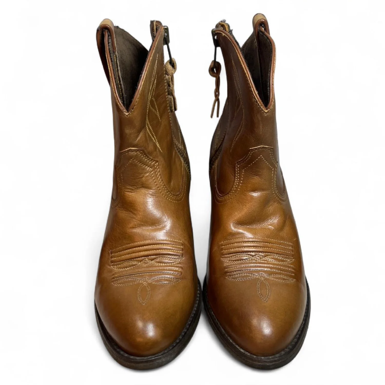 Ariat Darlin Western Boots Details: • Brand: Ariat • Style: Heritage Western Ankle Boots (Style 10017323) • Color: Tan / Light Brown • Size: Women's 9.5 B • Heel height: approx. 2" • Leather upper with manmade balance • Condition: Pre-owned with some scuffing on toes and stains on sides, soles in excellent condition western boots, leather ankle boots, tan cowboy boots, heritage style, pointed toe, stacked heel, distressed leather, slip-on boots, country footwear, western fashion