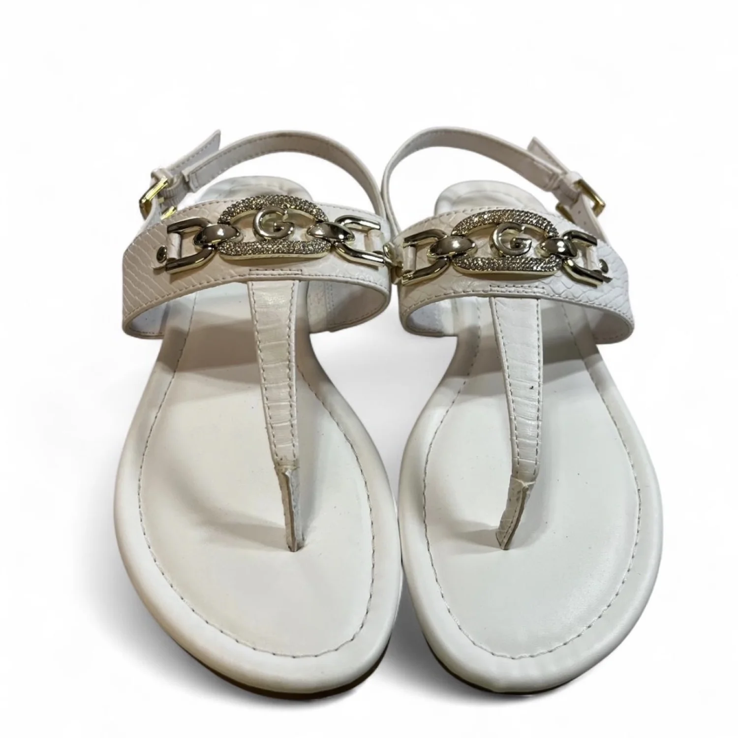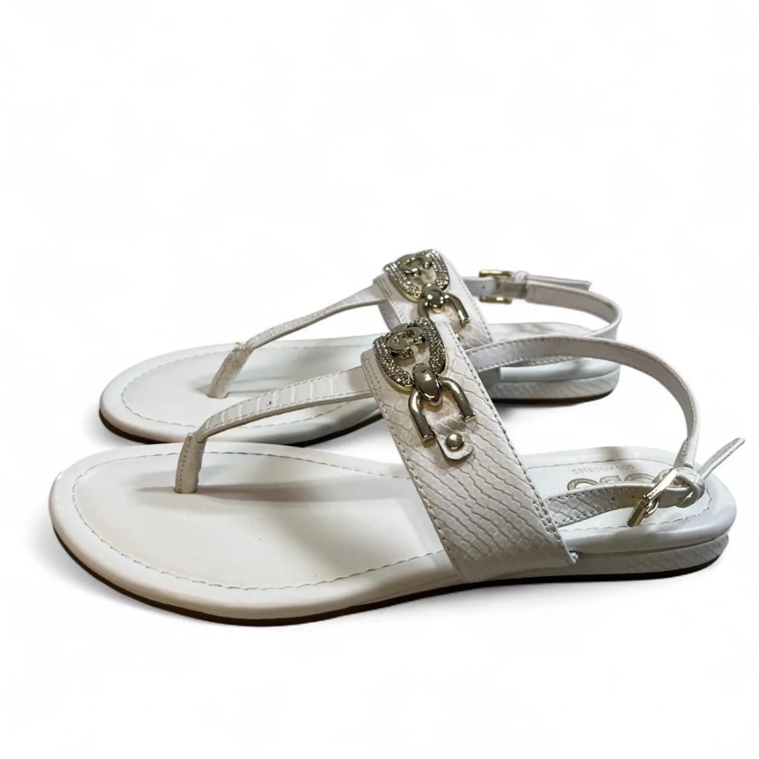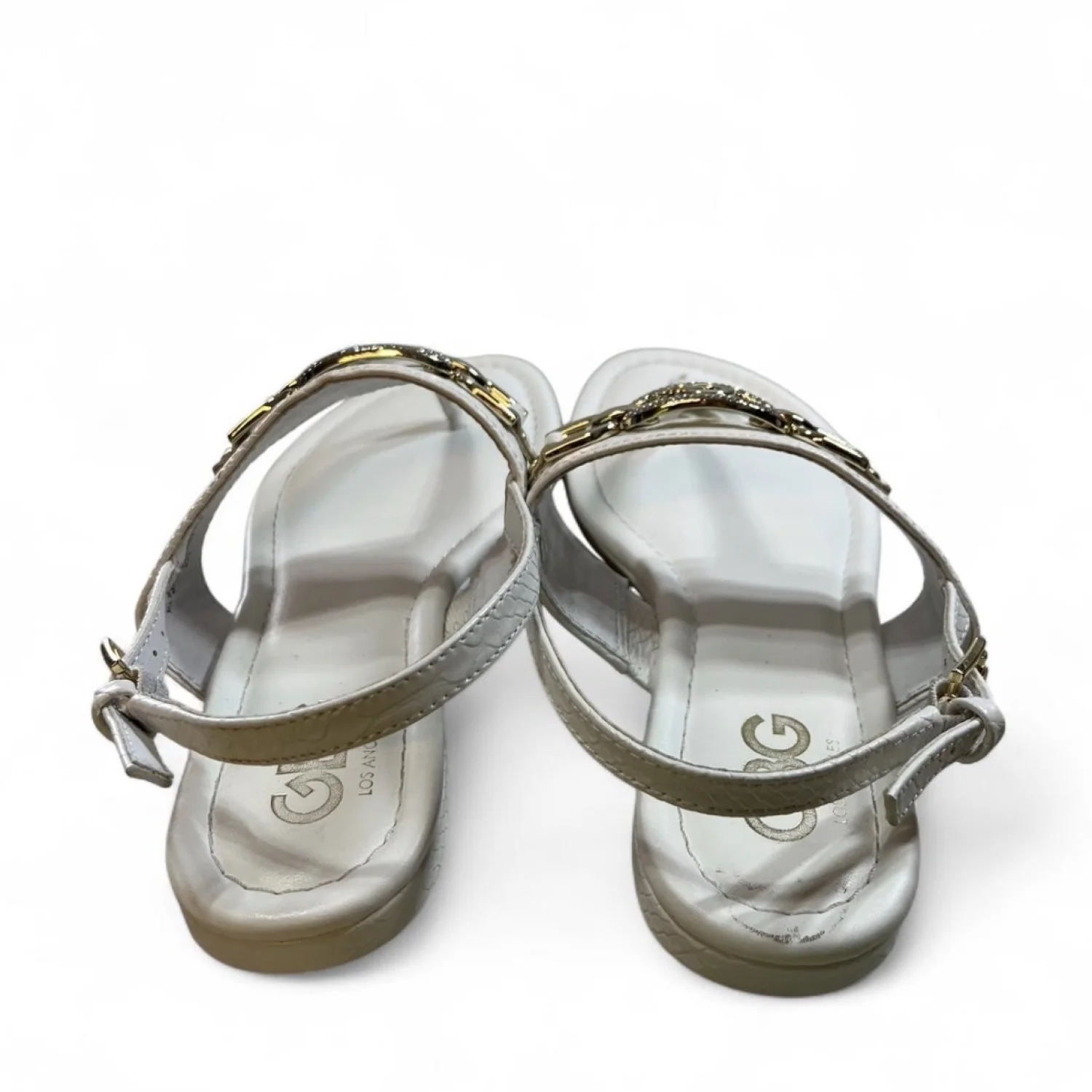 GBG Los Angeles White leather sandals with gold hardware, featuring a strappy design Gently Used Women’s Size 7 #glamour #beachy white leather, gold hardware, strappy sandals, minimalistic, summer footwear, casual chic, comfortable, versatile, slip-on, elegant