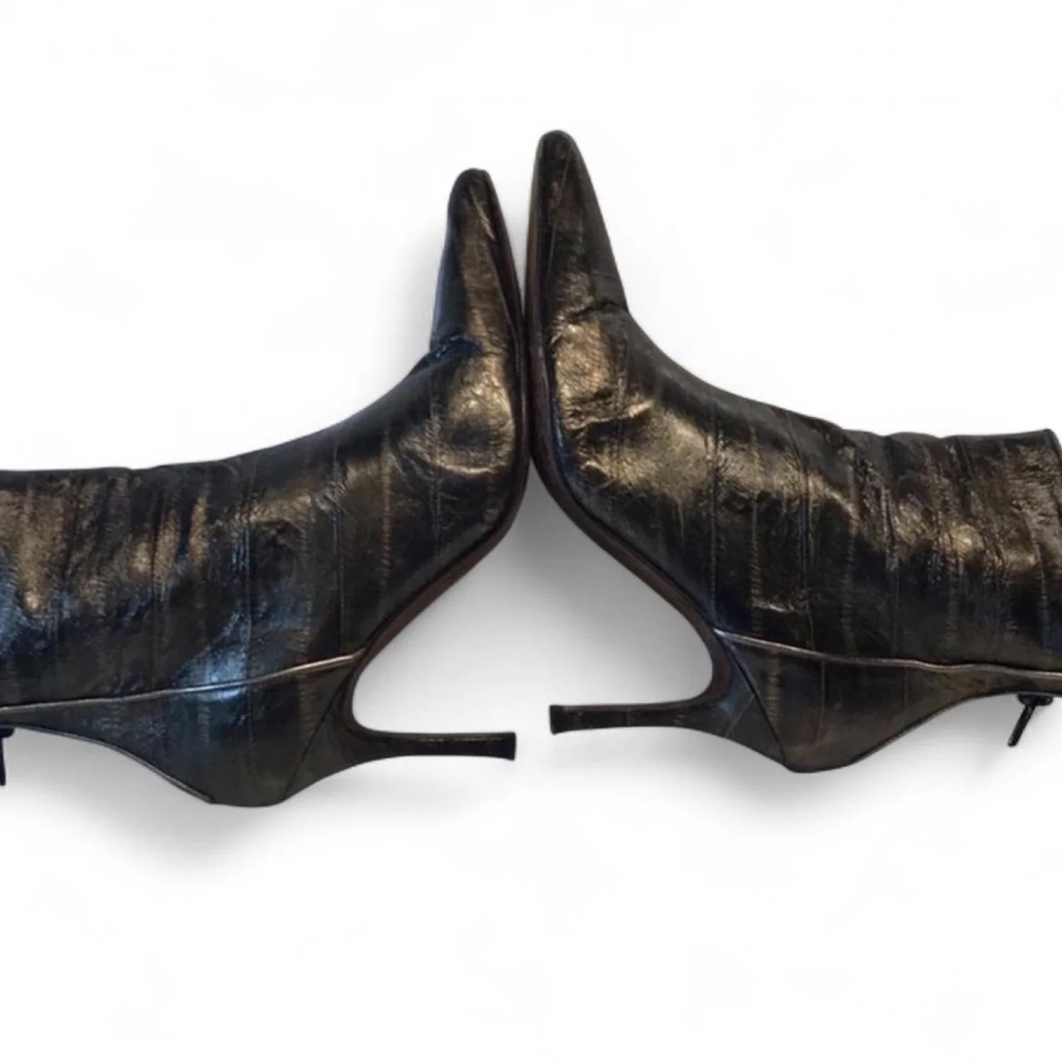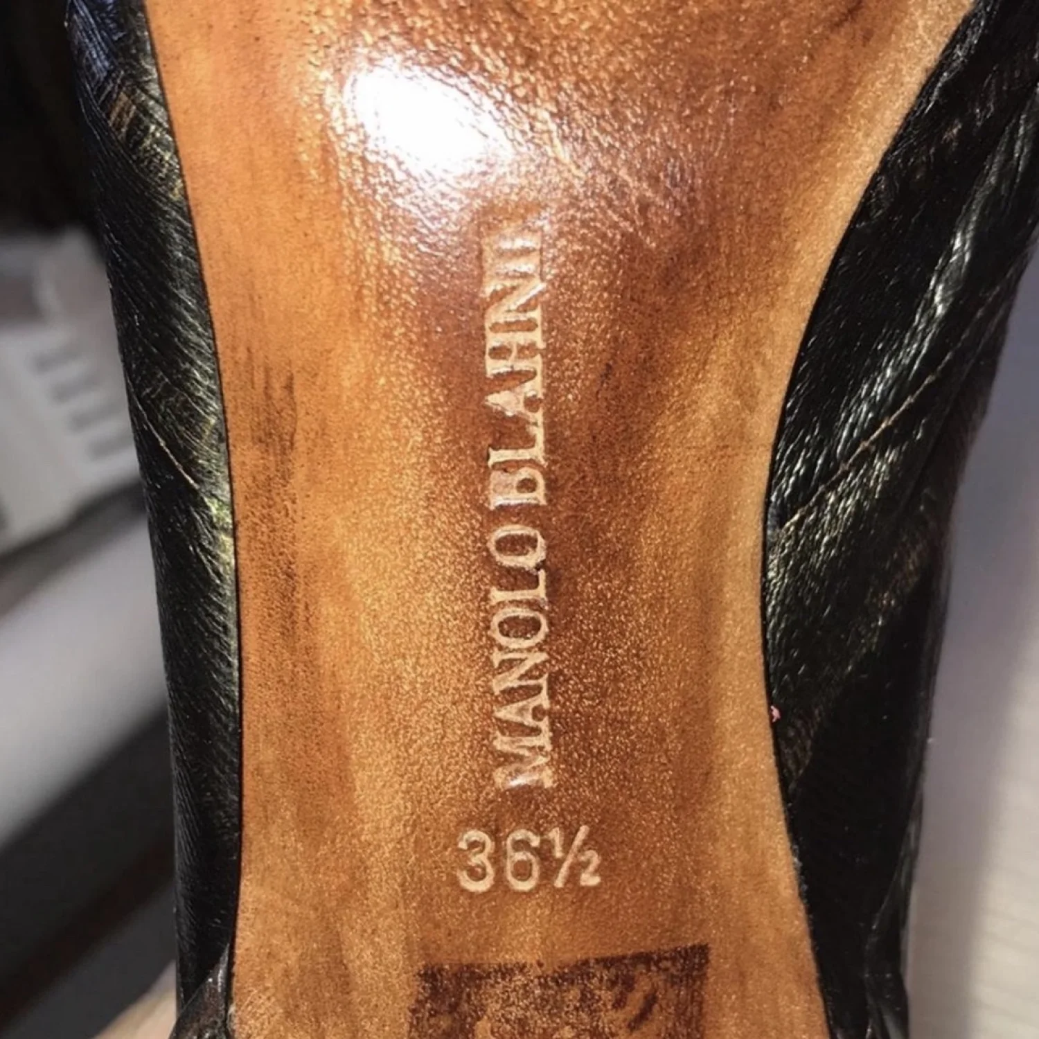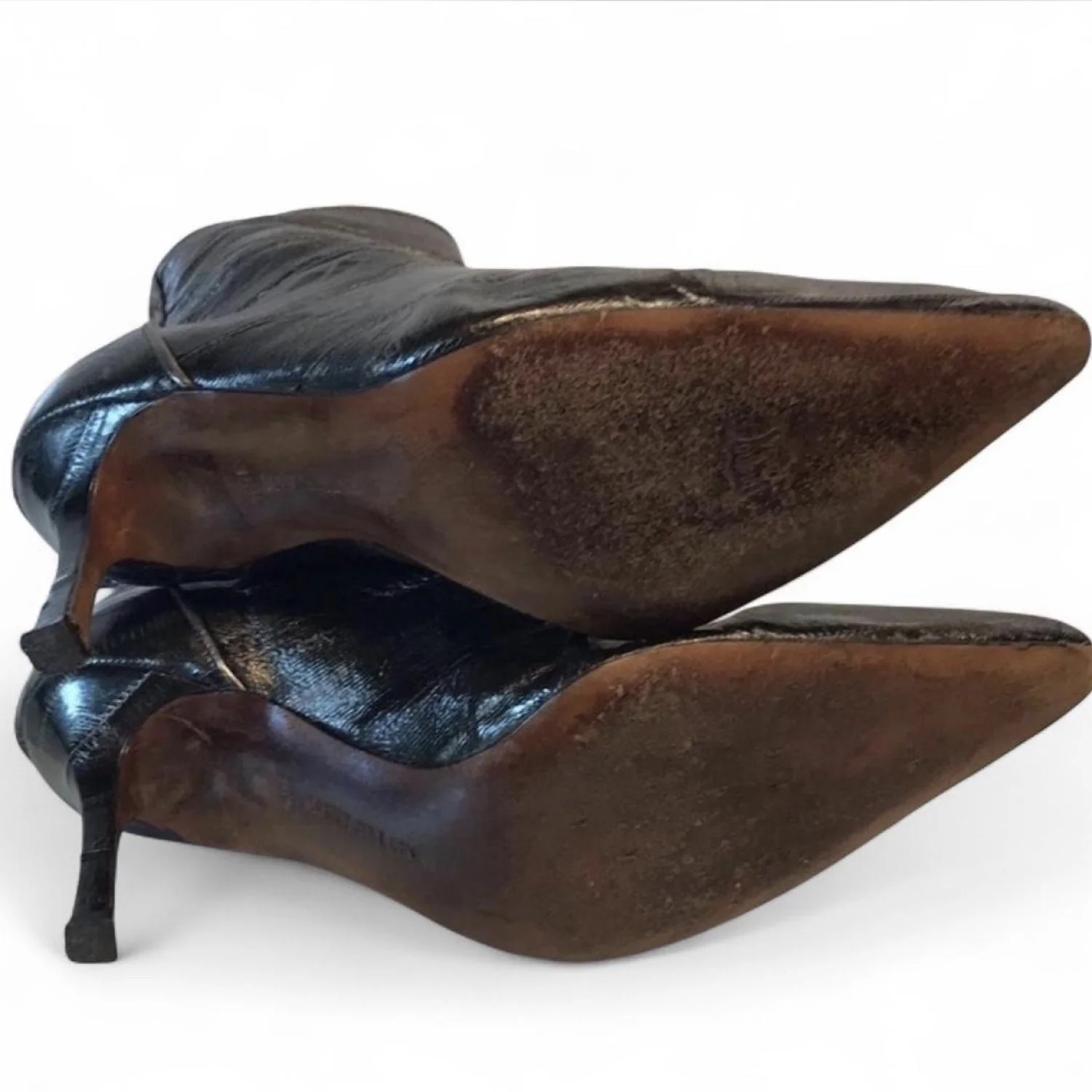 Black leather Manolo Blahnik boots with pointed toe and 4.5" heel #glamourboots Manolo Blahnik Black & Gold striped metallic leather booty Good Used Condition see photos Zipper in the back Women’s Size 36.5 Fast Shipping Questions? Leave a comment below!