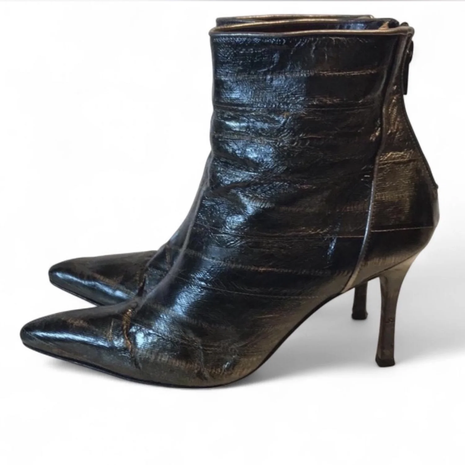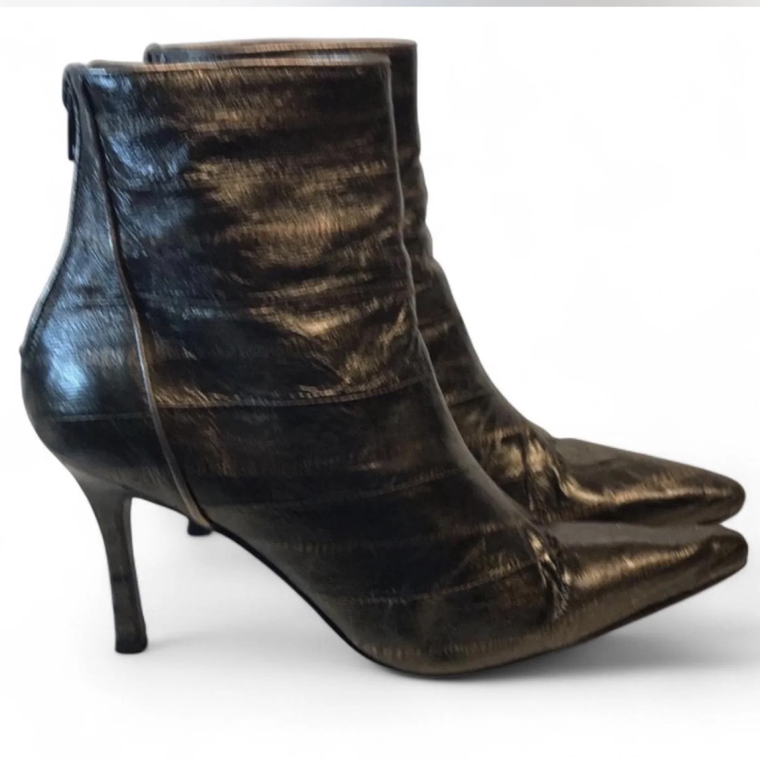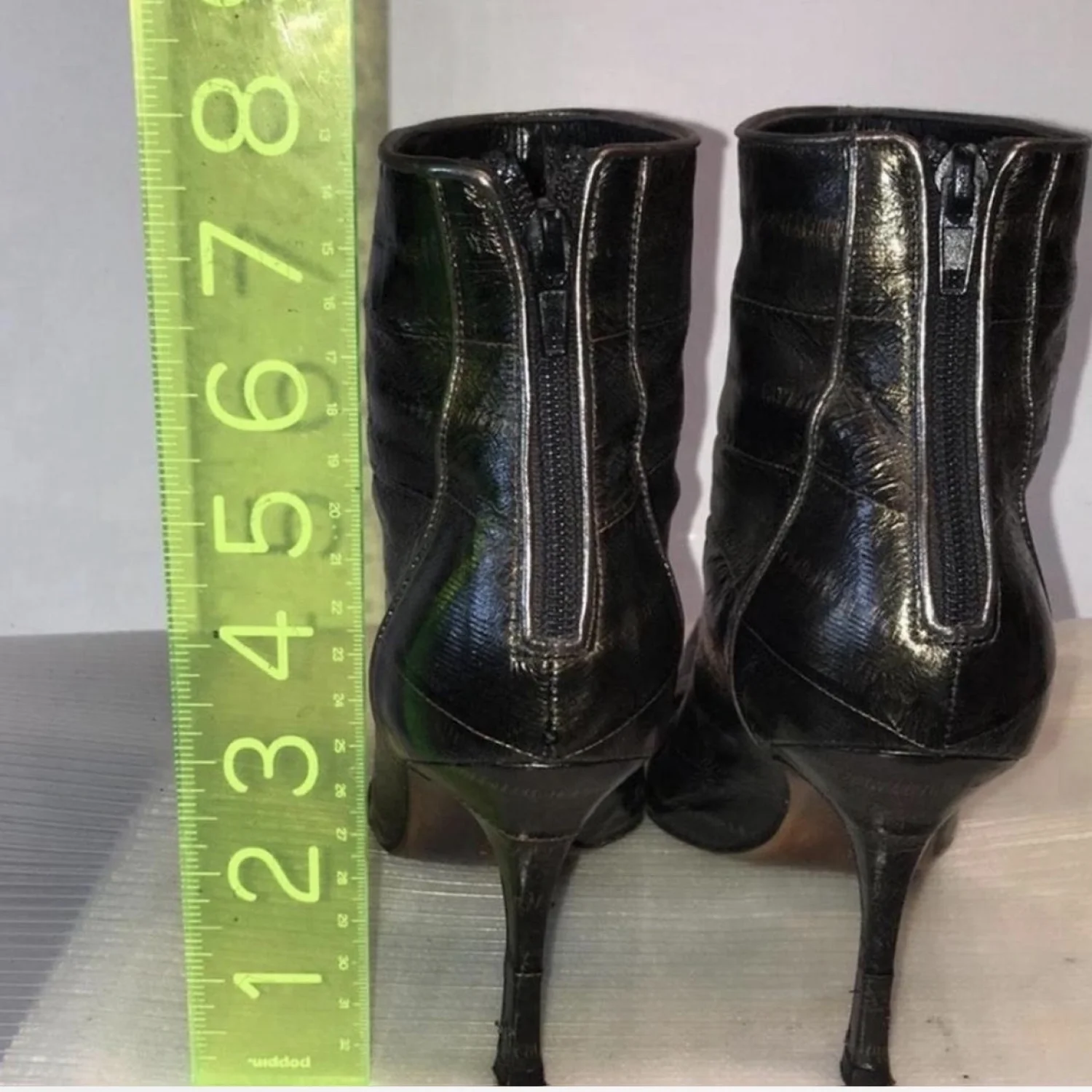 Black leather Manolo Blahnik boots with pointed toe and 4.5" heel #glamourboots Manolo Blahnik Black & Gold striped metallic leather booty Good Used Condition see photos Zipper in the back Women’s Size 36.5 Fast Shipping Questions? Leave a comment below!