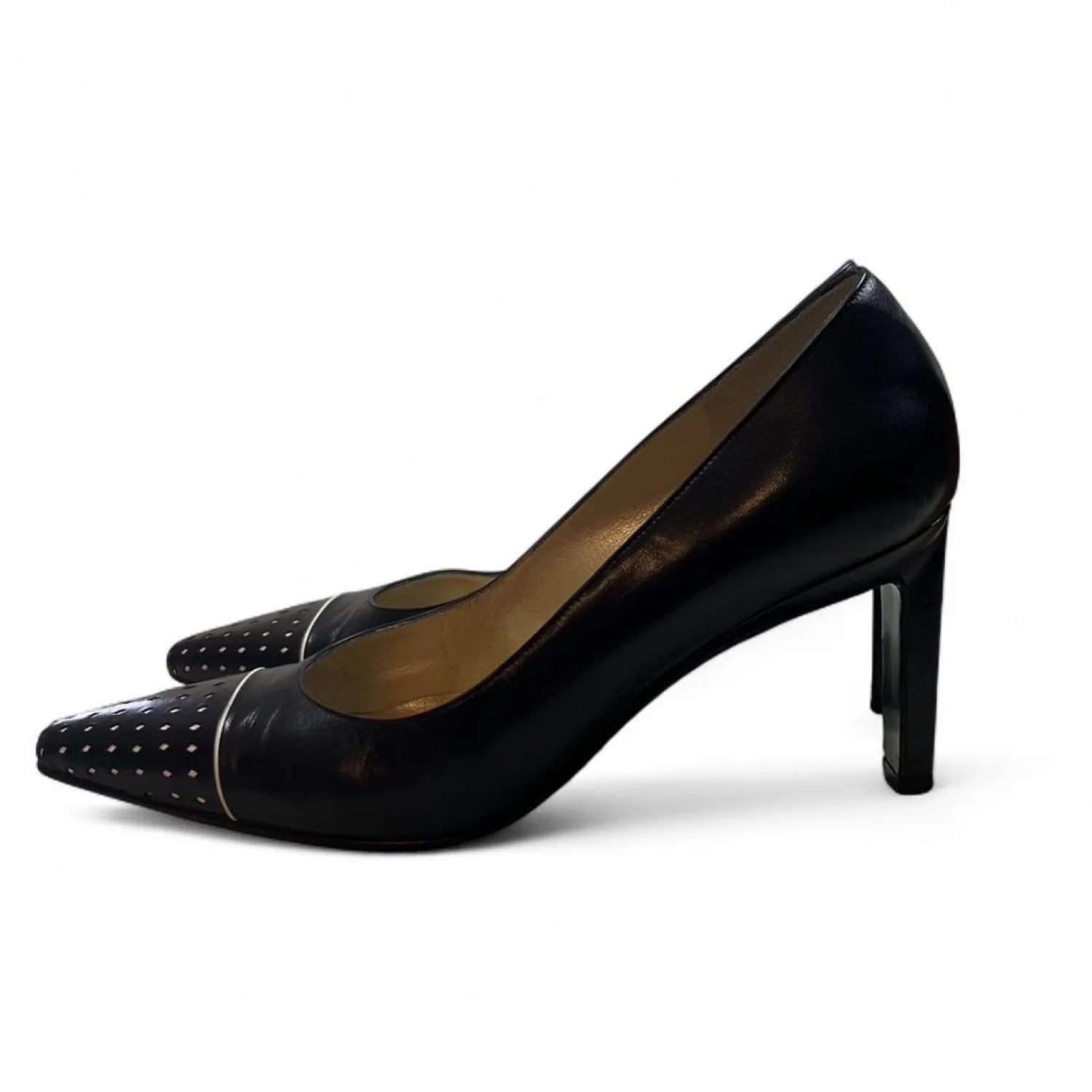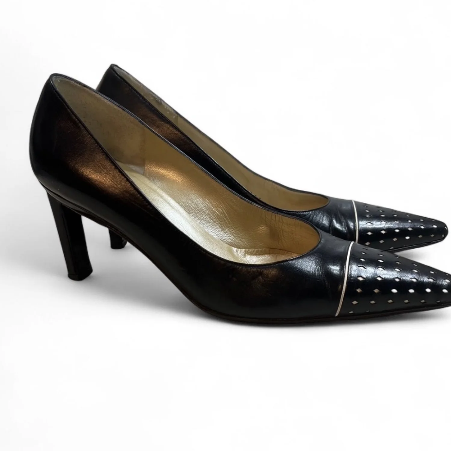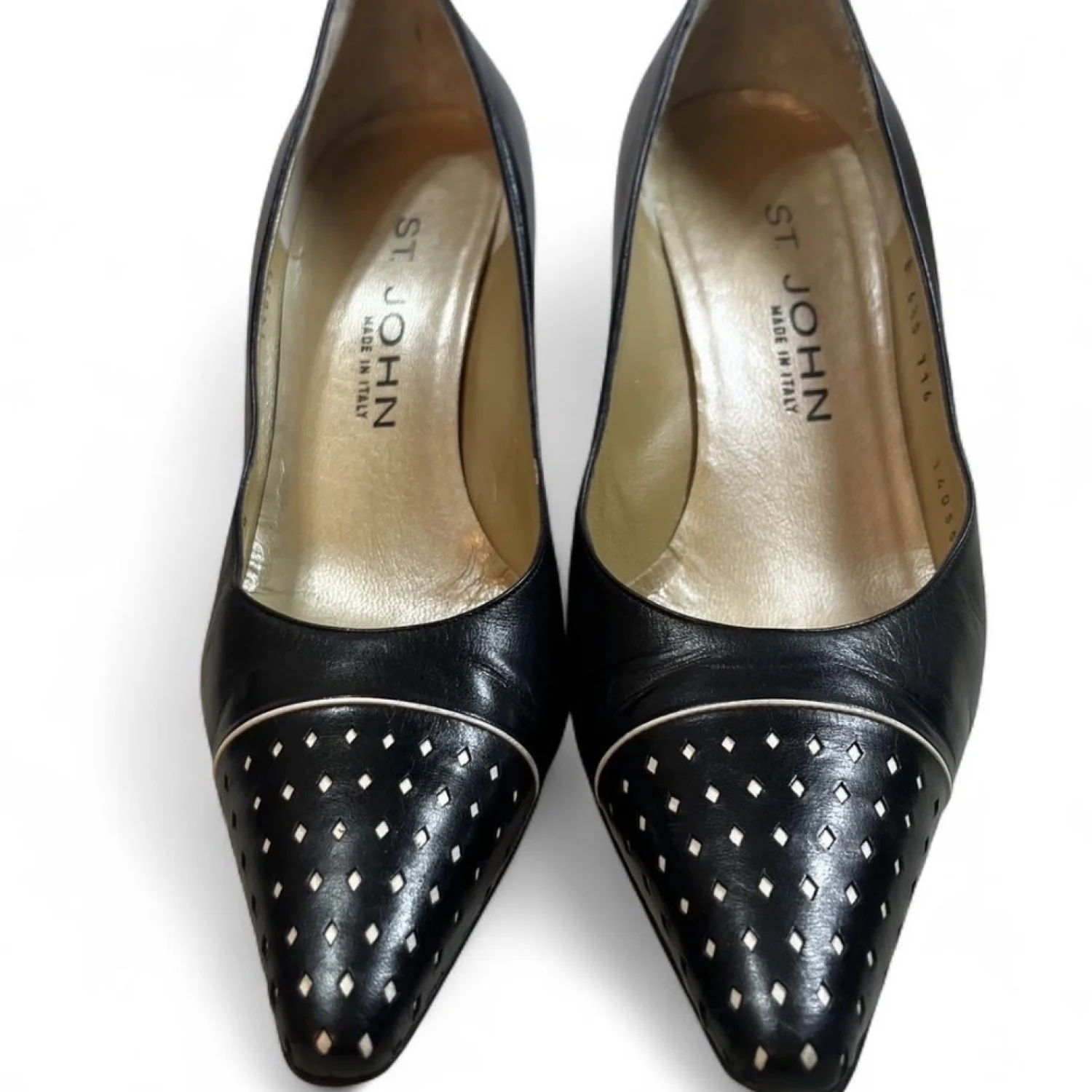 St John’s Black leather pointed toe heels with diamond shaped designs on toes. 3”heels gently Used Women’s Size 6.5 #glamour black leather, pointed toe, diamond pattern, stiletto heels, 3 inch heels, formal footwear, women's pumps, elegant shoes, dressy heels, sophisticated style