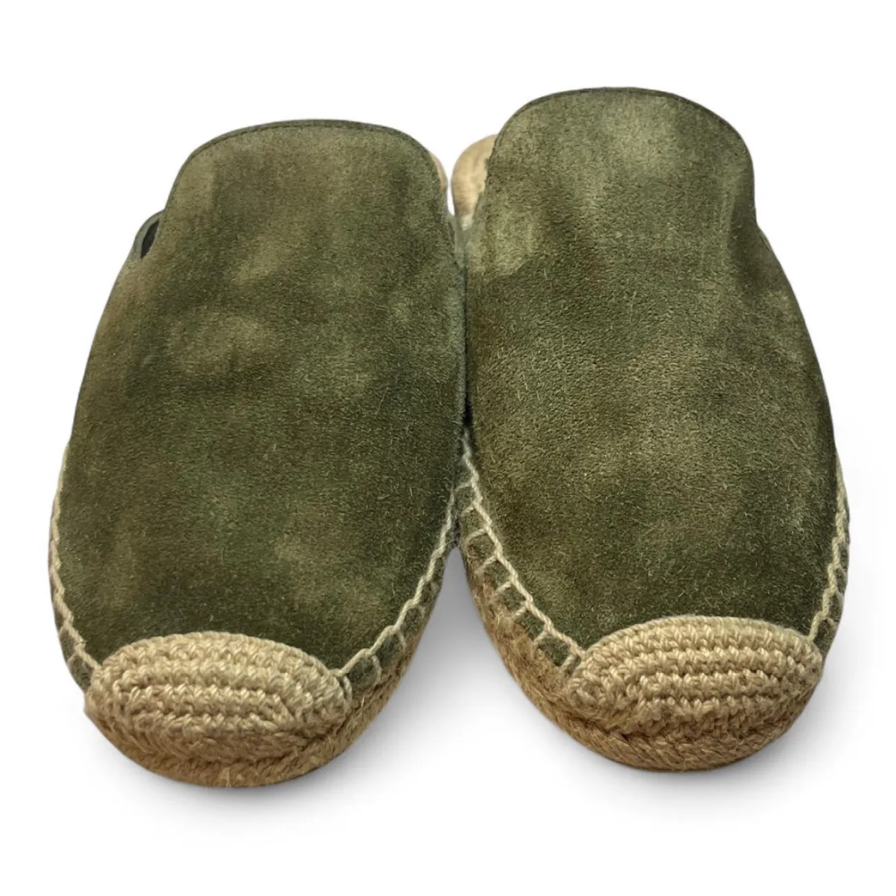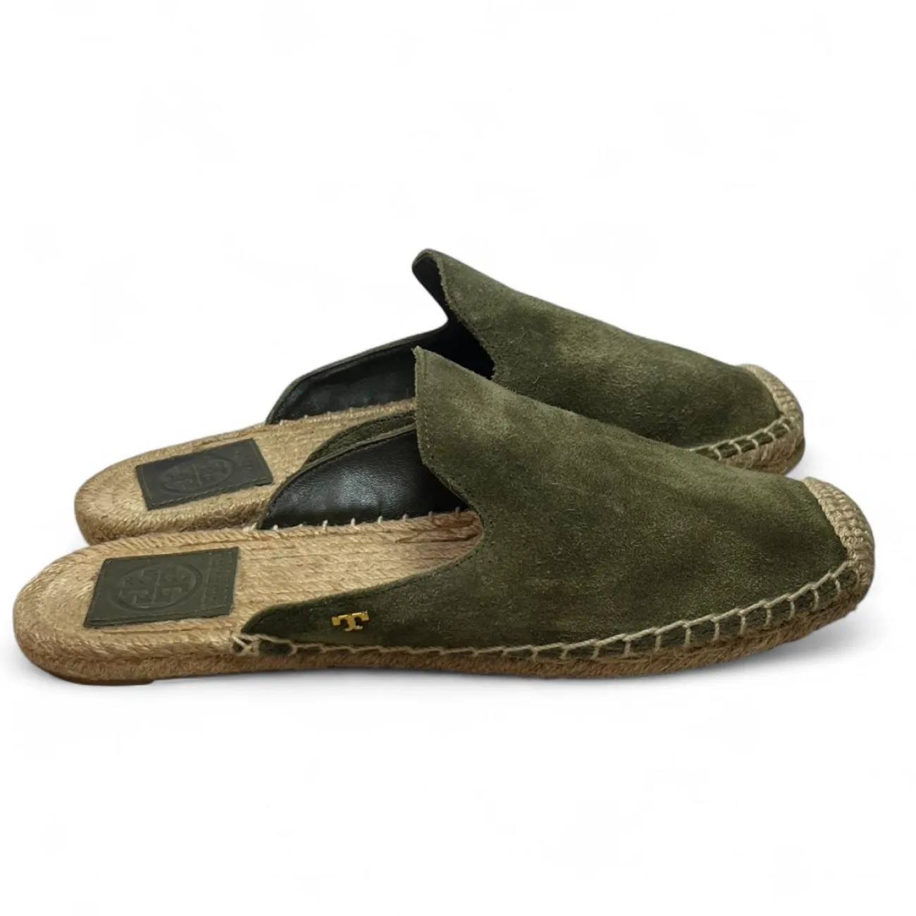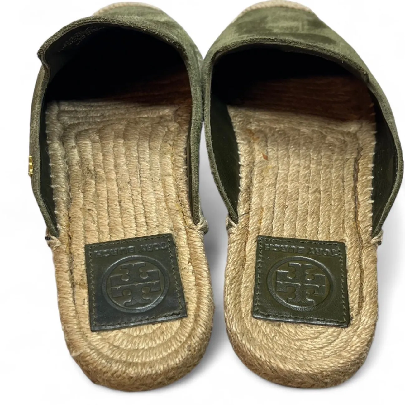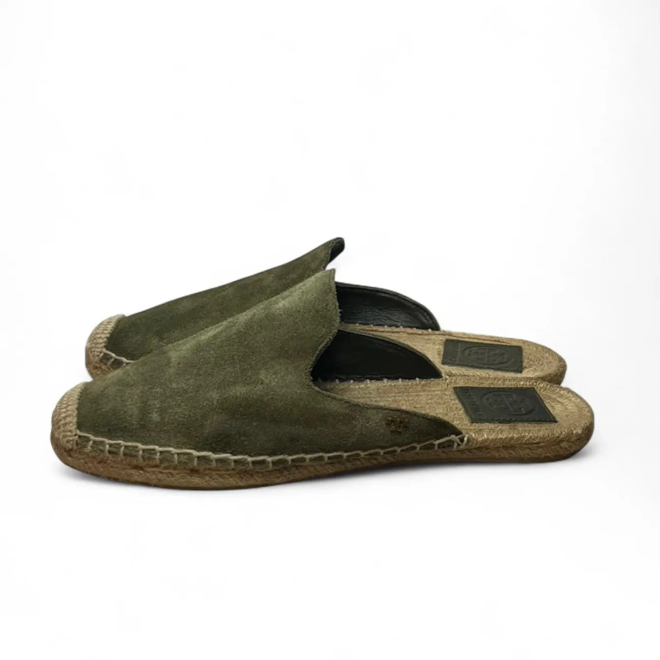 Tory Burch Green suede espadrille slip-on loafers with a boho touch scuffs on side #boho olive green, suede, espadrille, slip-on, loafers, boho-inspired, scuffed, flat, casual, slip-on shoes