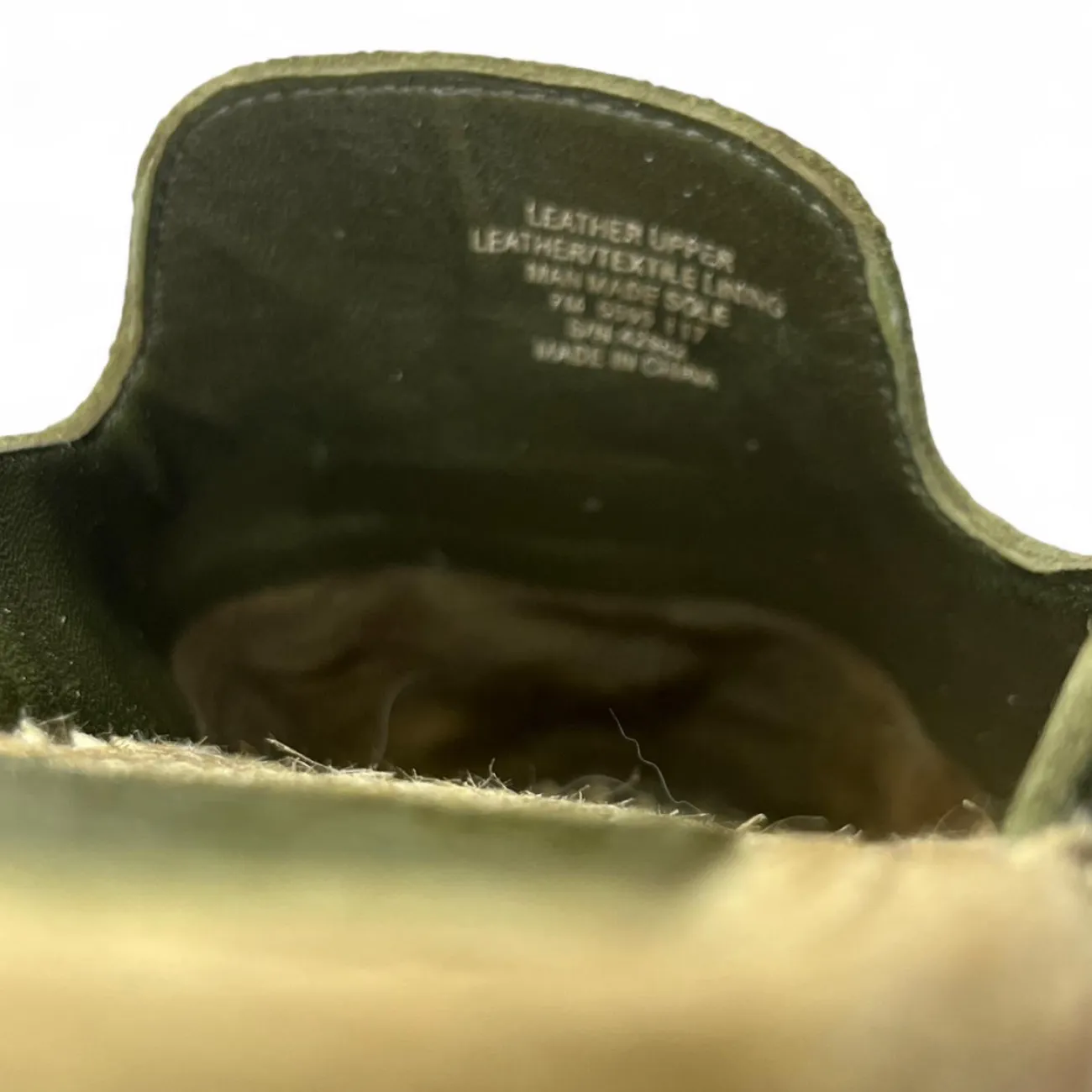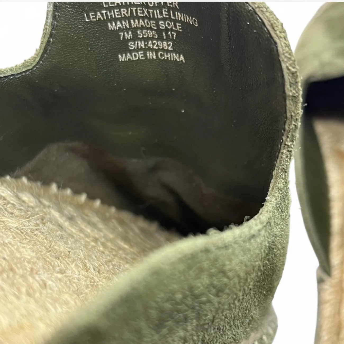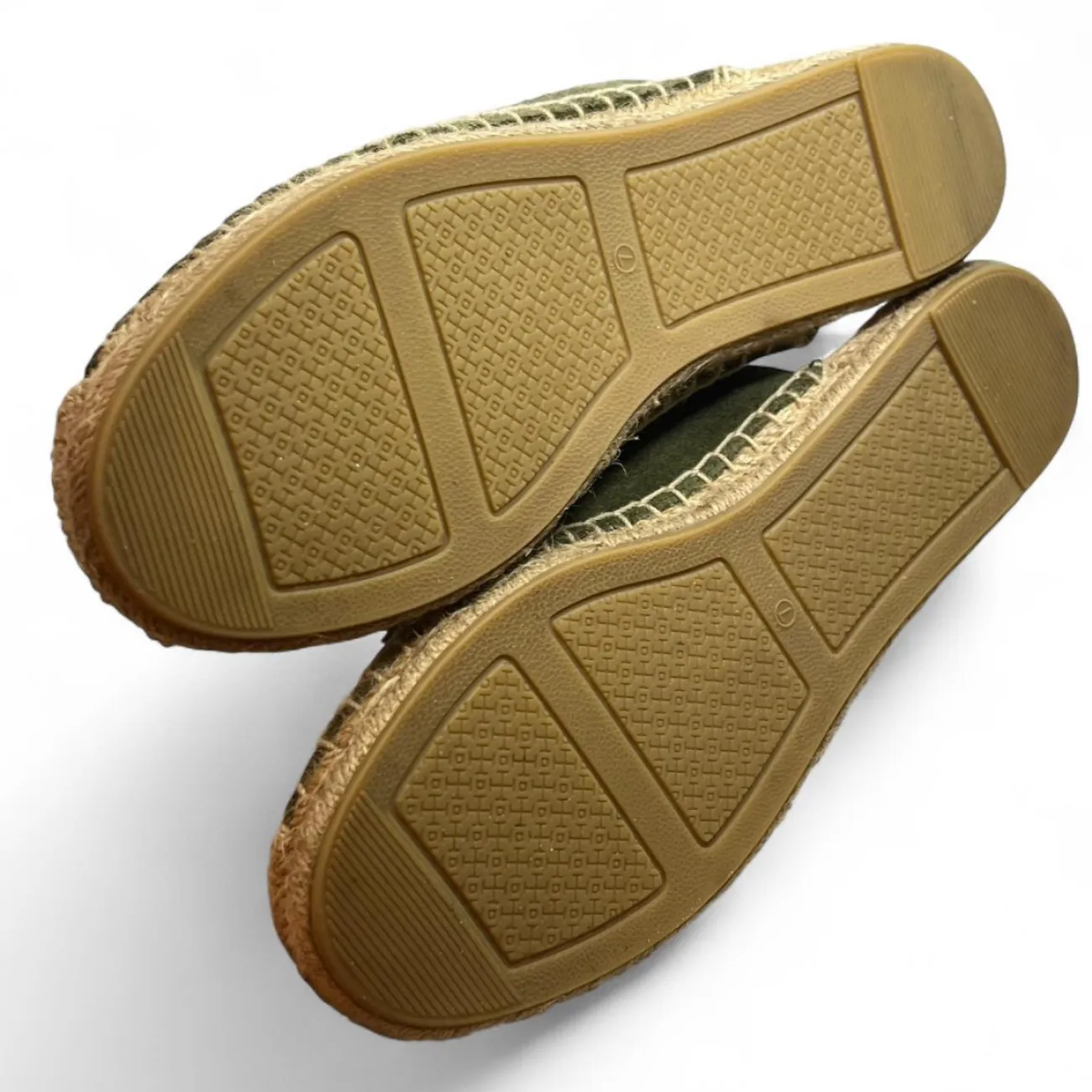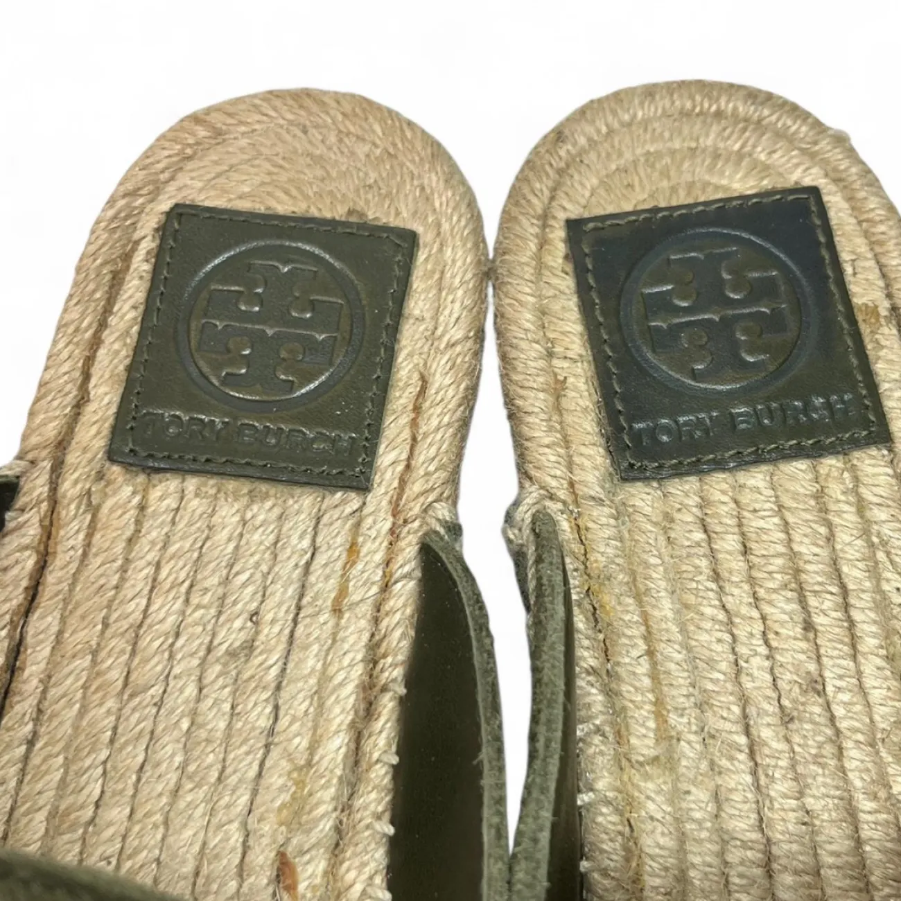 Tory Burch Green suede espadrille slip-on loafers with a boho touch scuffs on side #boho olive green, suede, espadrille, slip-on, loafers, boho-inspired, scuffed, flat, casual, slip-on shoes